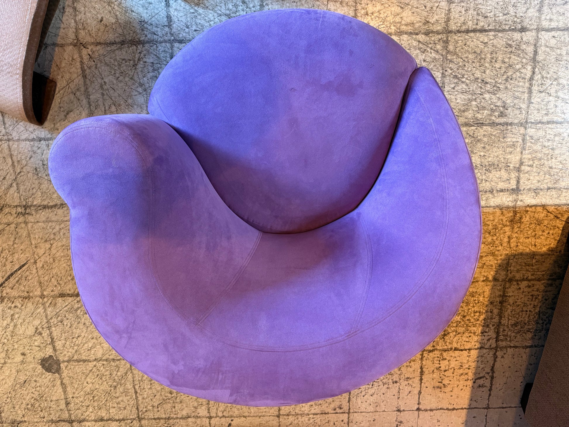 Vintage postmodern asymmetric lavender swivel lounge chair in the style of Vladimir Kagan's Nautilus design. Purple soft micro suede material. In good condition.