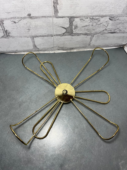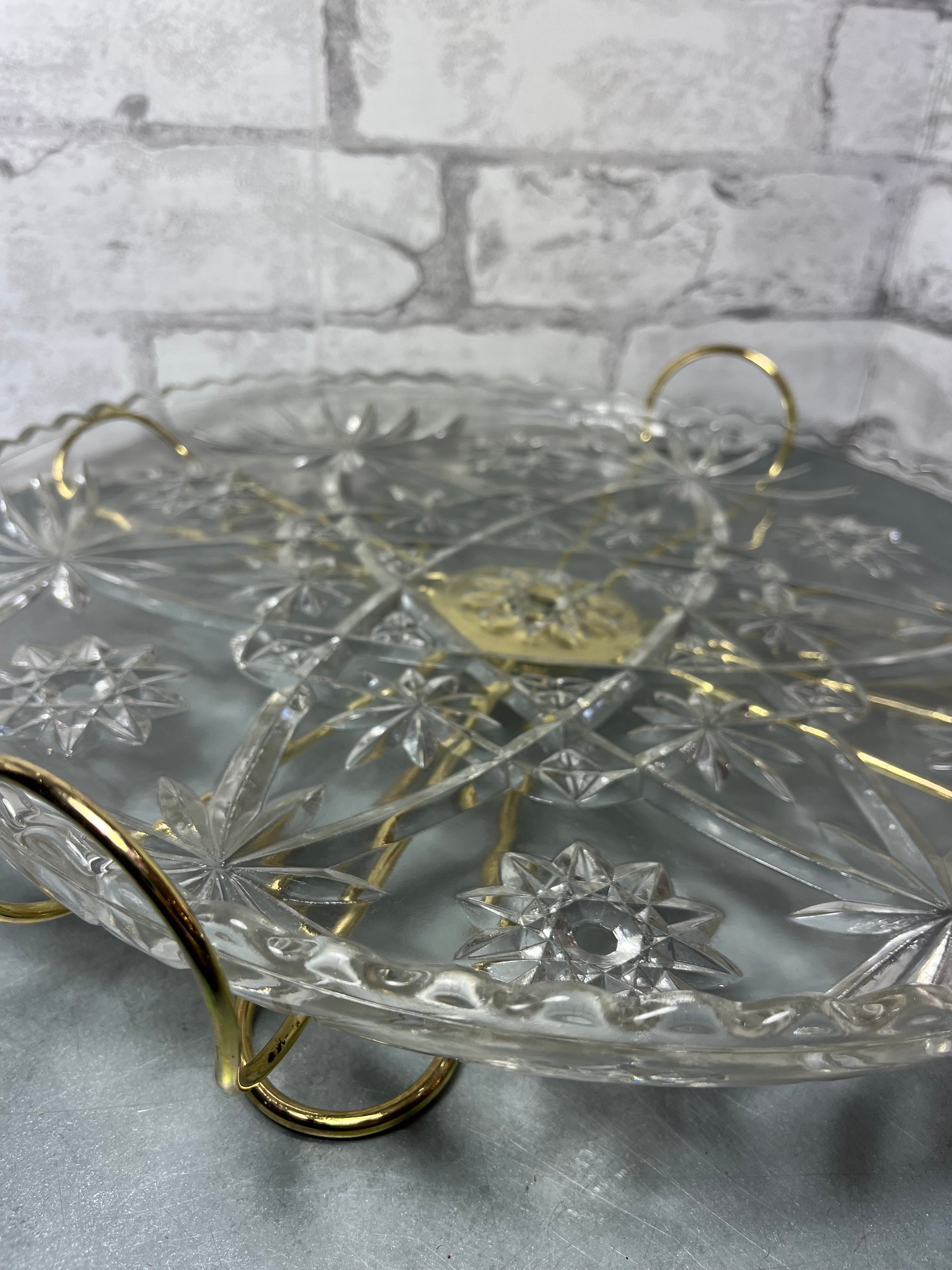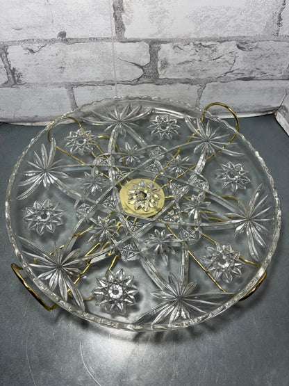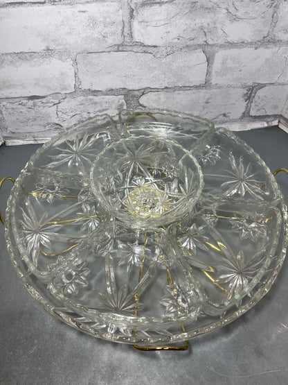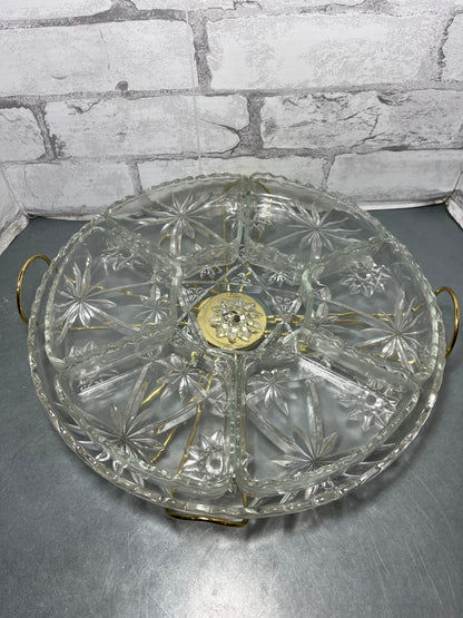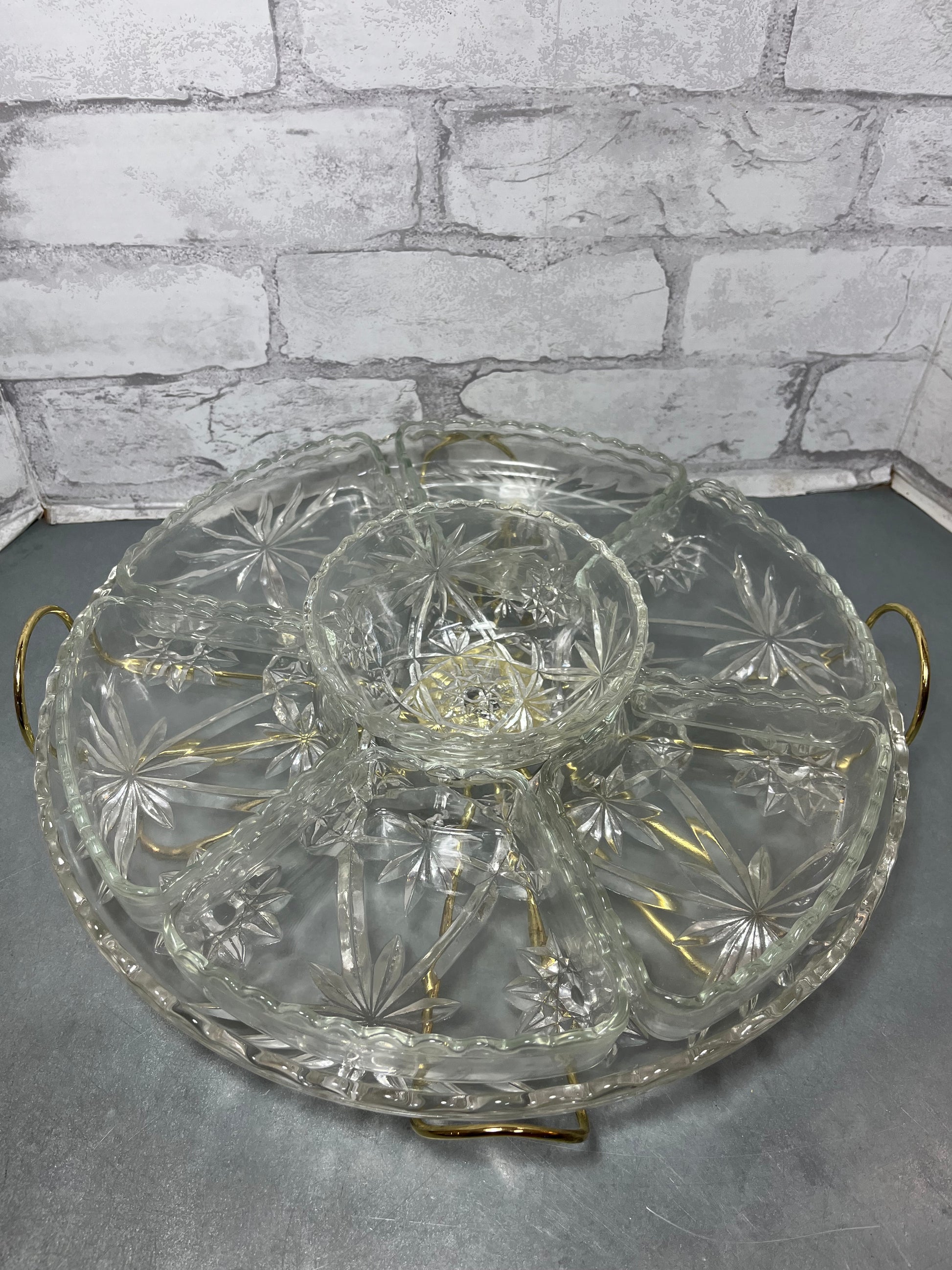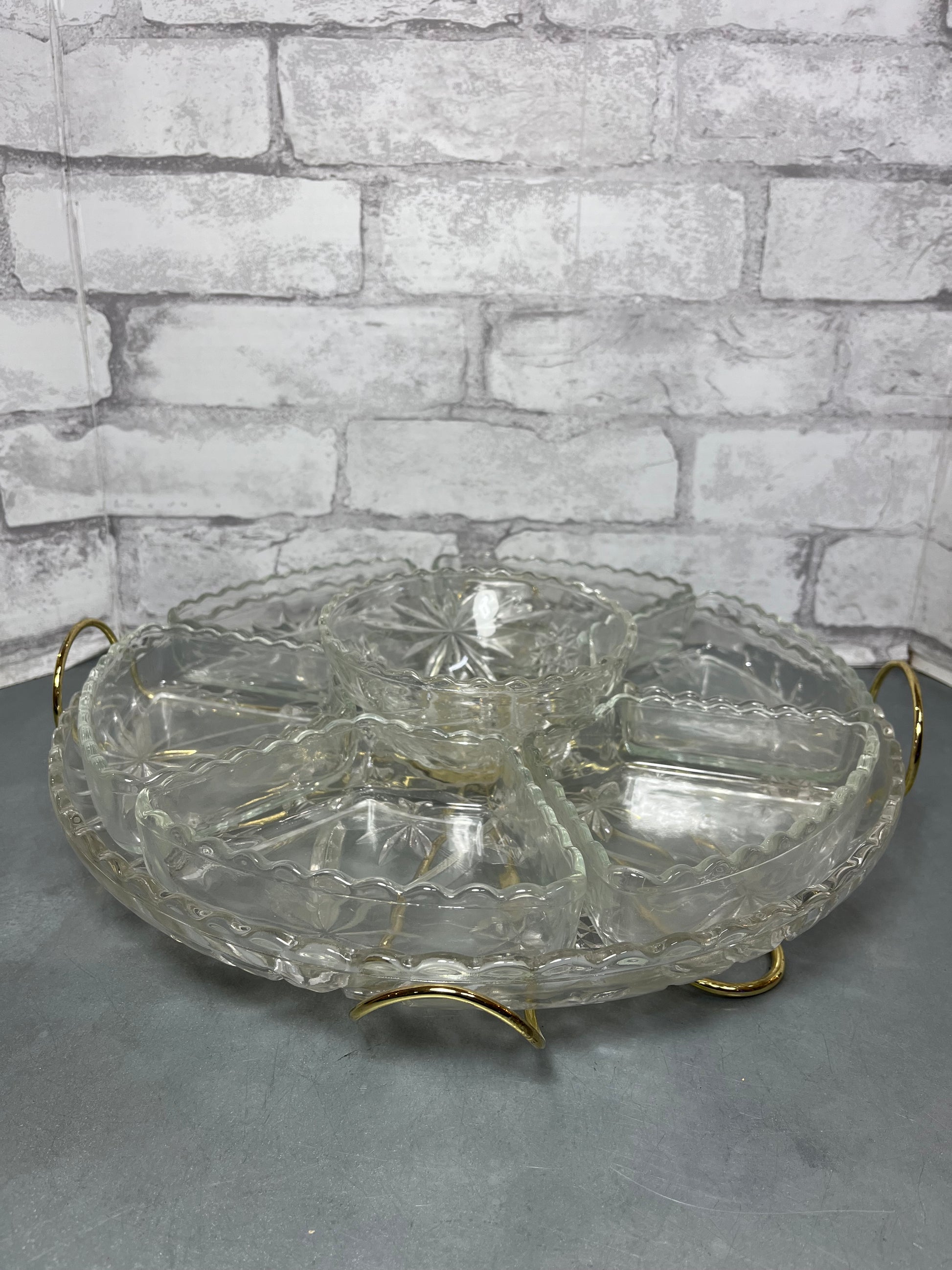 Anchor Hawking glass, it comes with 6 trays, one large glass plate, and one dip bowl, Lazy Susan type gold tray, vintage, all glass, sturdy, it has a “14 diameter, the trays are 5” wide, 1” deep, the bowl has a 5” diameter