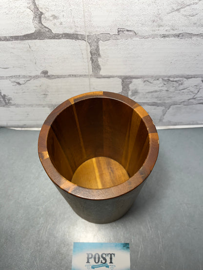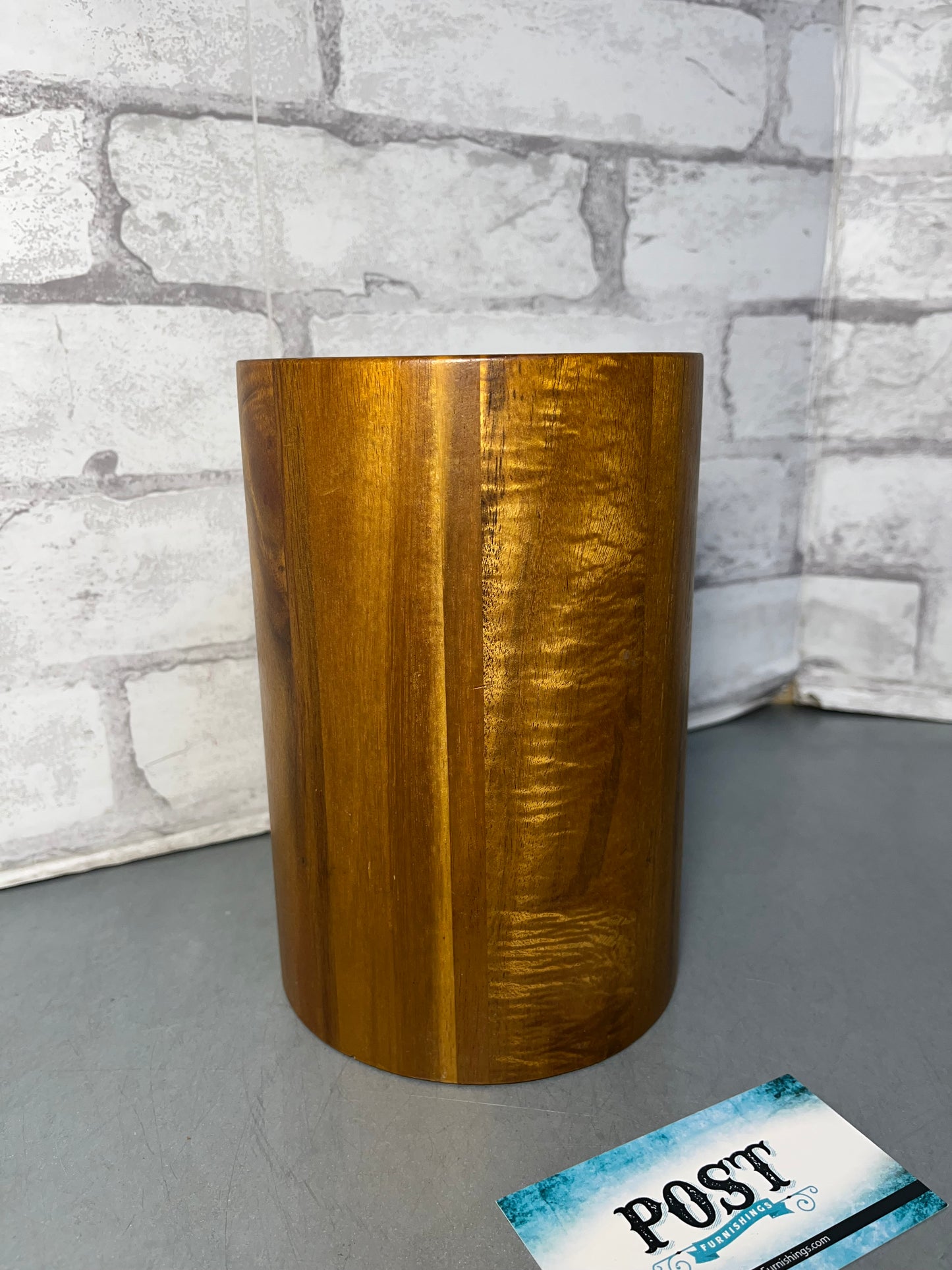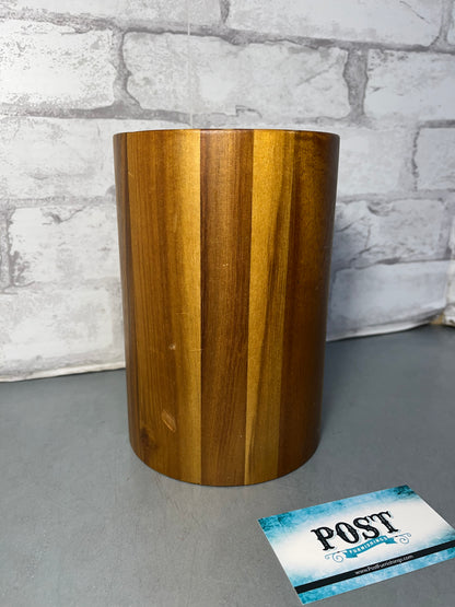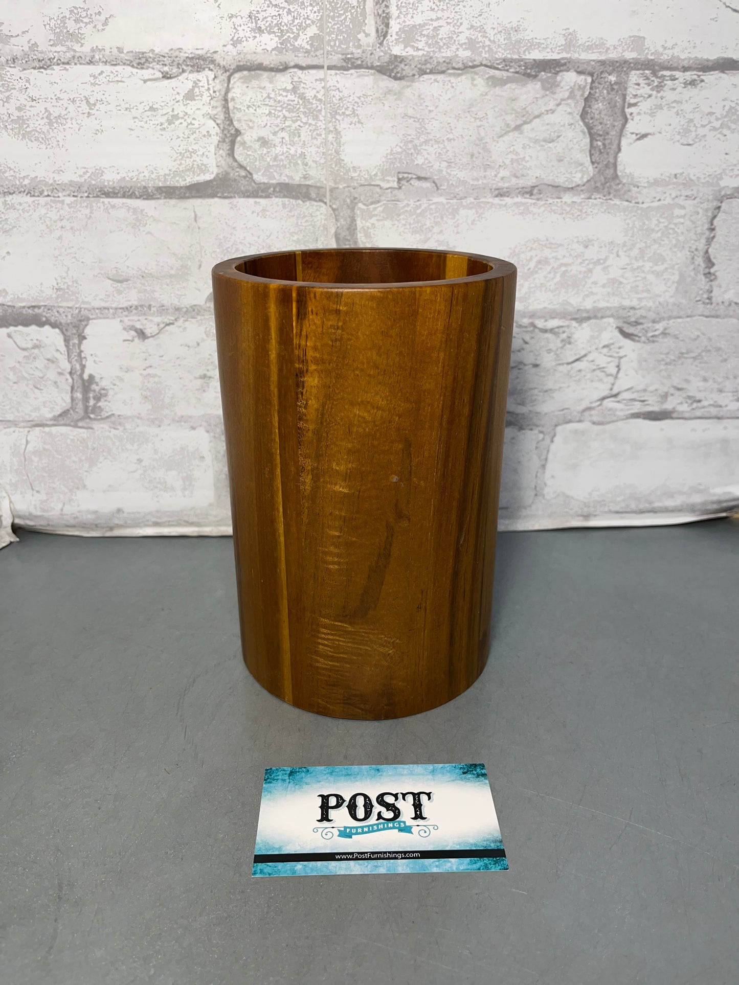 Made out of teak wood, cylinder shaped utensils holder, vase/holder is perfect for storing utensils or pens, warm neutral tones, it is 7.5” tall, 5” wide