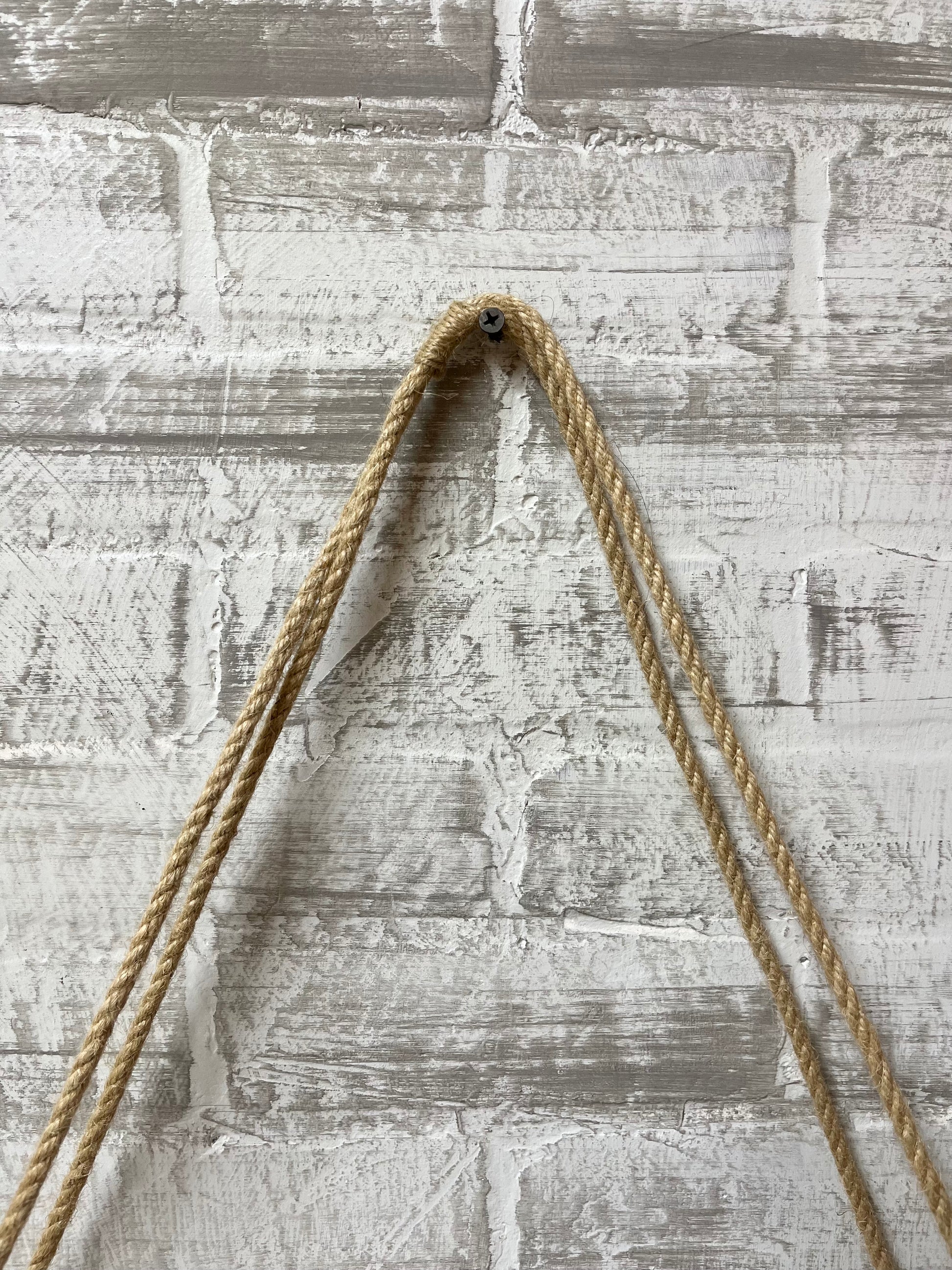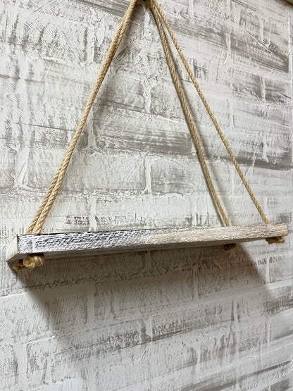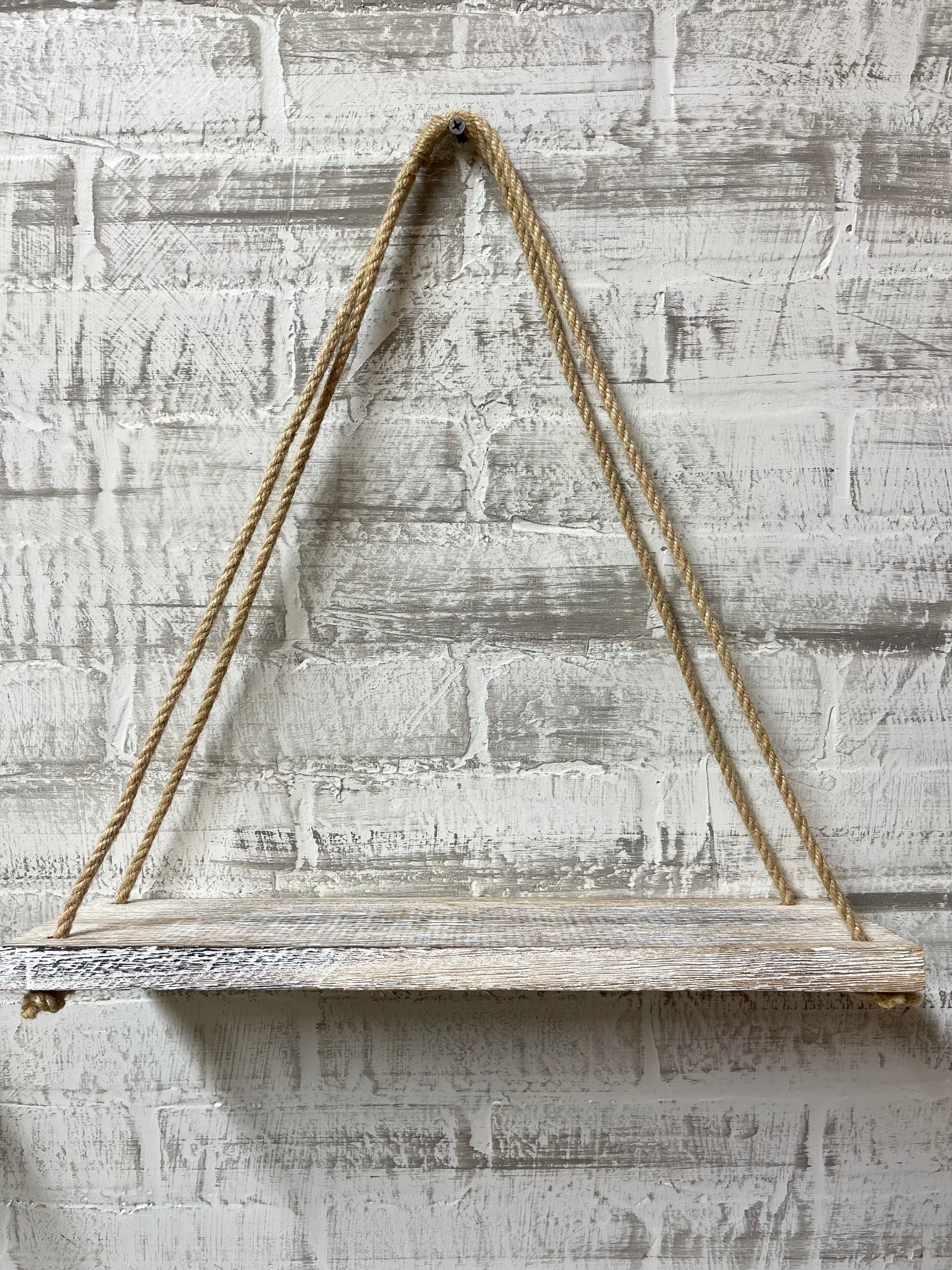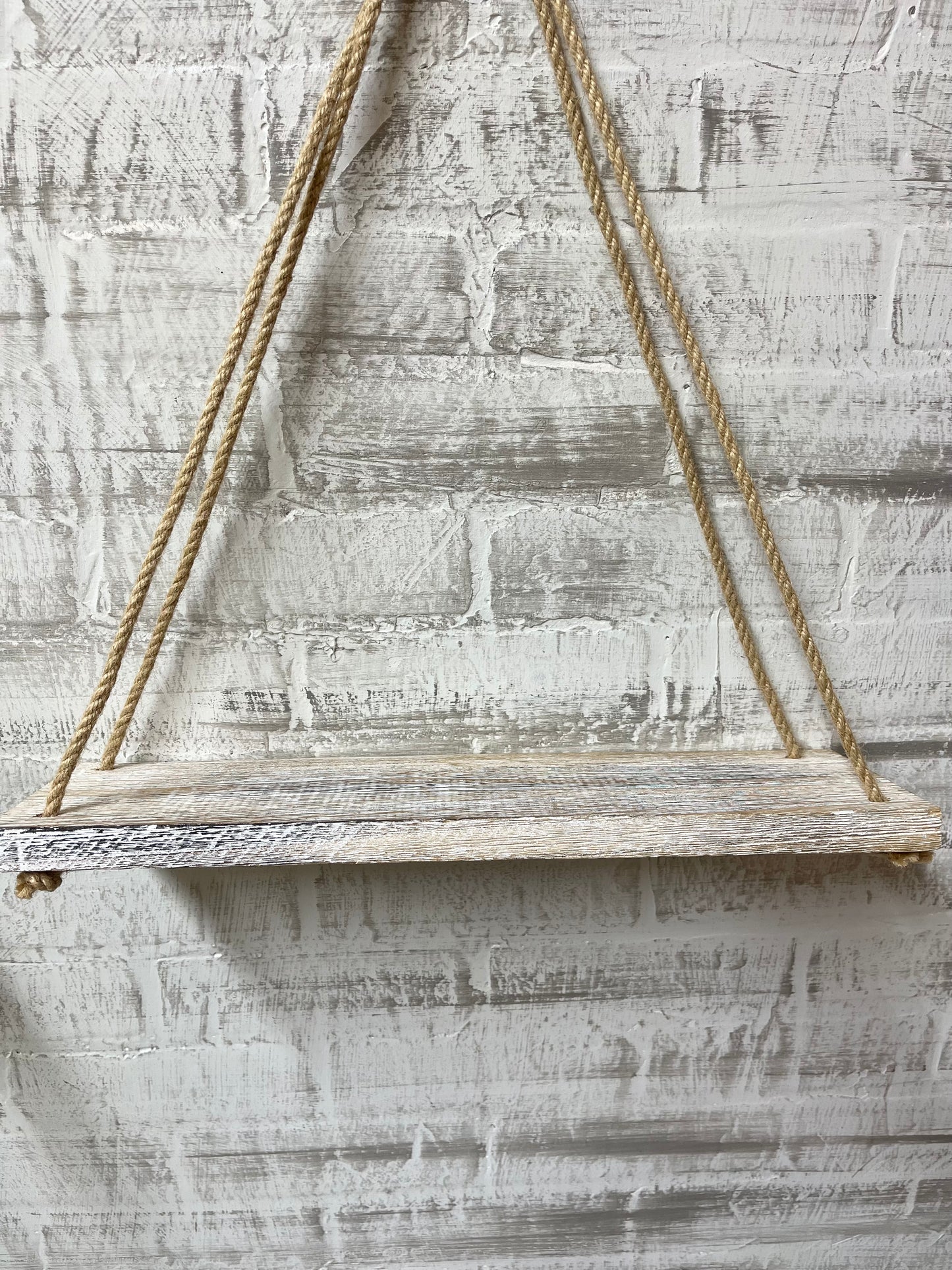 This hanging wood shelf, made of all wood, has rope to make it easy and convenient to hang on the wall, rustic perfect for displaying plants, pictures etc, it is 17” long, 5” wide, hangs 16.5” long
