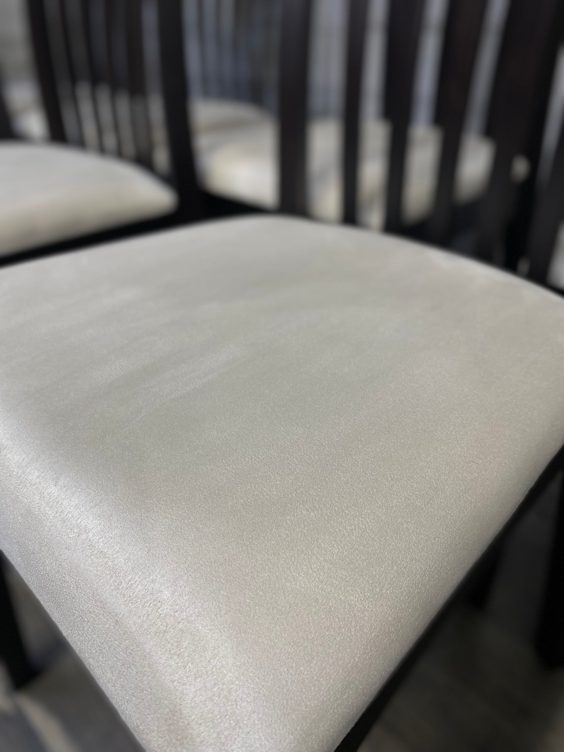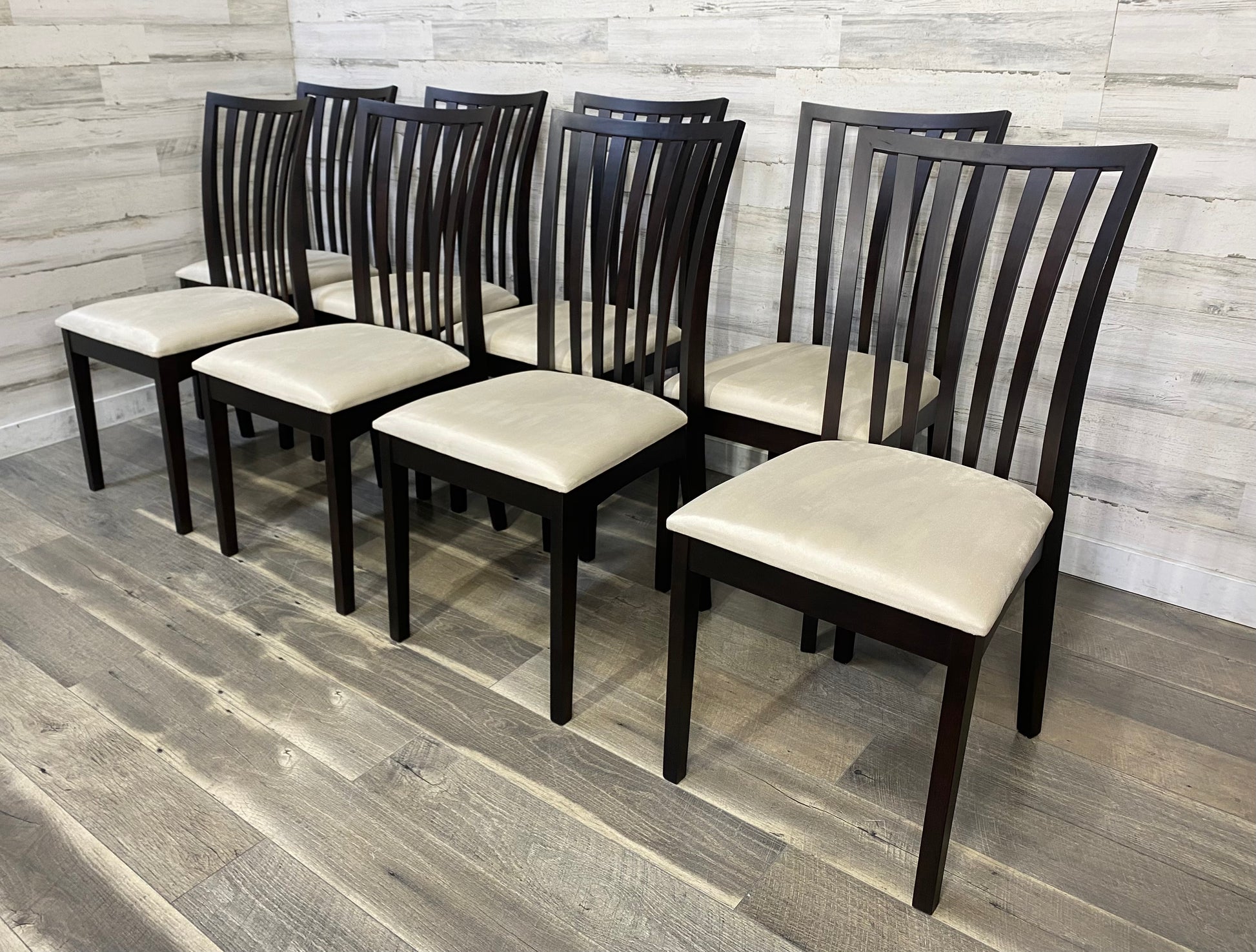Set of 8 matching black dining chairs. Cream color micro suede material seats. 1 seat has a very light mark. See pics. Sturdy and overall great condition.