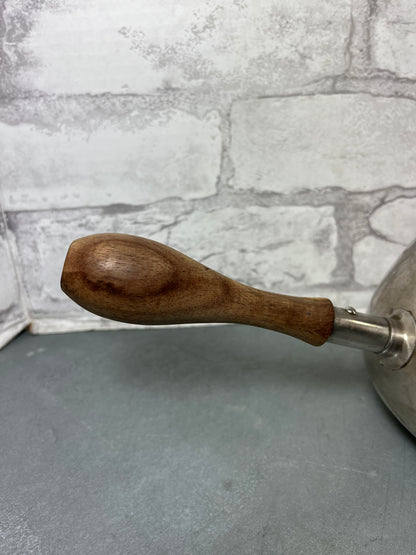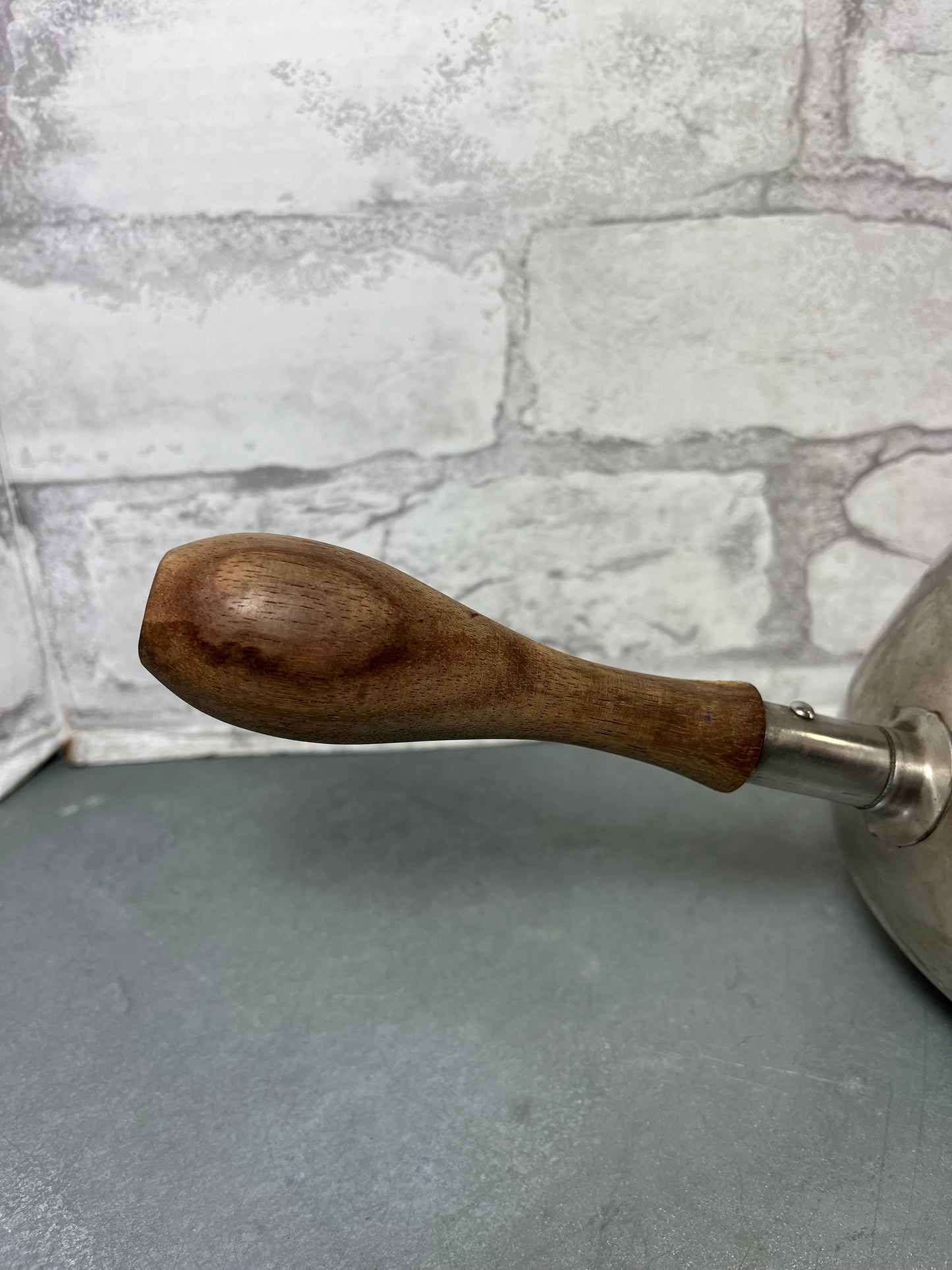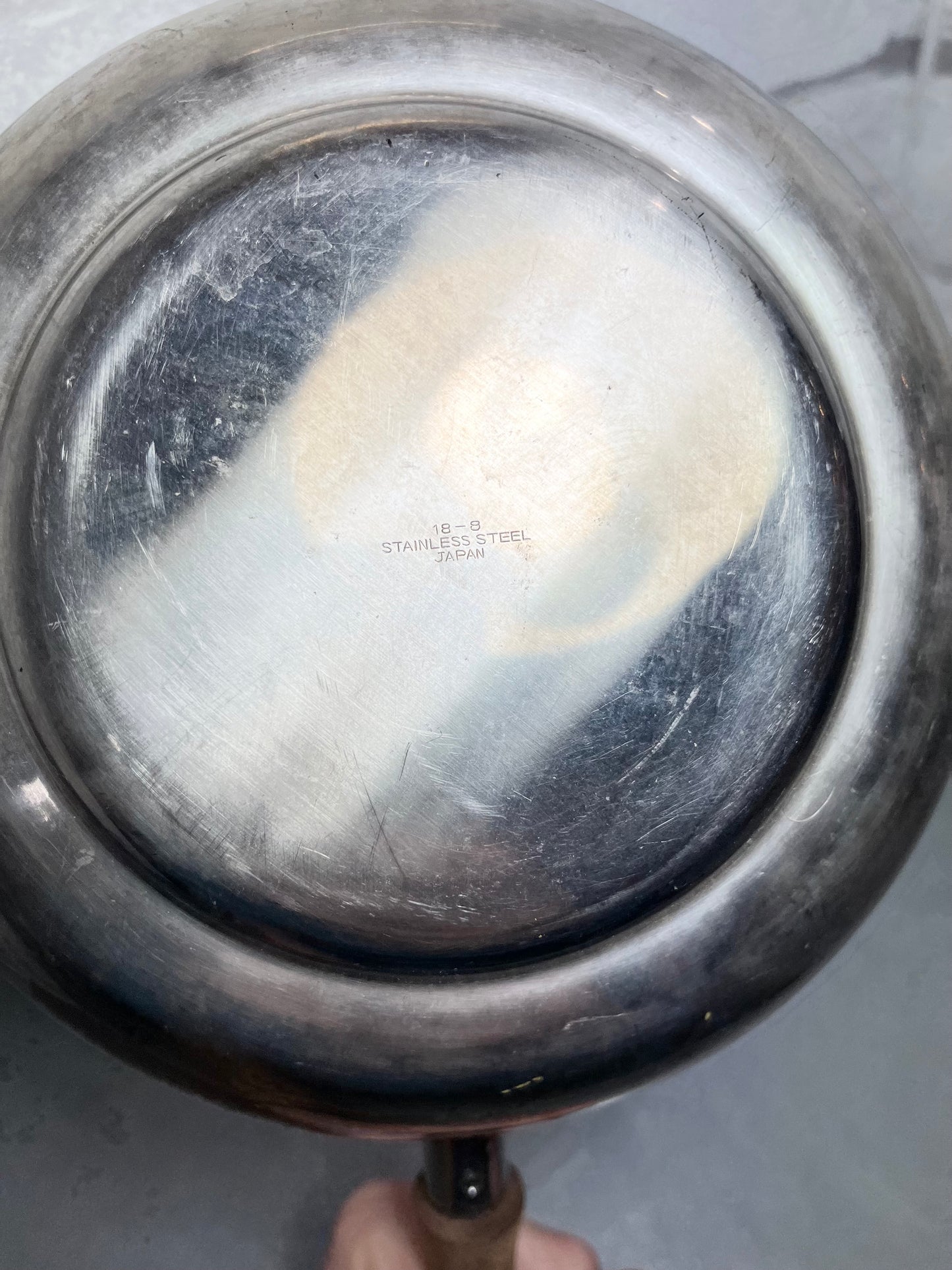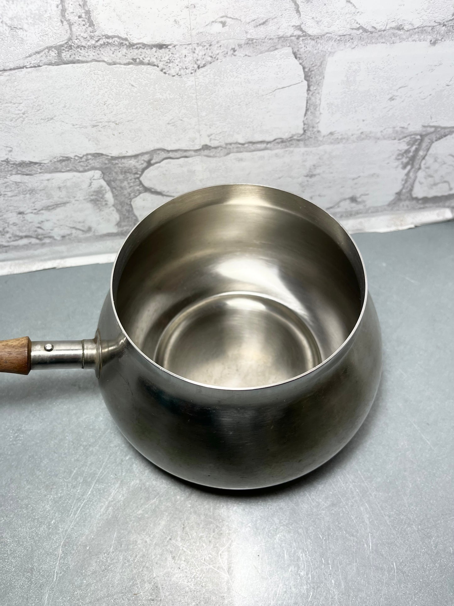 Made in Japan, this is stainless steel with a wood handle, it’s considered a saucepan, definitely a mid century vintage retro piece of kitchenware, it’s 10” long with handle, pot is 4” deep, it’s got a 6” base