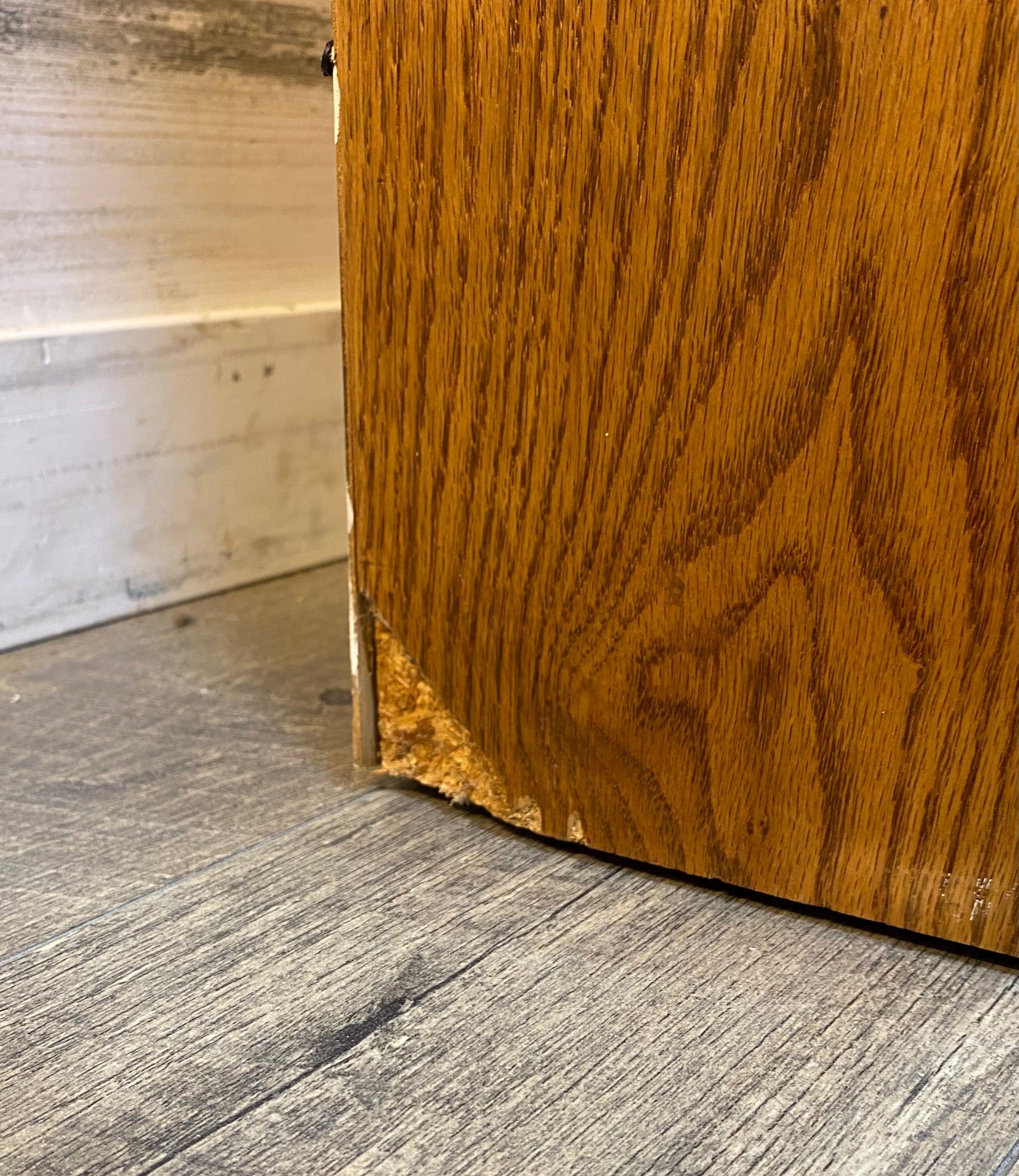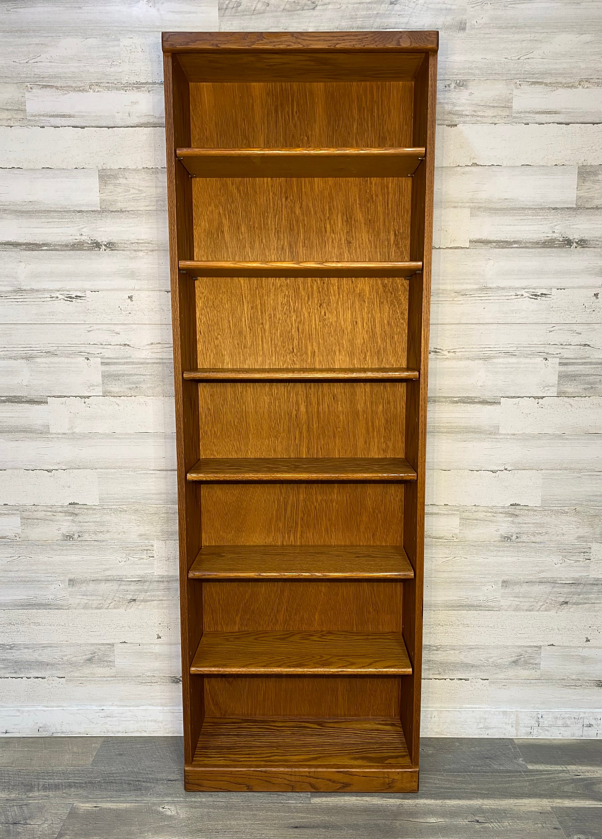 Tall, skinny, and very sturdy oak veneer bookshelf. Adjustable shelves. Has a couple flaws seen in pics.
