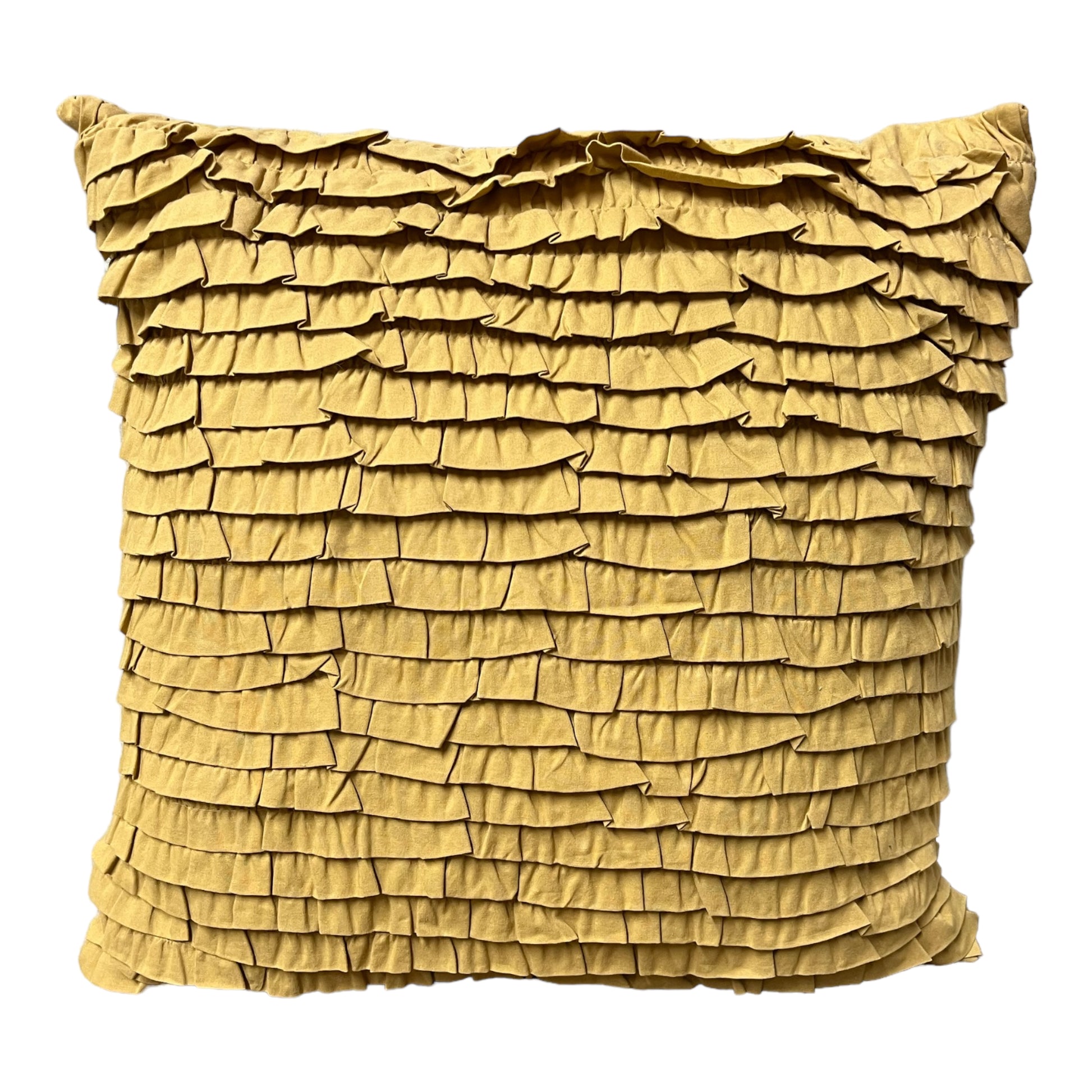 Upgrade your home decor with this beautiful mustard yellow ruffle pillow. With a unique and eye-catching design, you'll instantly add a touch of luxury and elegance to any room.