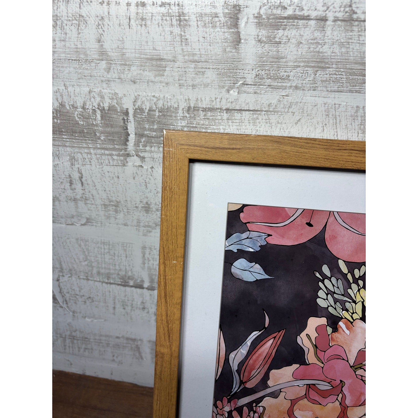 prints depict various flowers and foliage in a painterly collage style, with a dark background allowing the colorful blooms to stand out, two framed art prints, from the brand Threshold, they are 11” by 14”