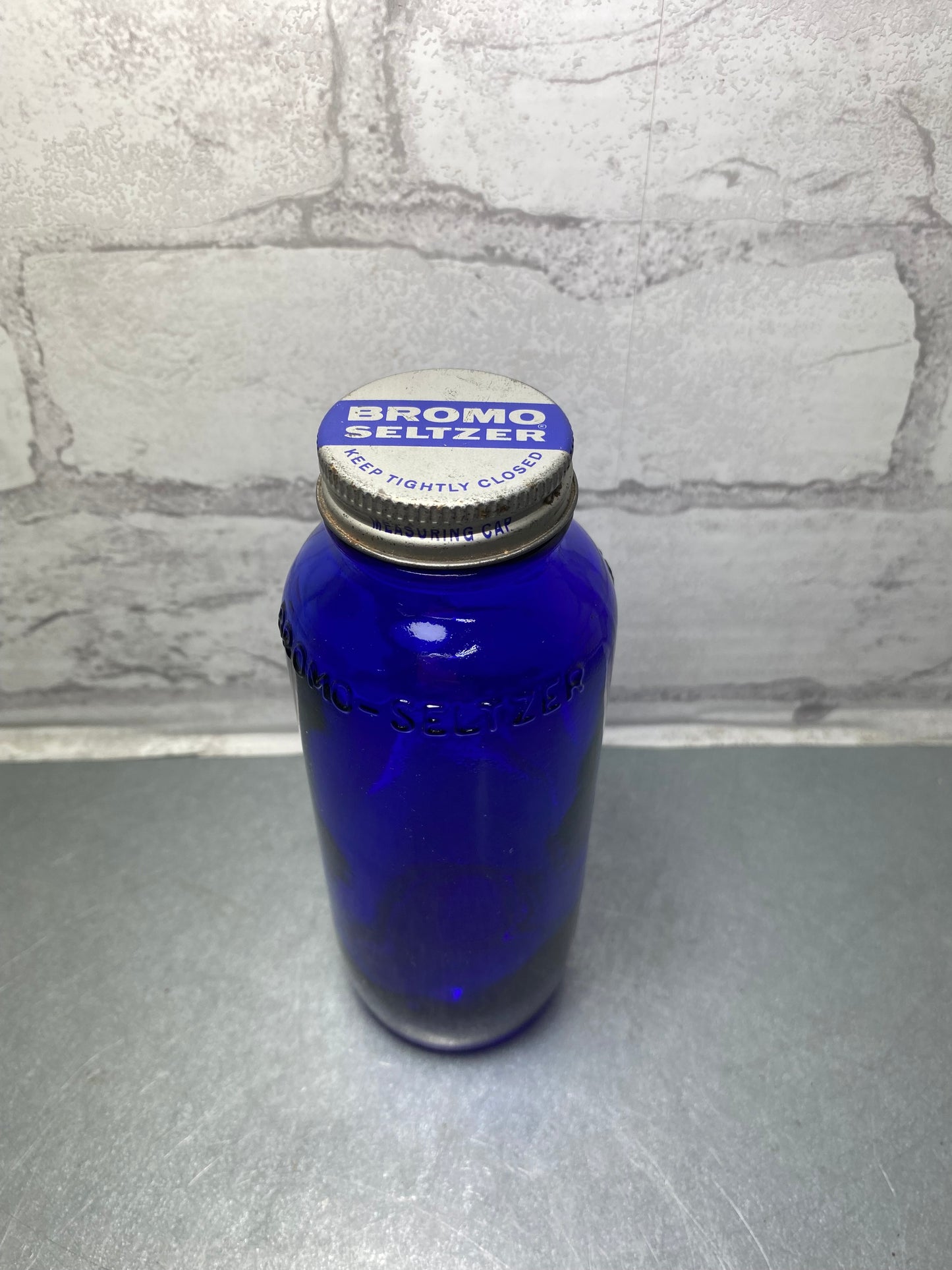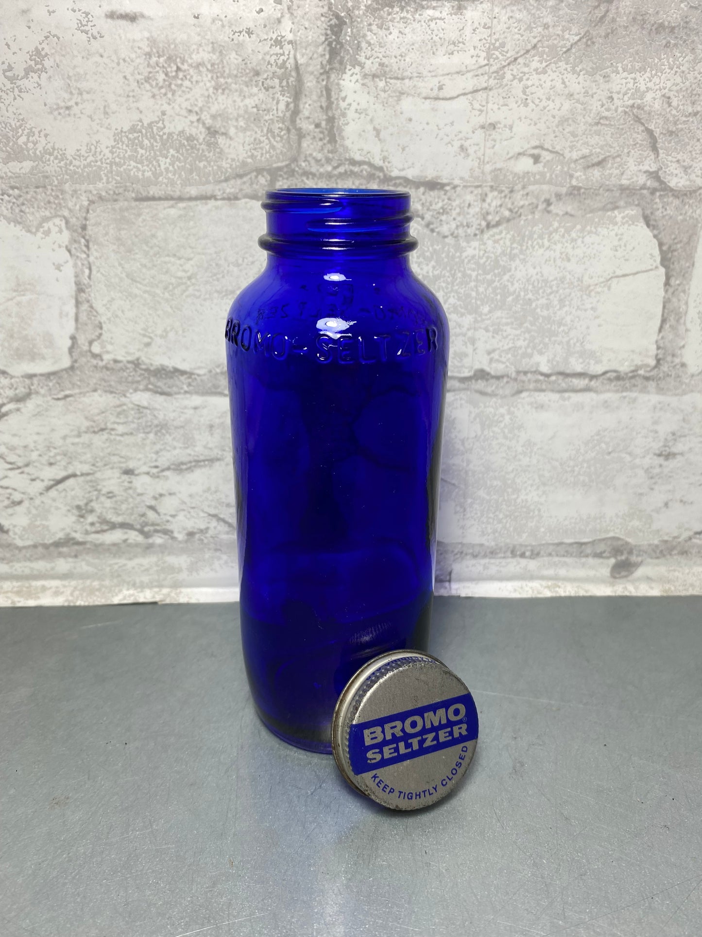 Vintage Bromo Seltzer Blue Bottle With Cap, Bromo Seltzer embossed on front and back of bottle, No cracks or chips, Cobalt Blue Glass, it is 6” tall, 2” wide