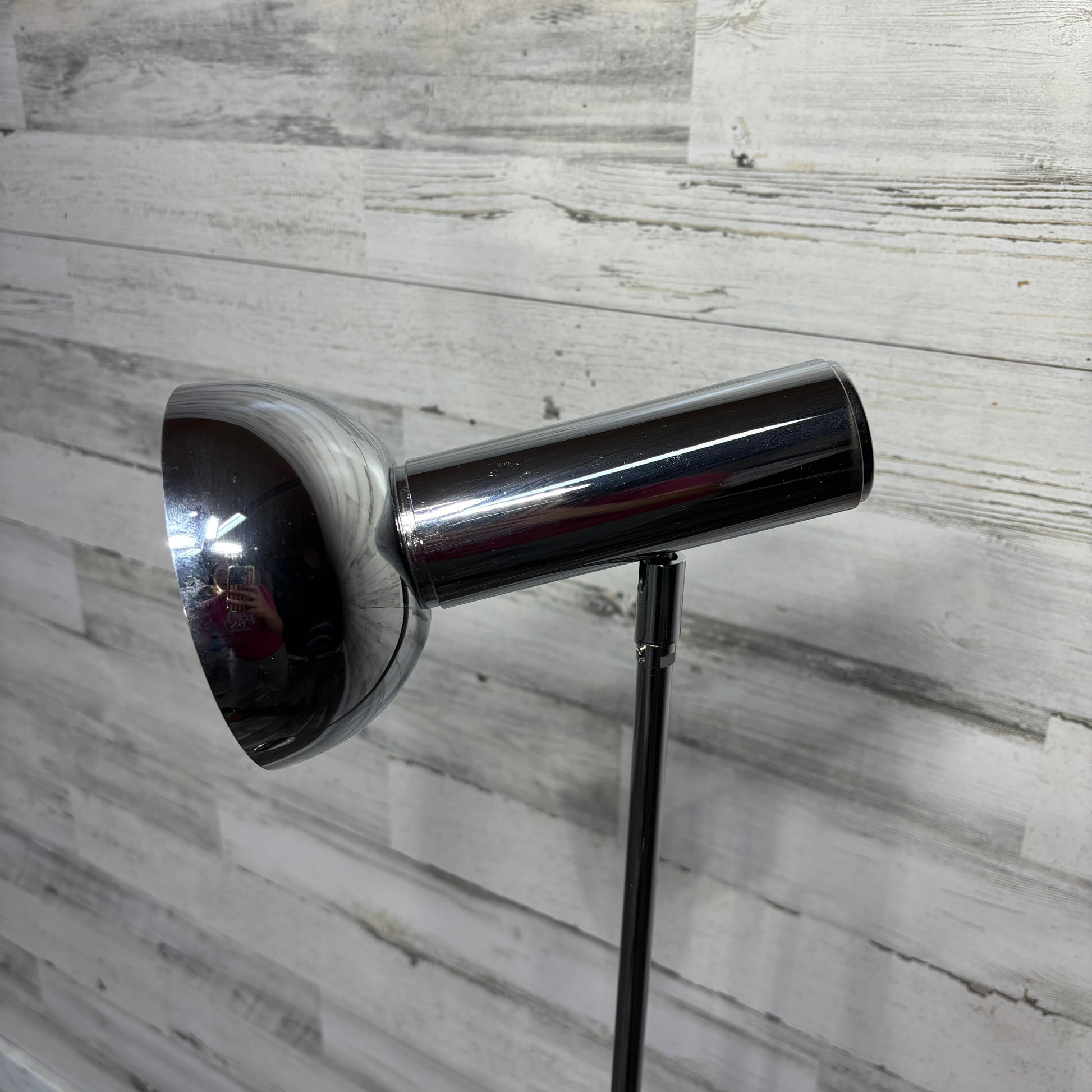 vintage mid century chrome metal standing floor lamp, with push button switch, 50” tall, 8” diameter base