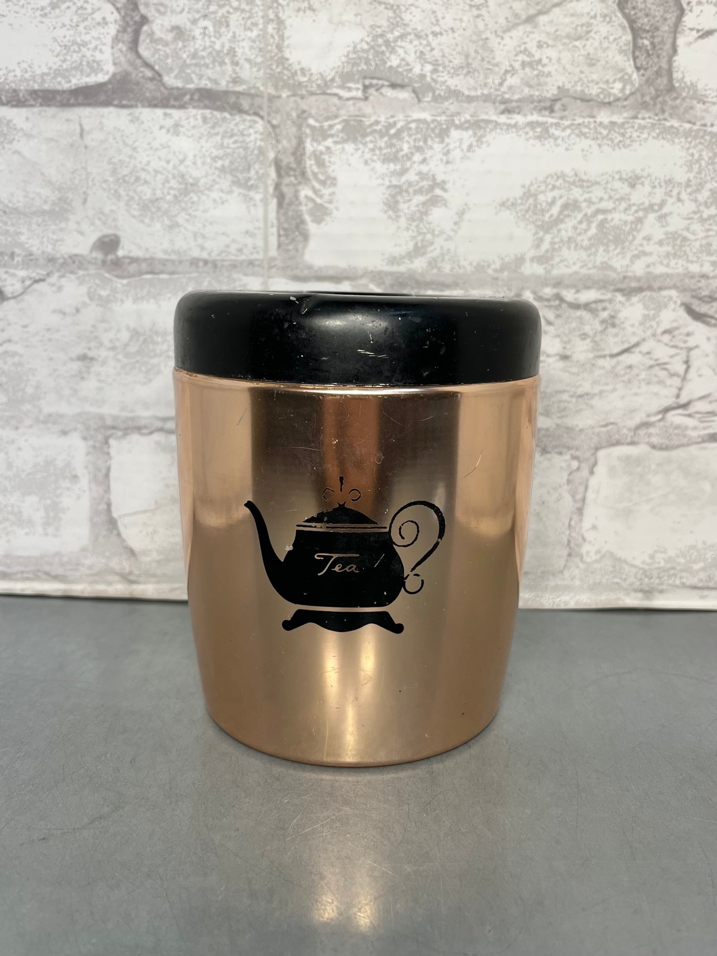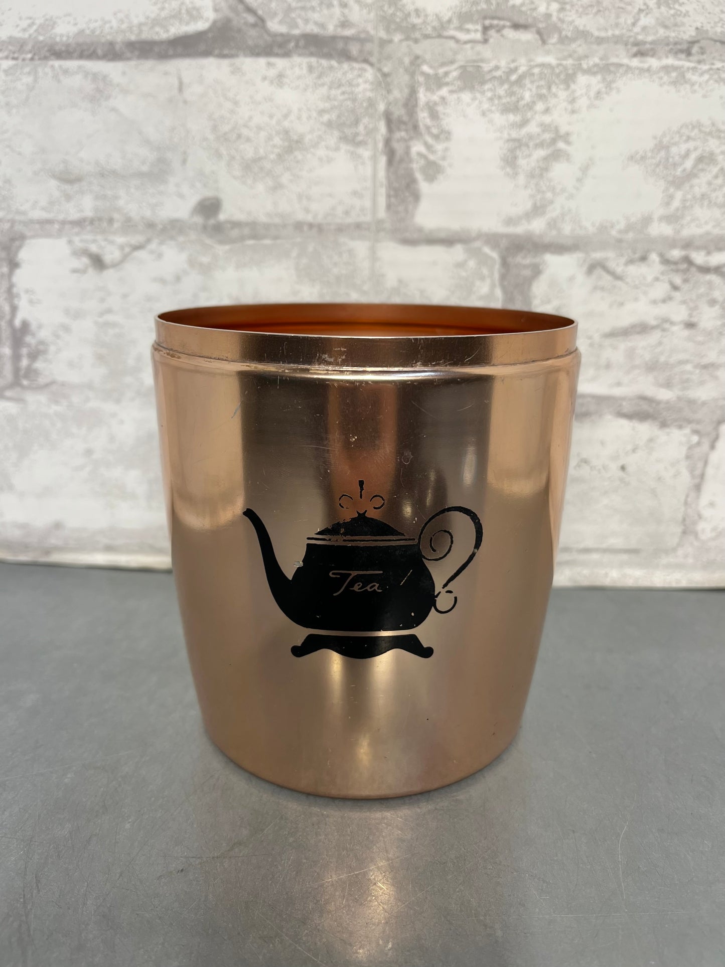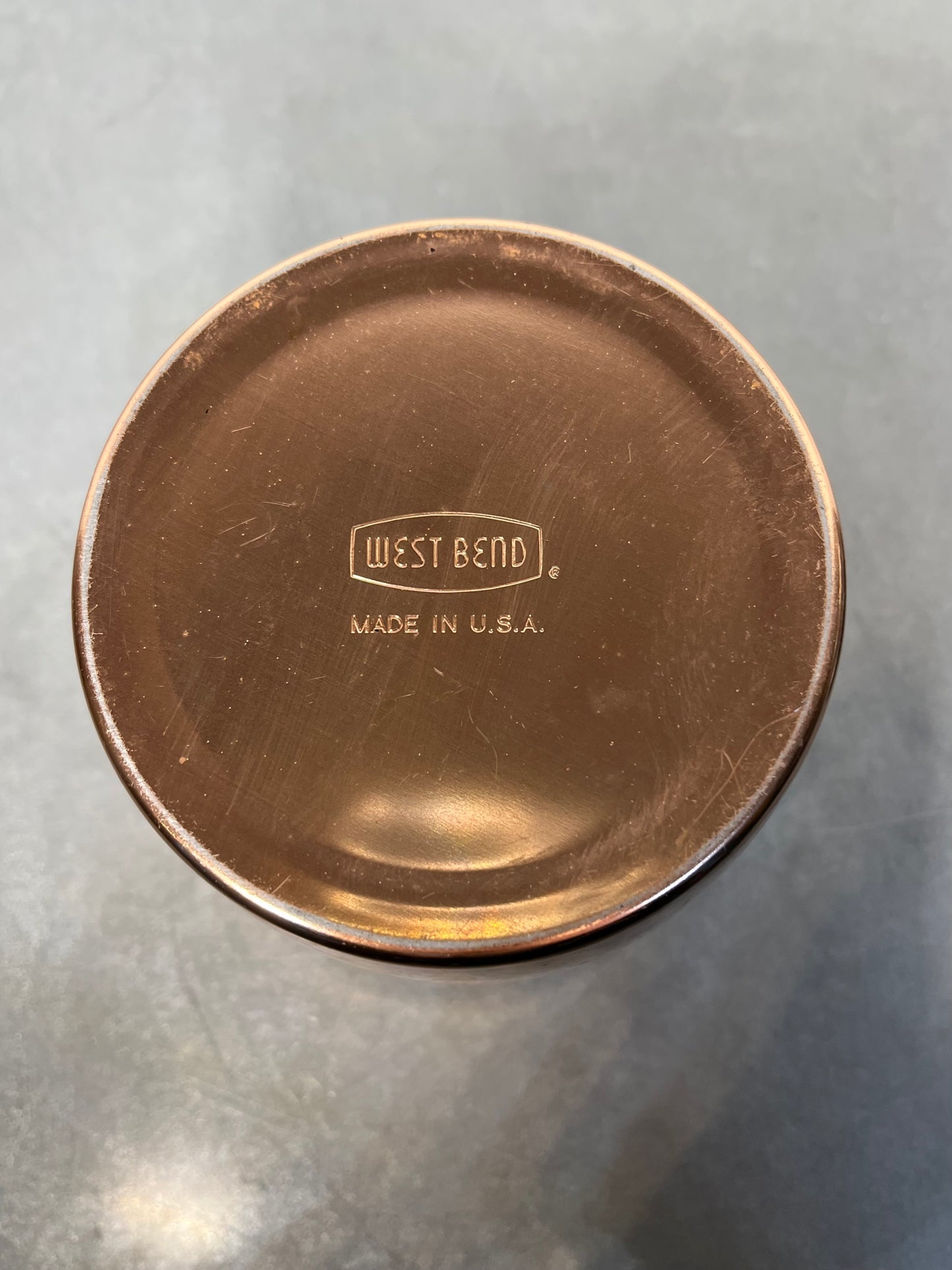 Vintage West Bend Copper Colored Aluminum Canister, great for any kitchen. Lid has a handle to easily take off. Has some scratches from use. 5.5” tall, 4.5” wide.