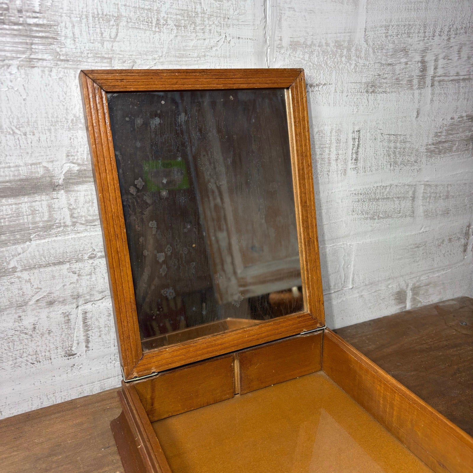 Solid wood, floral design jewelry box with mirror, some marks and spots on the mirror due to old age, 1.5” deep, 9.5” wide, 11” long