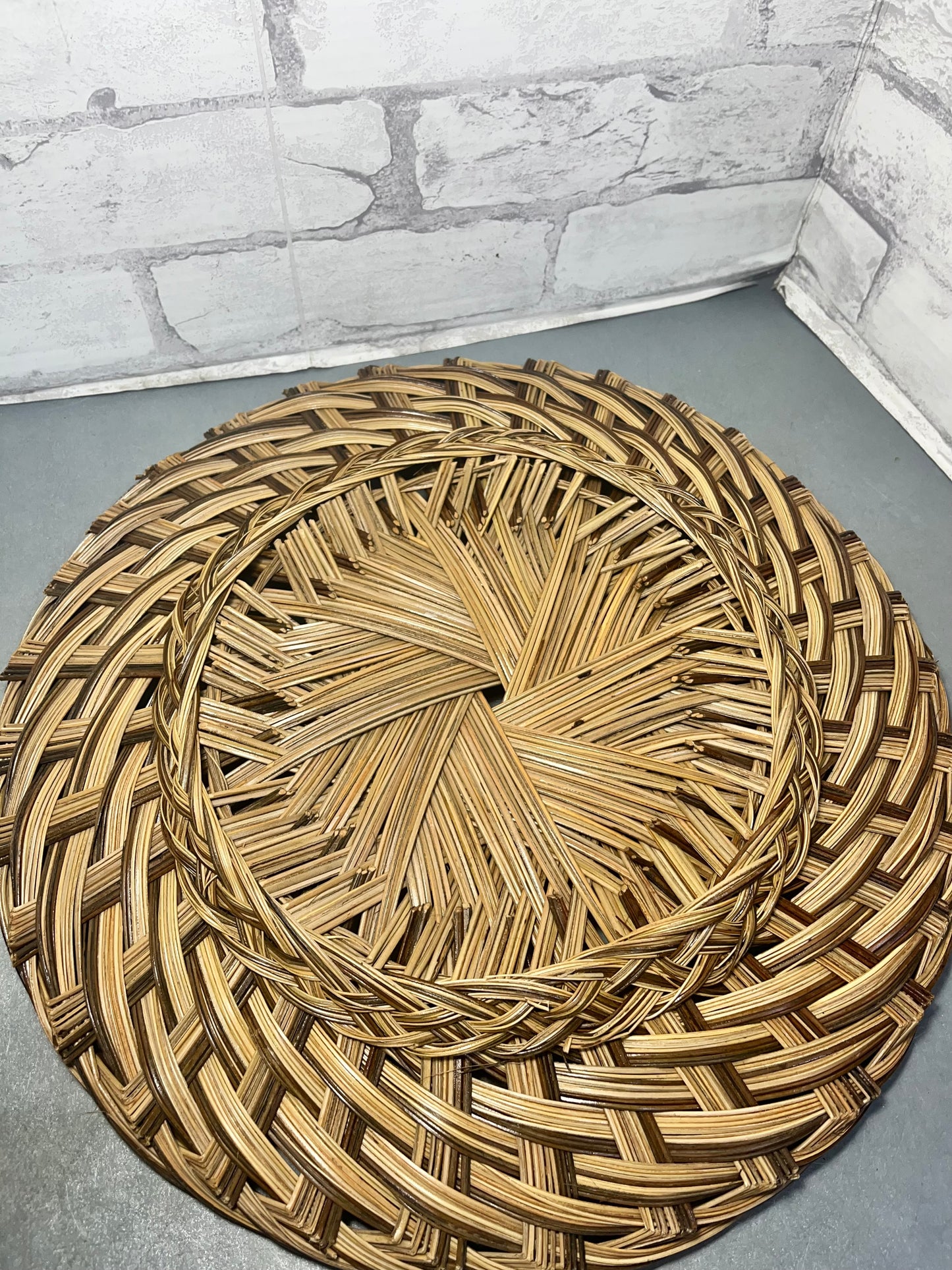 Woven wicker tray, great for wall decoration, to put stuff on, etc. 16” wide, 2” tall.