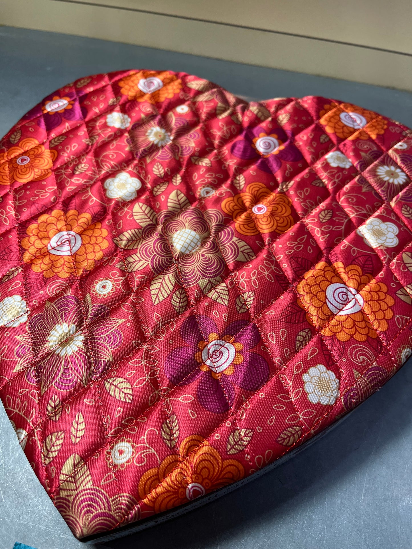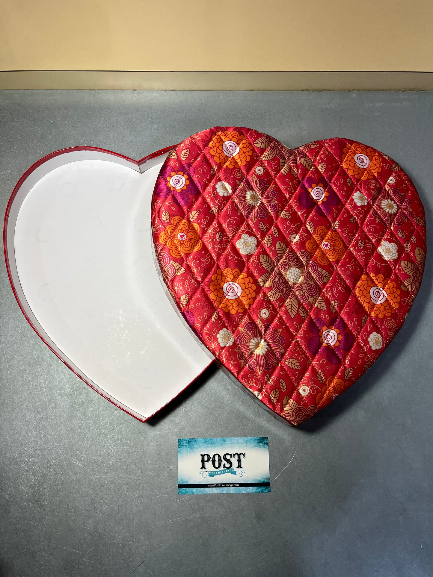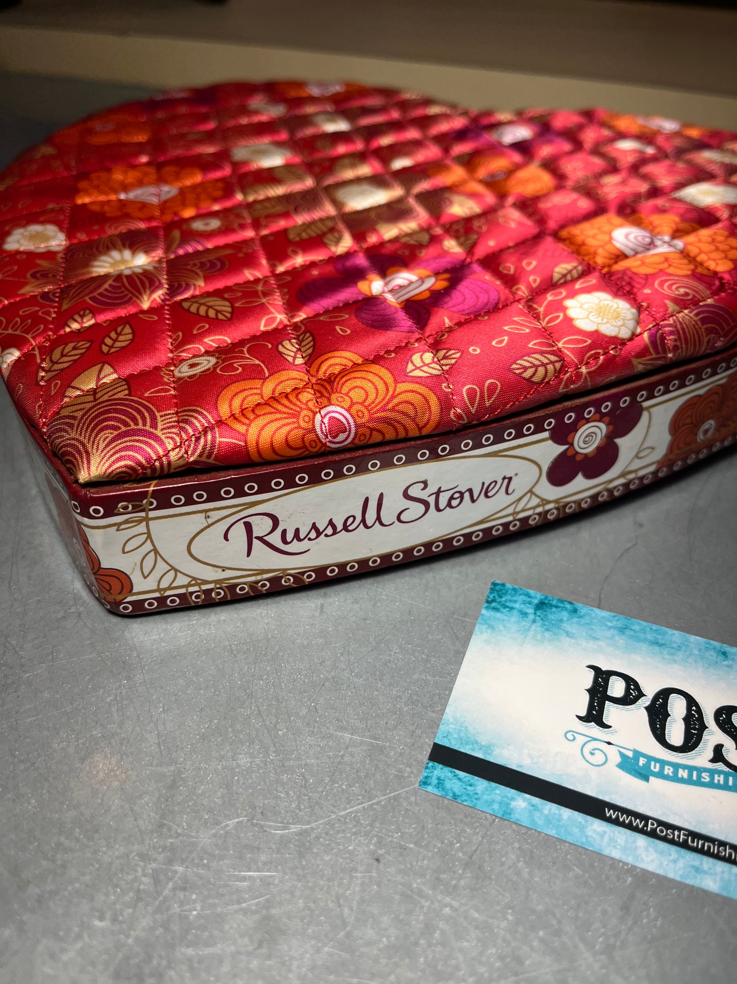 Vintage Y2K Russell Stover heart shaped chocolate box, no chocolate inside just beautiful vintage valentines decor, quilted silk fabric top, it is 1” tall, 10” long