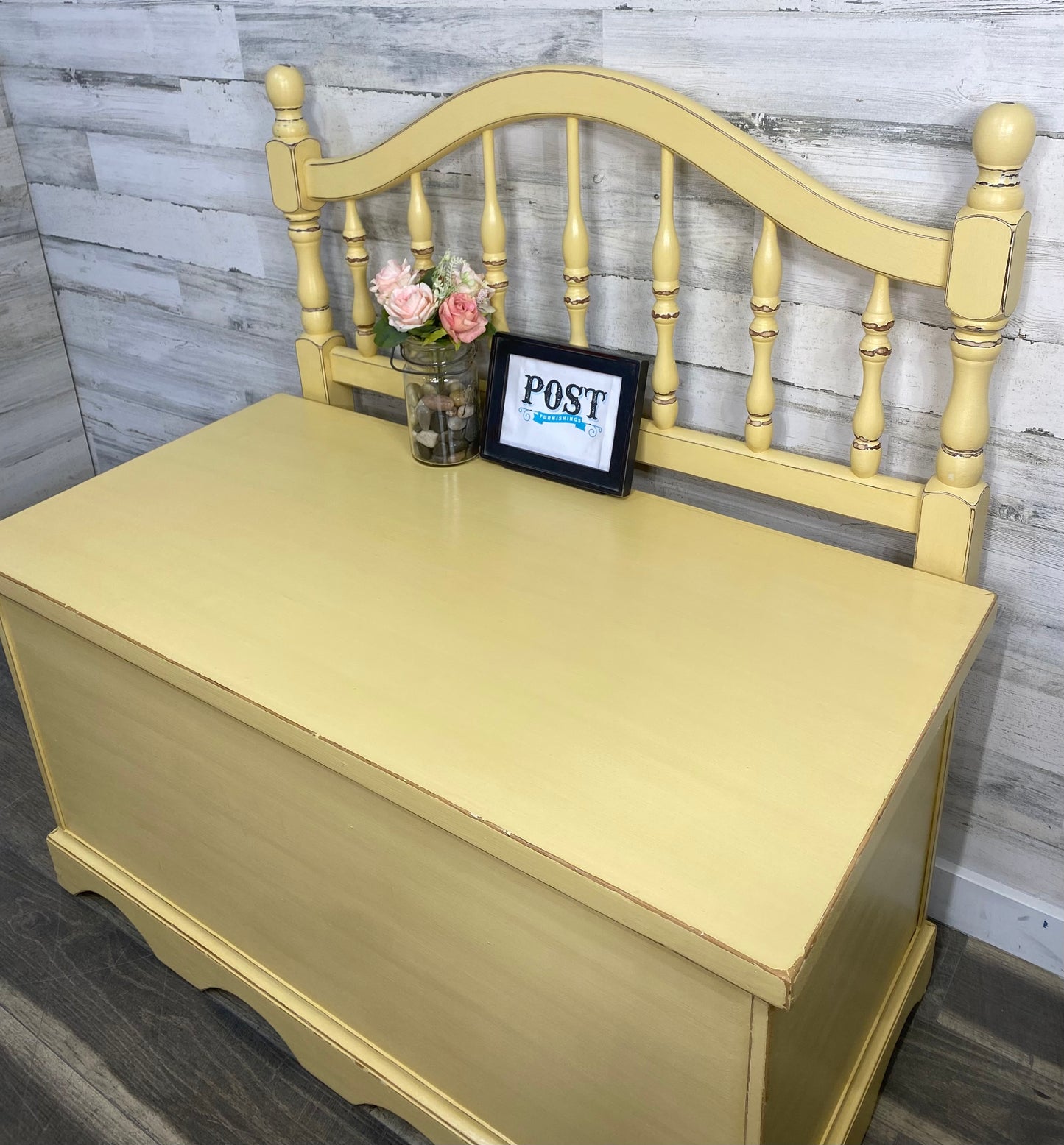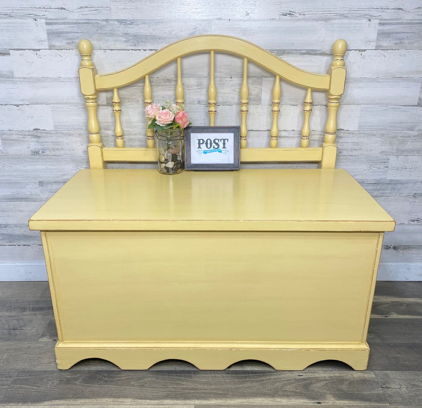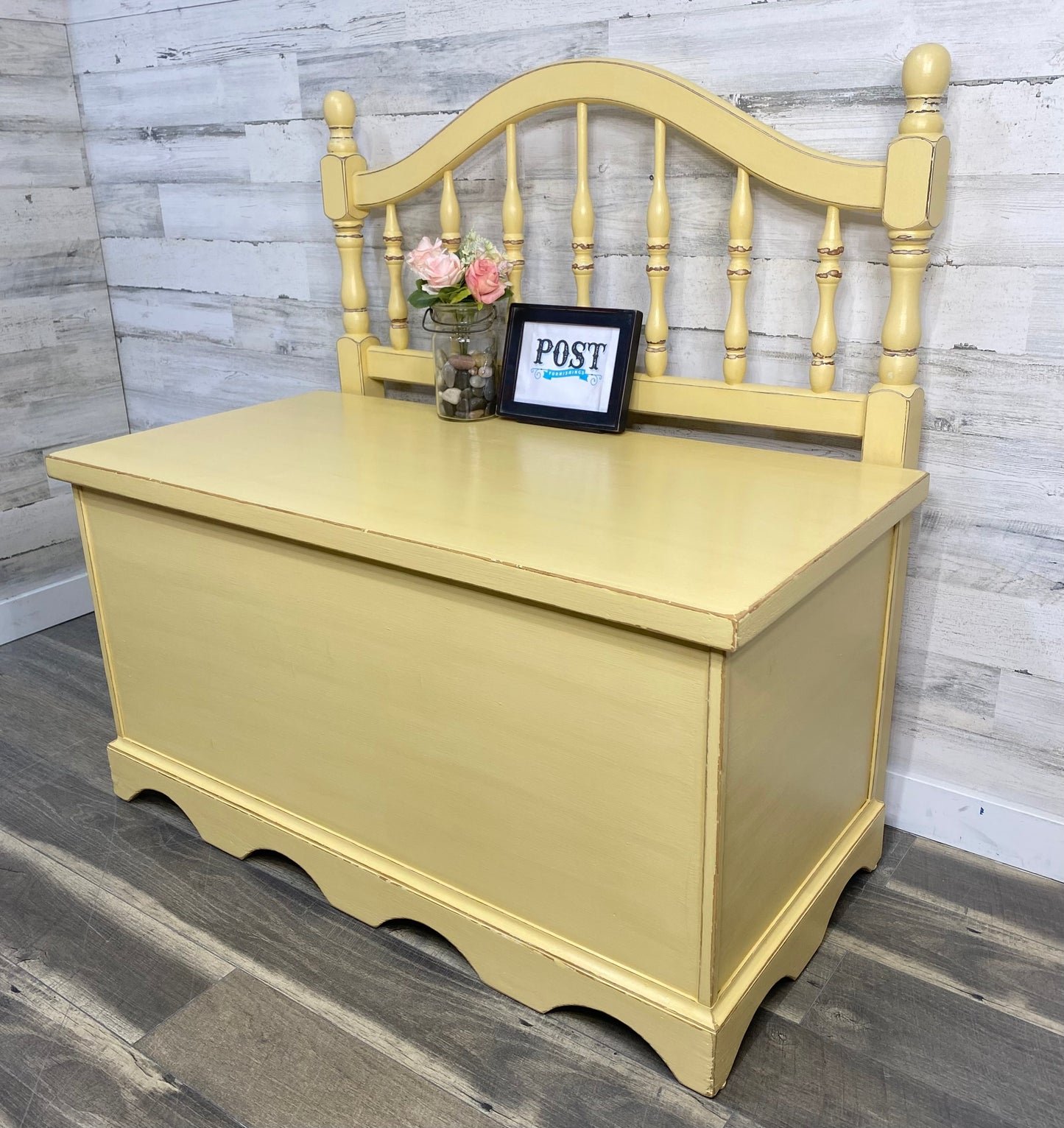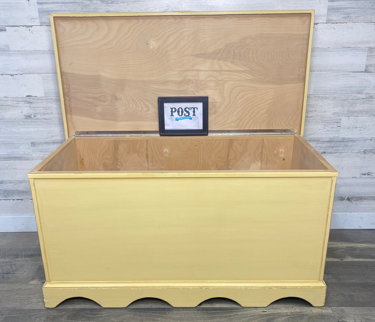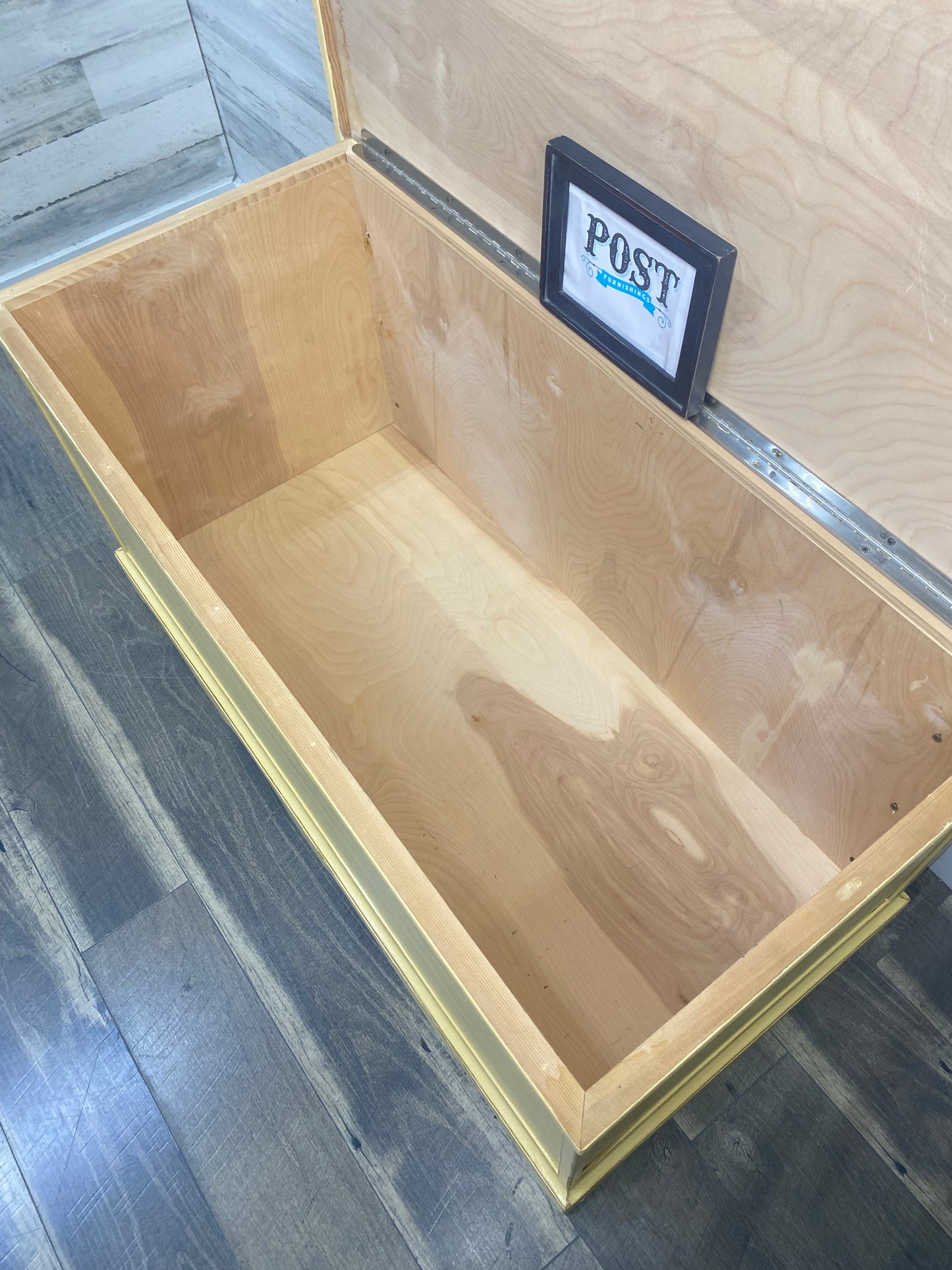 Custom built toybox/ linen storage. Very sturdy and could be used as a bench! Light yellow color with light distressing for a farmhouse style.