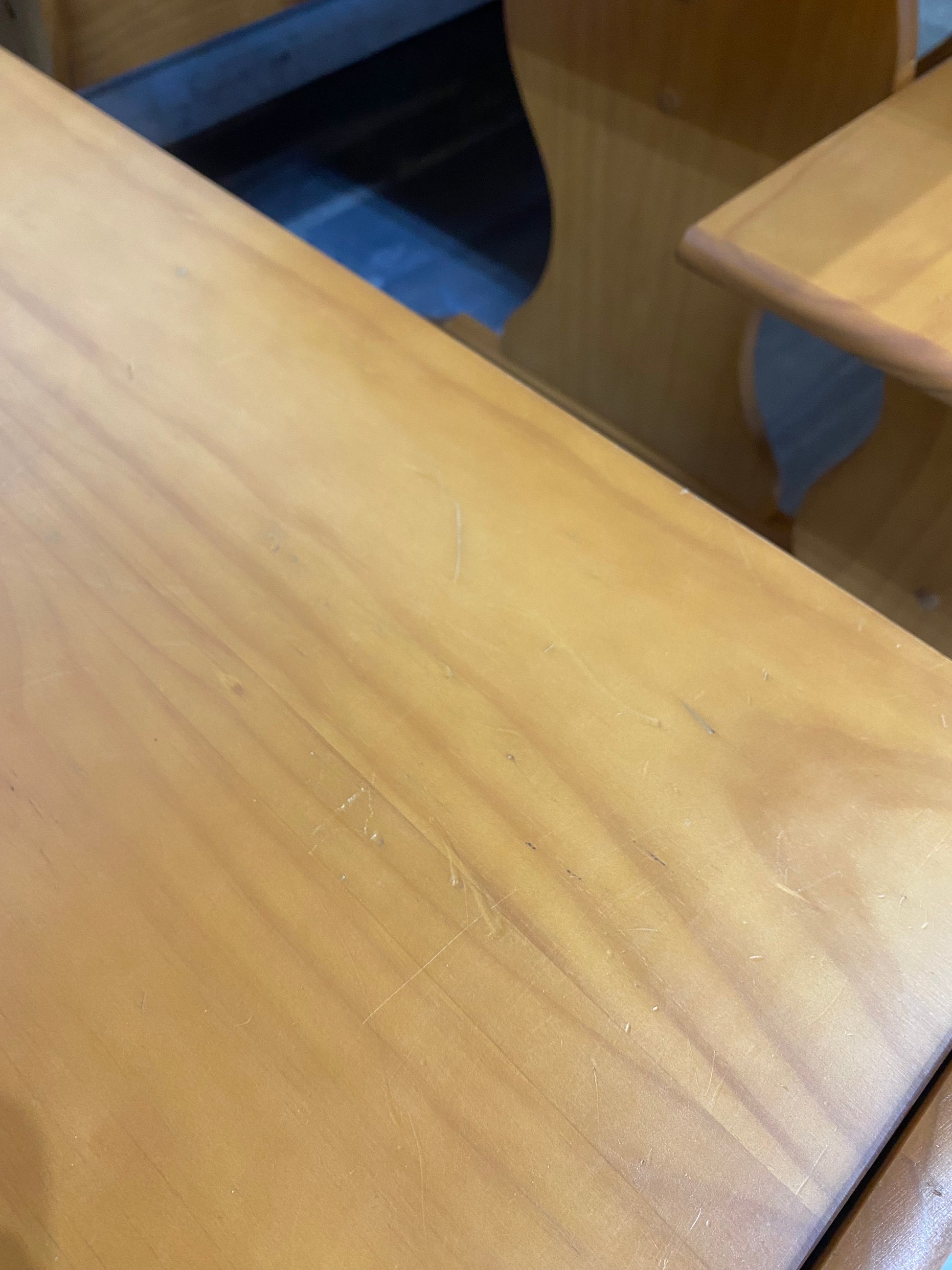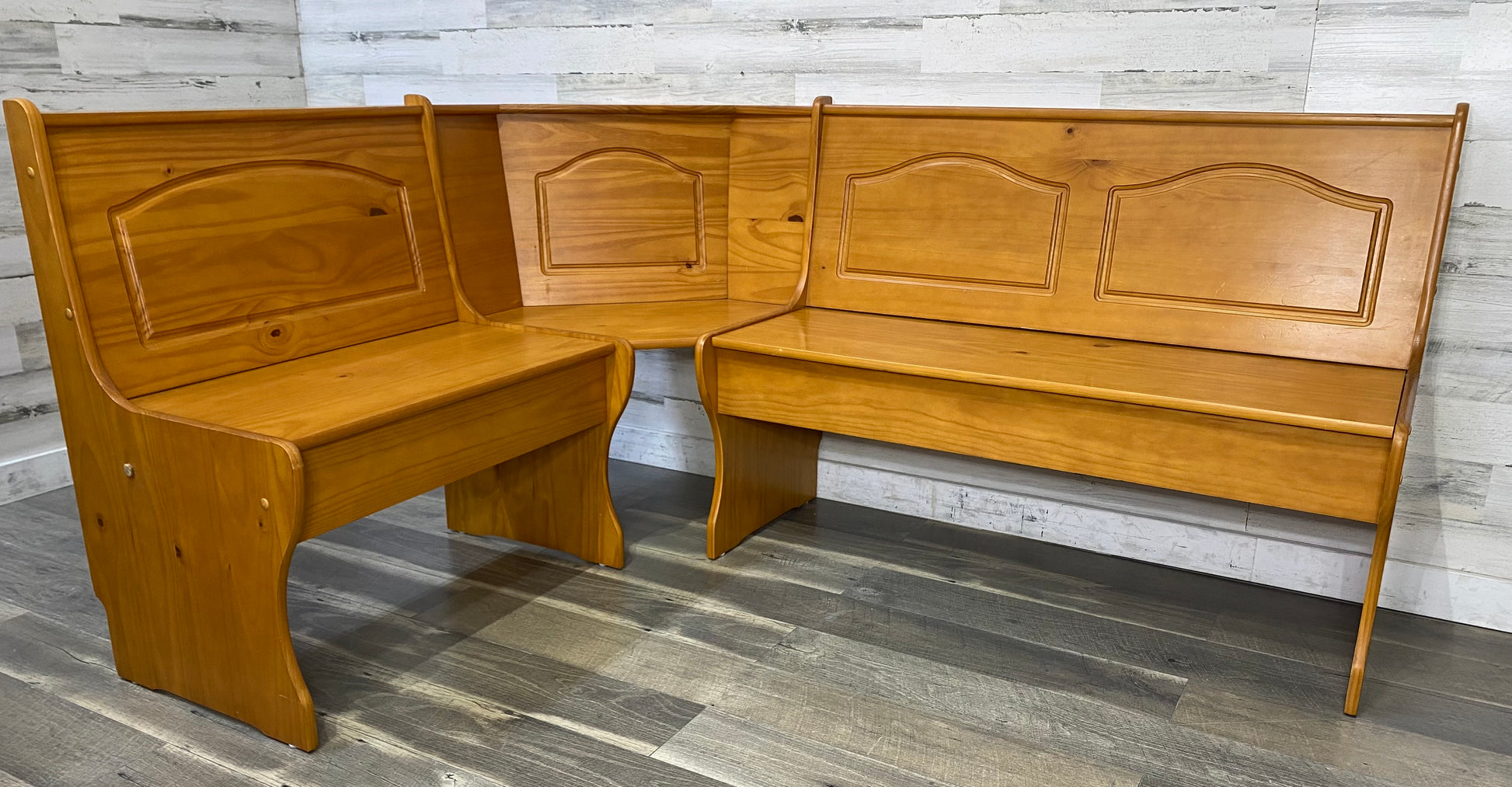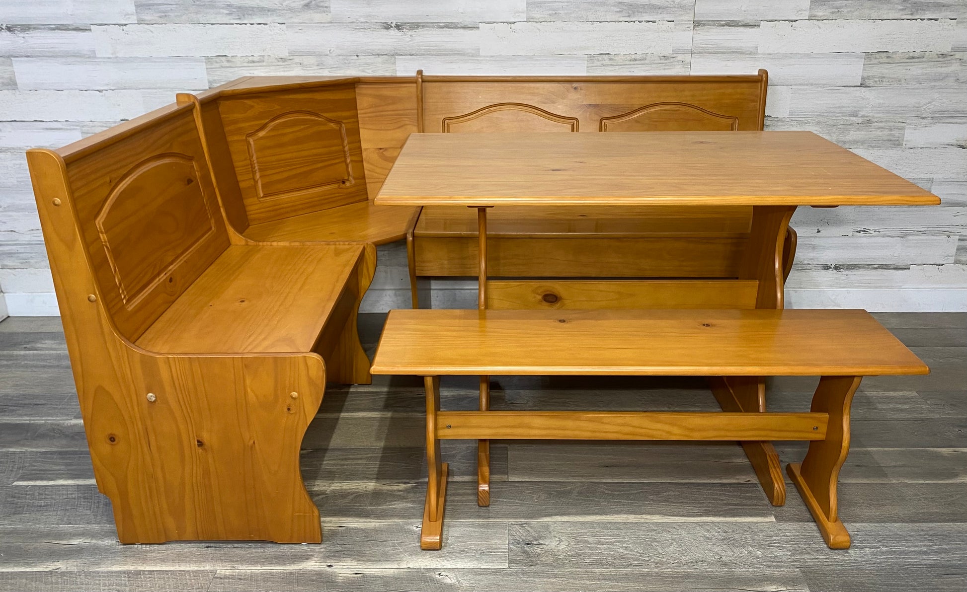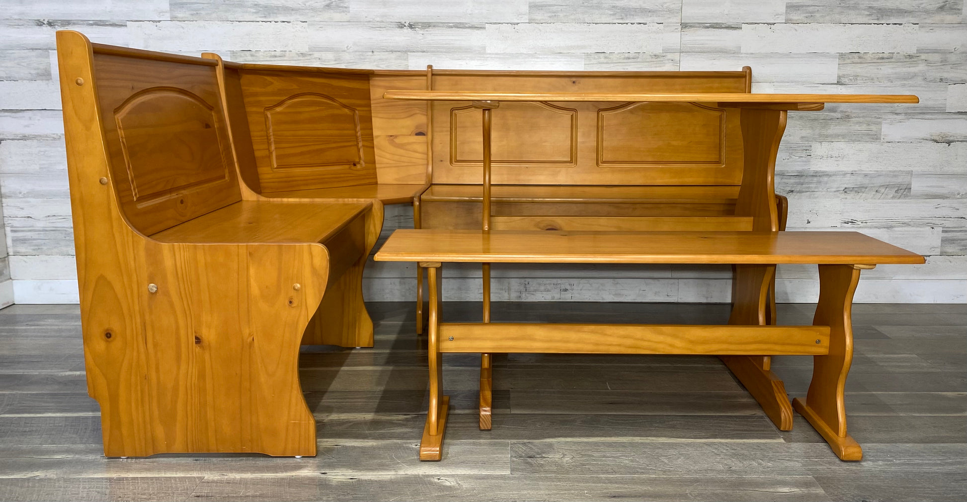 3pc pine wood dining set. Built to fit snug in a corner of a small breakfast nook. L shape seats open with storage underneath. Has some scratches but nothing major. Sturdy and great for small spaces.