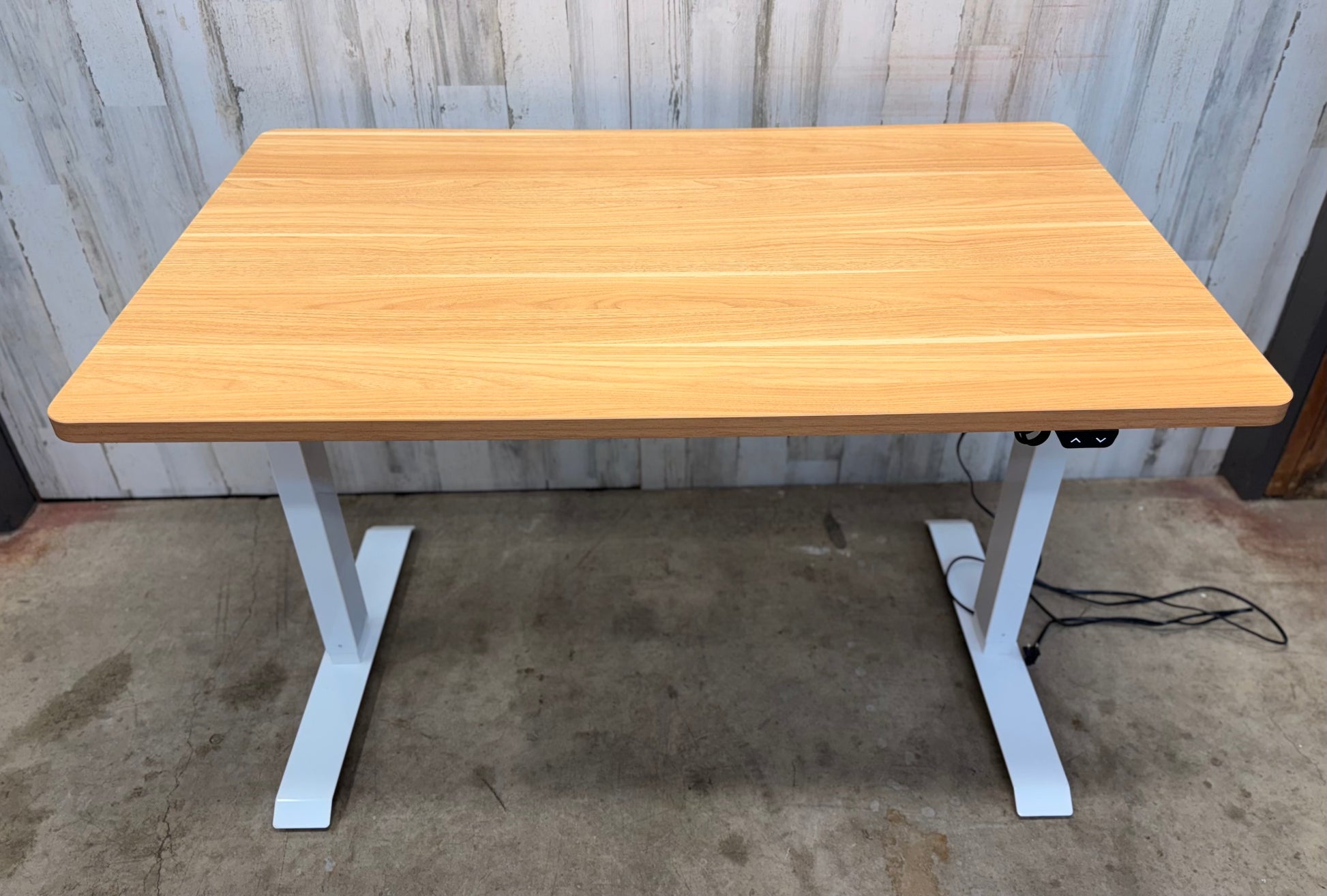 FlexiSpot electric adjustable height desk with a light wood top and white base. Smooth lift operation allows easy transition between sitting and standing positions. Works perfectly and is in excellent condition.
