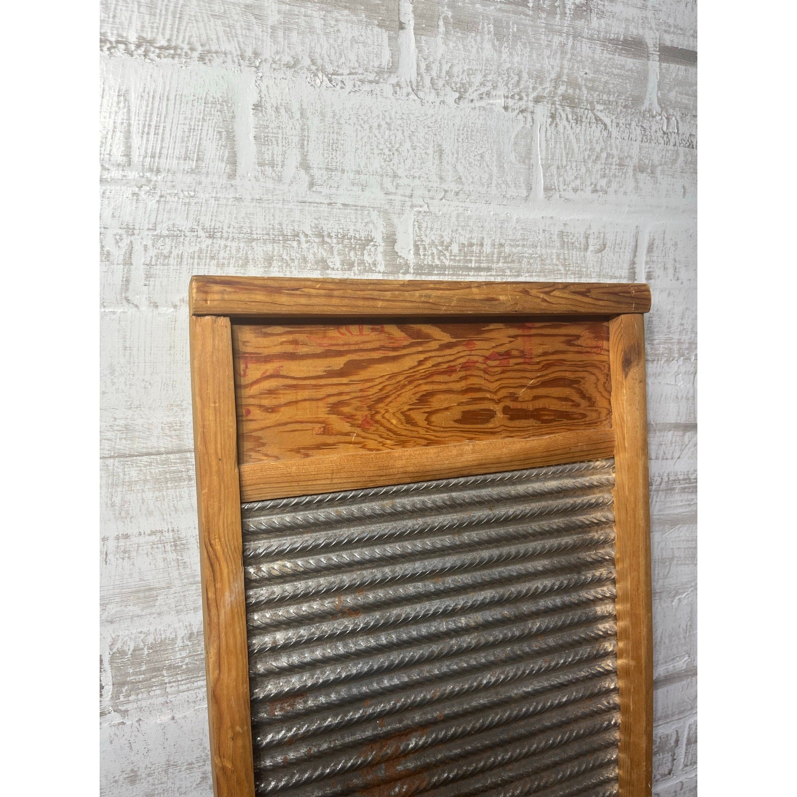 The board has a wooden frame with a metal surface consisting of ridged, corrugated metal strips, traditional washboard, a laundry tool used for hand washing clothes, it is 23” long, 12.5” wide