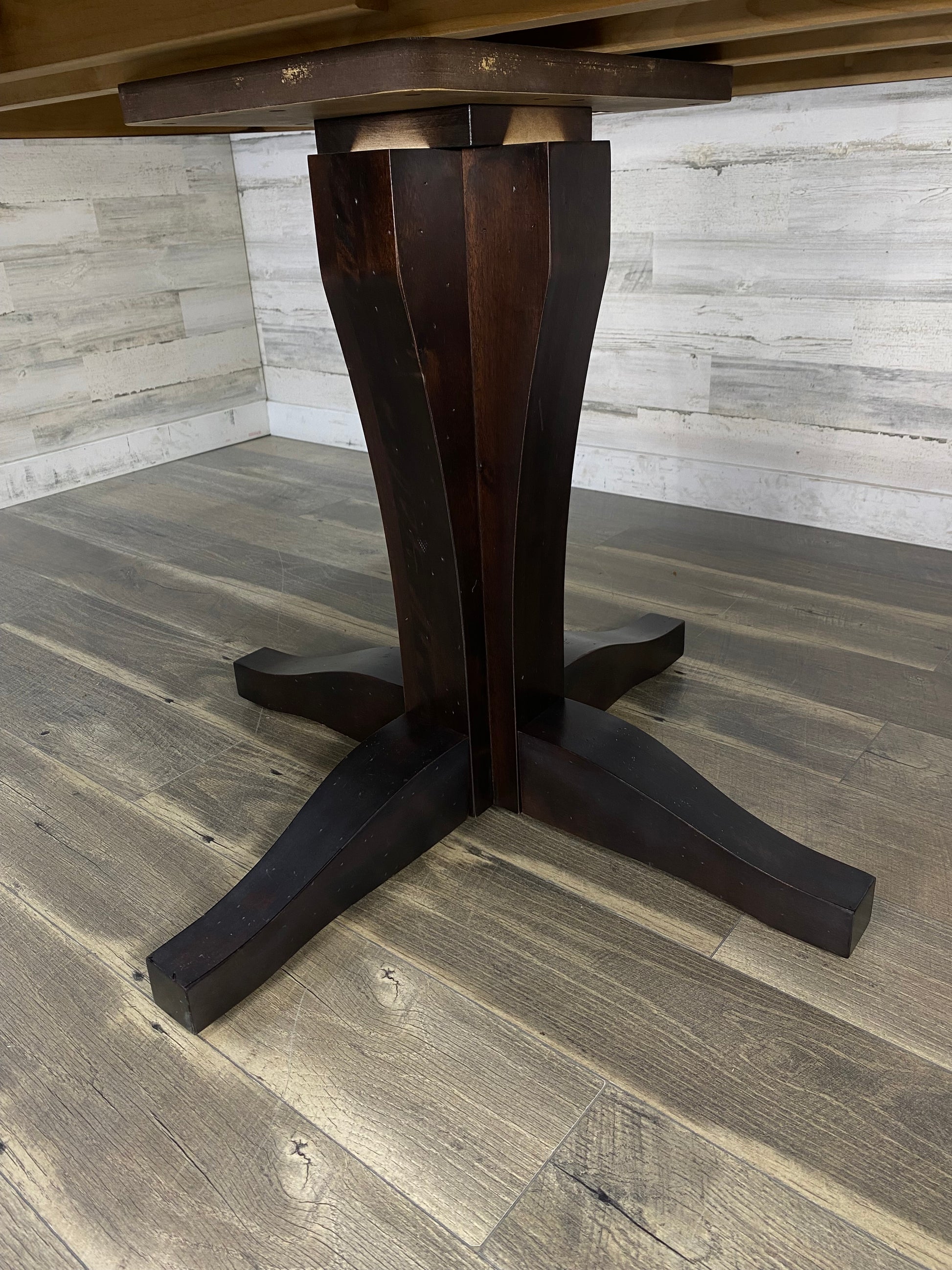 Black dining set with medium brown stained top. 4 matching chairs. Very good pre owned condition with a few small scratches- see pics. Very sturdy solid wood and name brand!