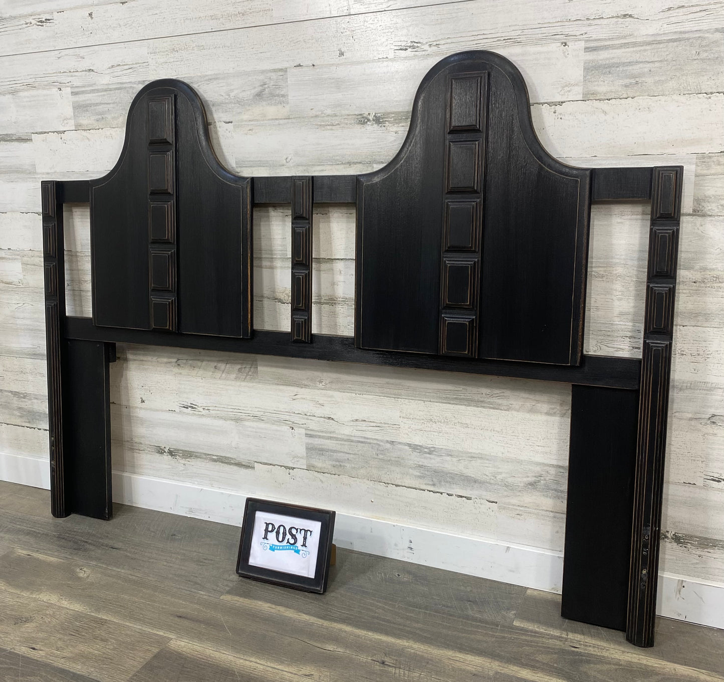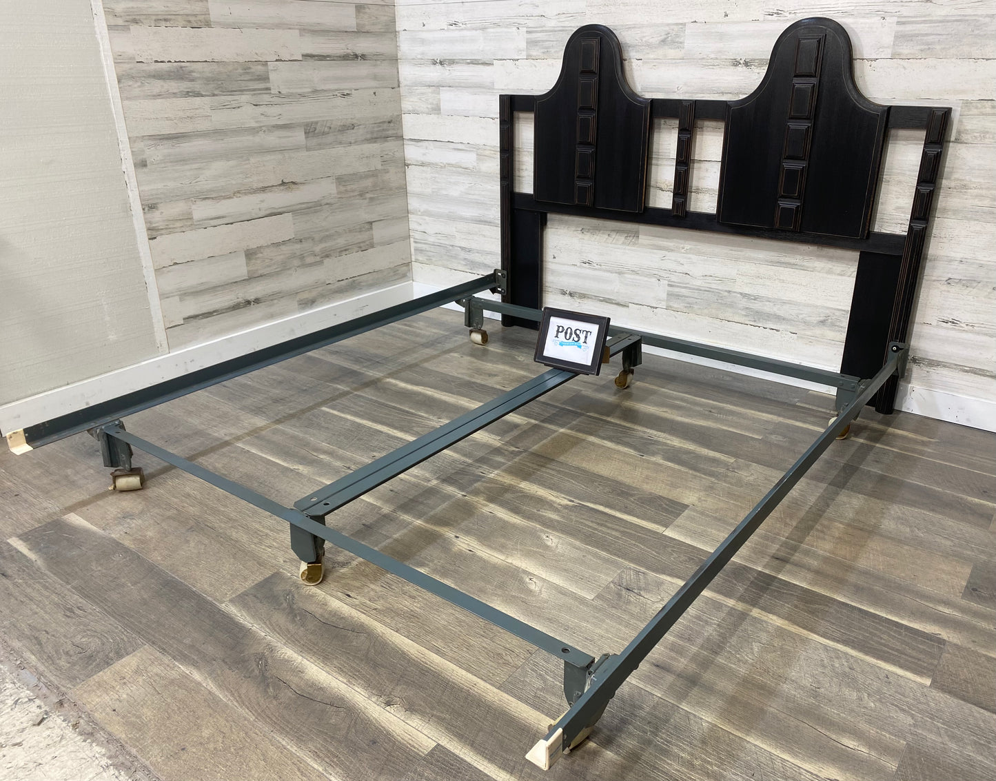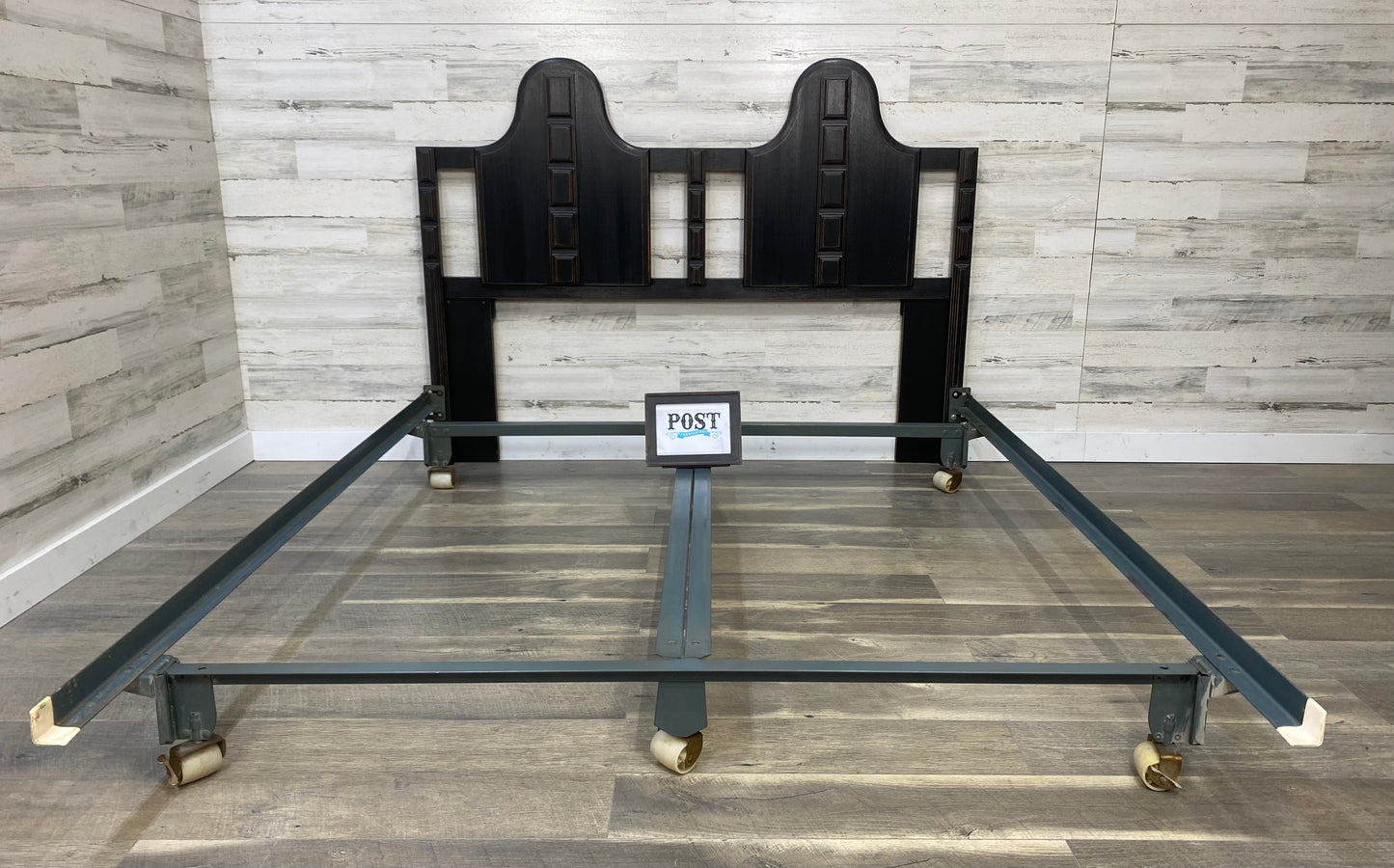 Refinished vintage queen size headboard and metal frame. Black, distressed and sealed. Modern style.