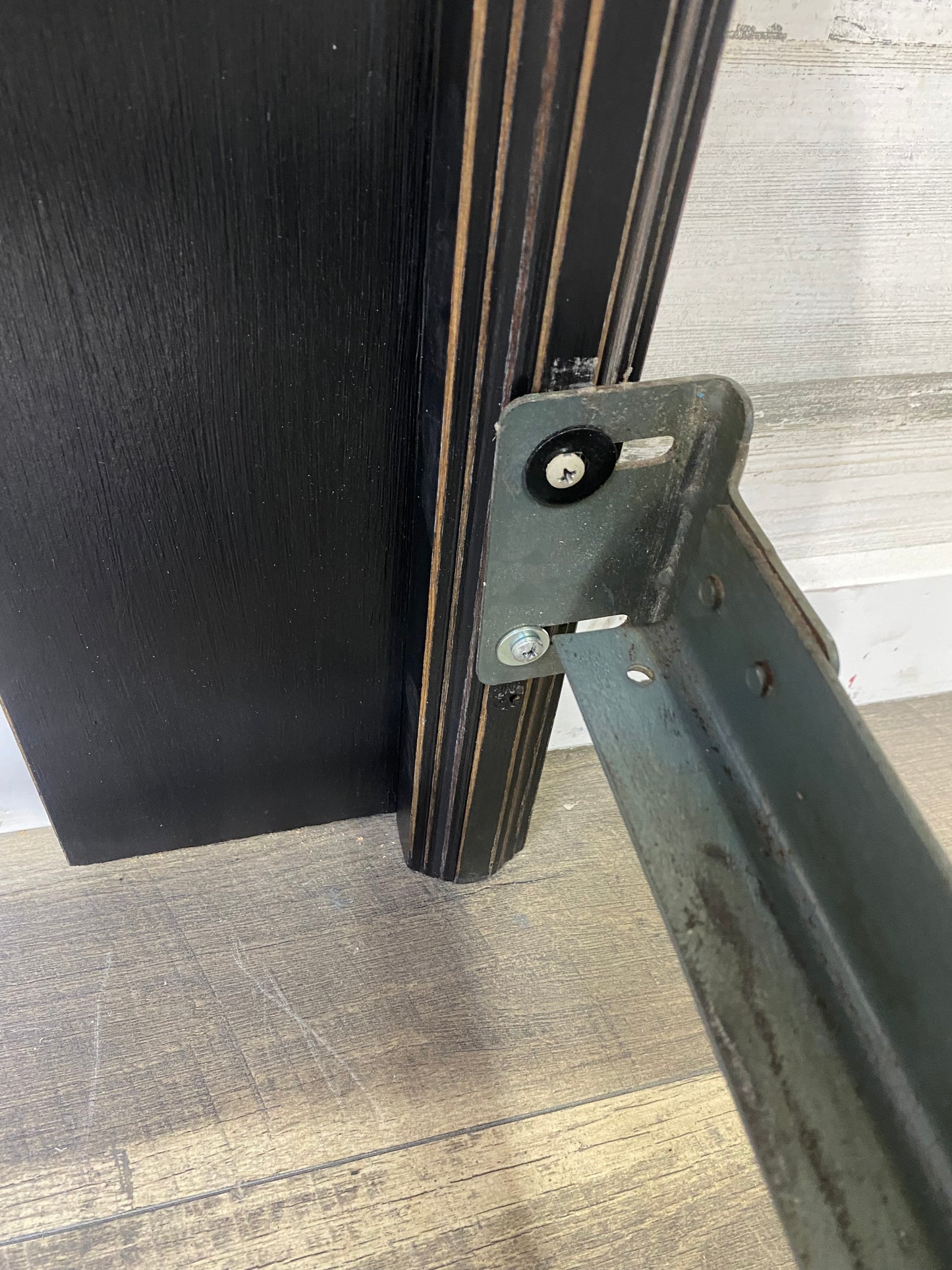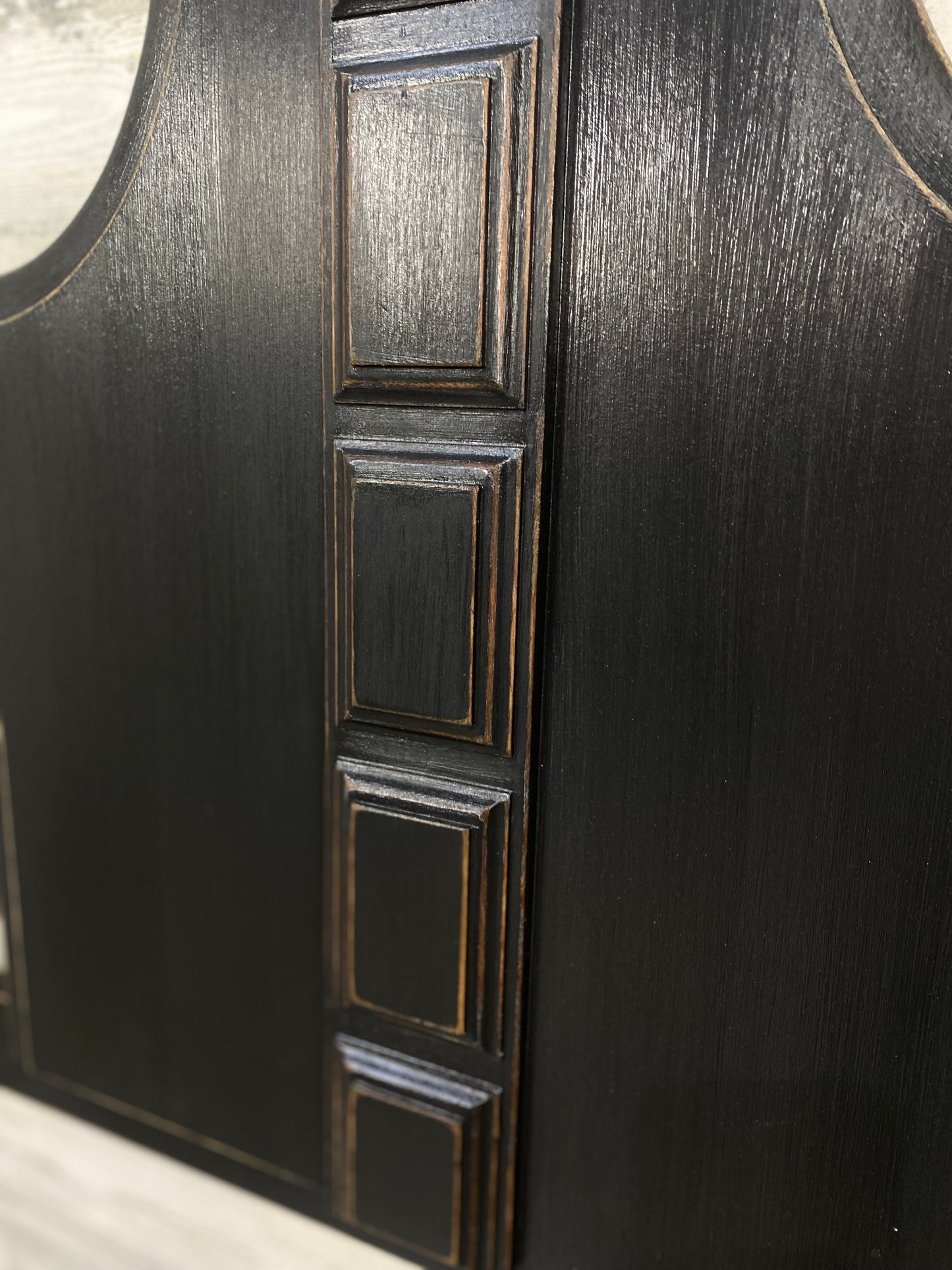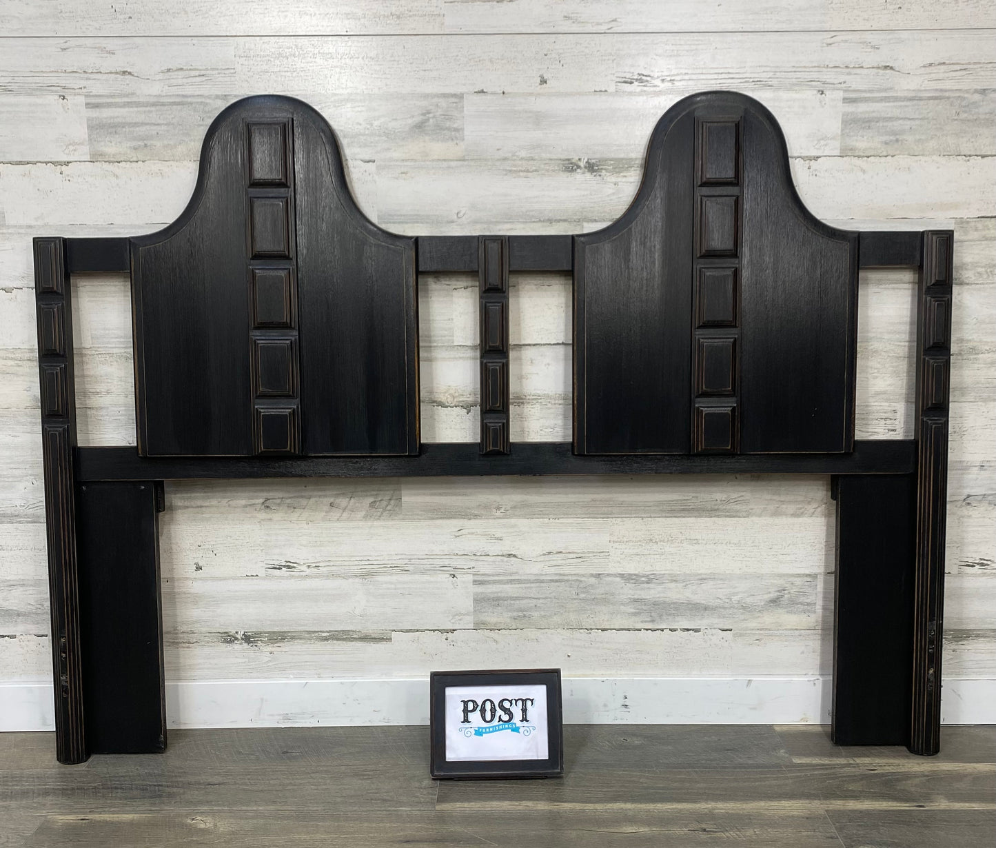 Refinished vintage queen size headboard and metal frame. Black, distressed and sealed. Modern style.