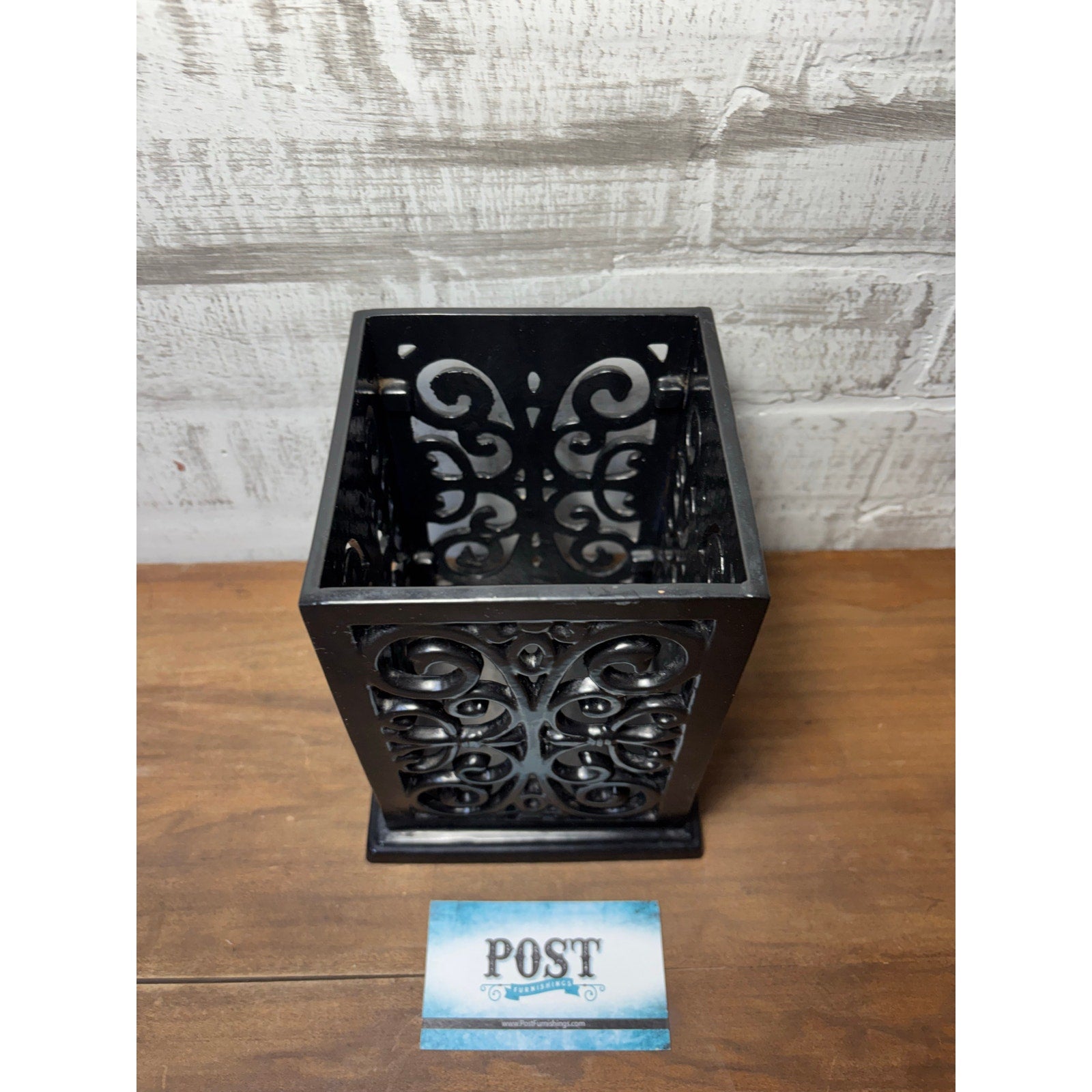 a rectangular shape and appears to be a decorative holder, for utensils, pens, or small items, made of cast iron, it’s is 7” tall, 4.5” by 4.5”