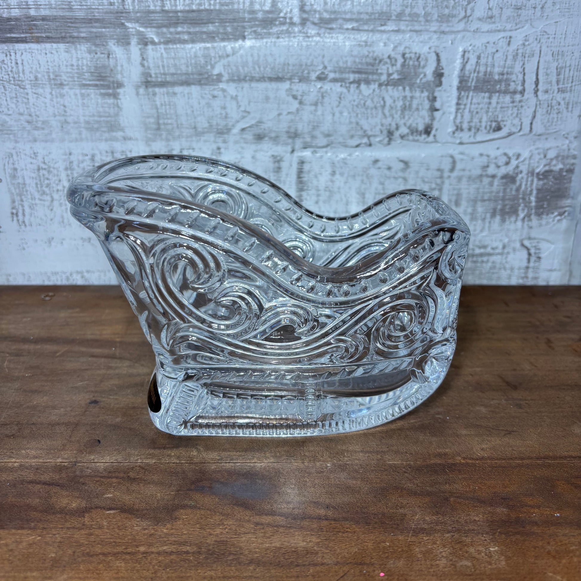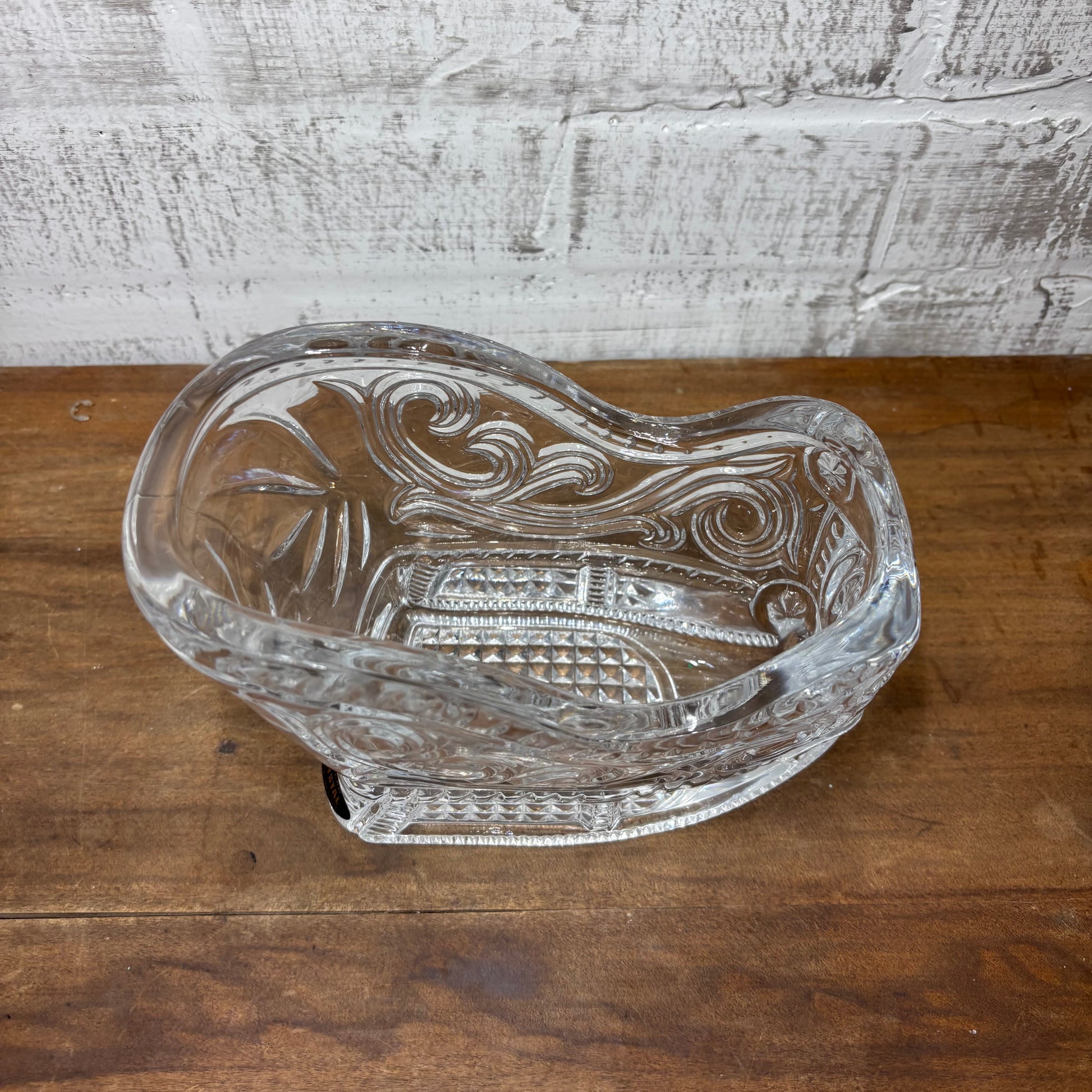 24% lead crystal made in USA by Avon, textured sleigh shaped centerpiece, 6.5” long, 4.5” tall, 4” wide
