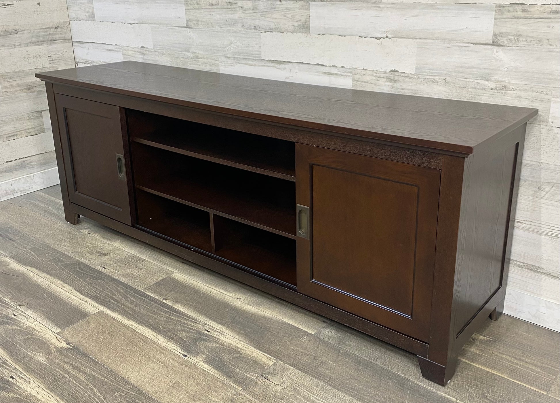 Dark wood tv stand. Rolling front doors. Lots of storage. Great pre owned condition with a couple scratches, see pics.