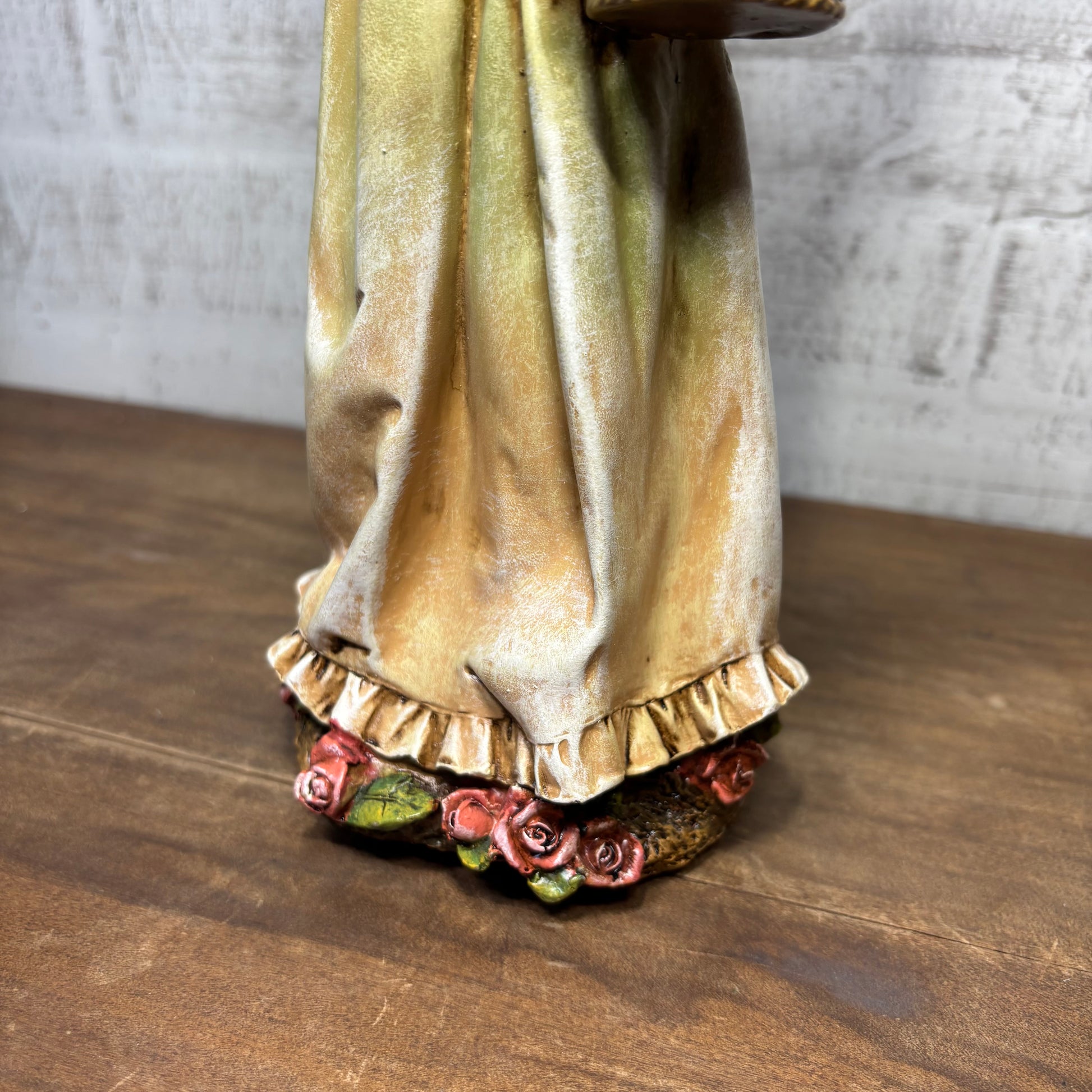 angel girl figurine with a nodding head featuring, great condition made of resin, small basket filled with roses, 12” tall, 5” wide