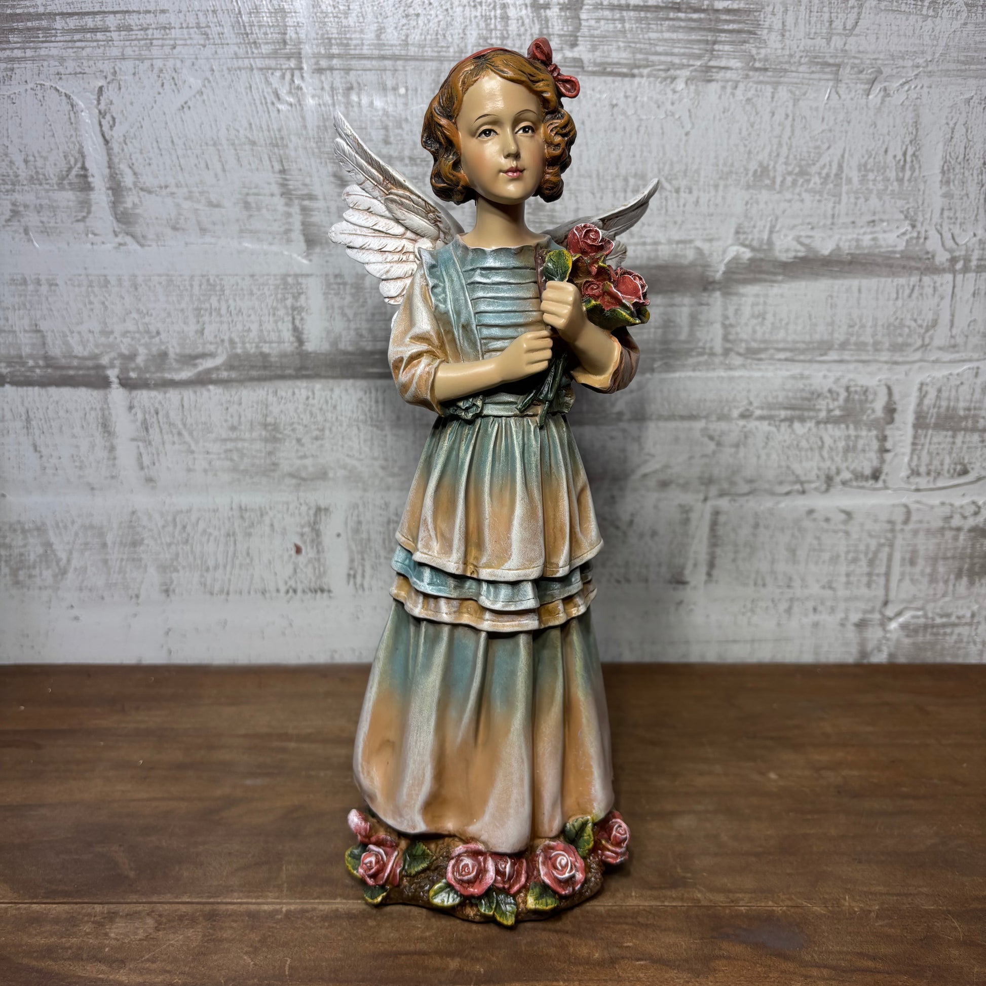 angel girl figurine with a nodding head featuring, great condition made of resin, small bouquet filled with roses, wearing a blue ombré dress, 12” tall, 5” wide