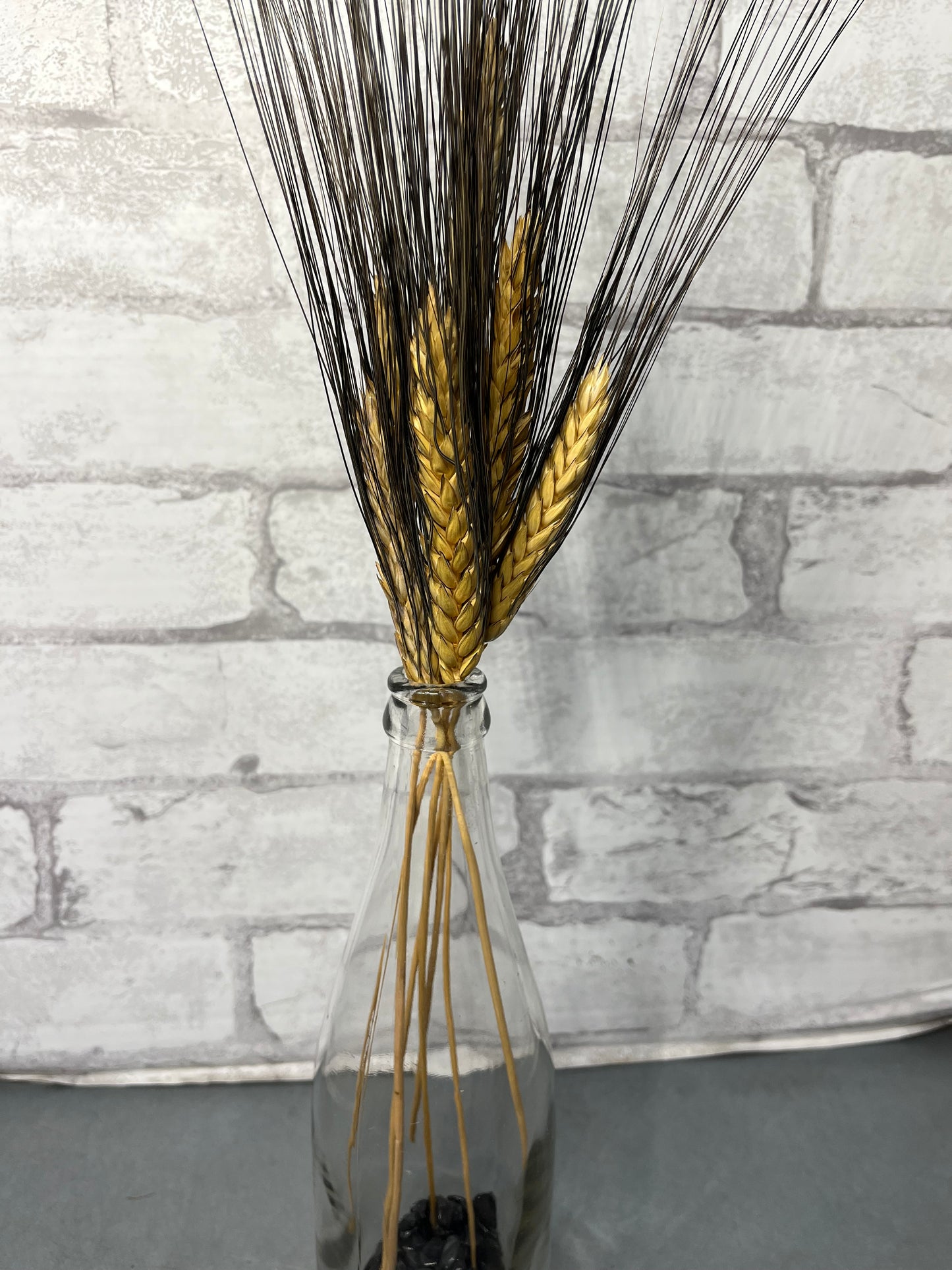 Solid glass bottle with black rock detailing, and dried wheat grass great decorative piece, bottle is 9.5” tall, 21” tall with grass