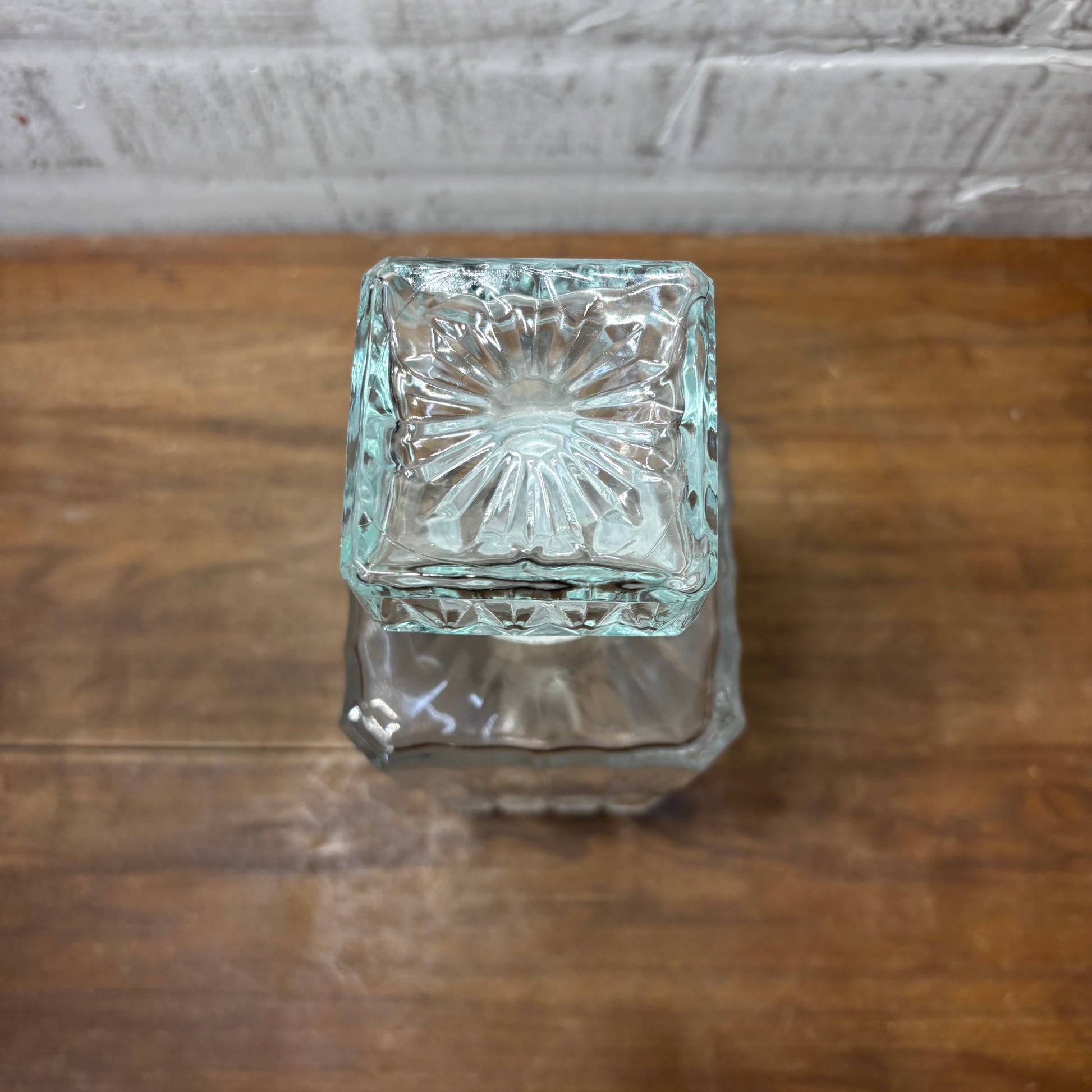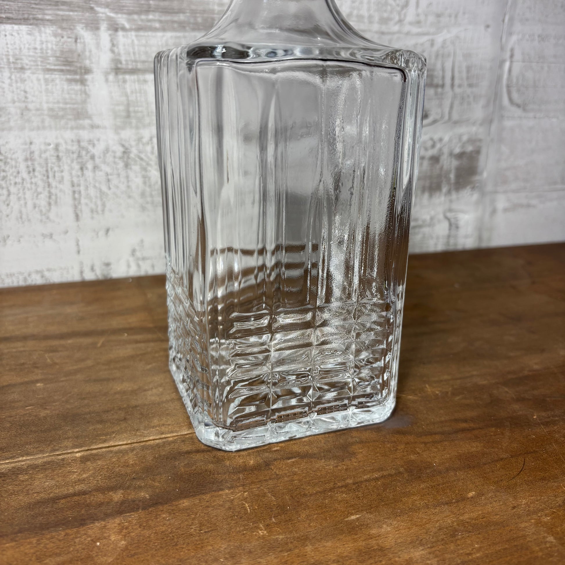 Solid glass decanter bottle, removable top with a rubber stopper, 9.5” tall, 3.5” by 3.5”