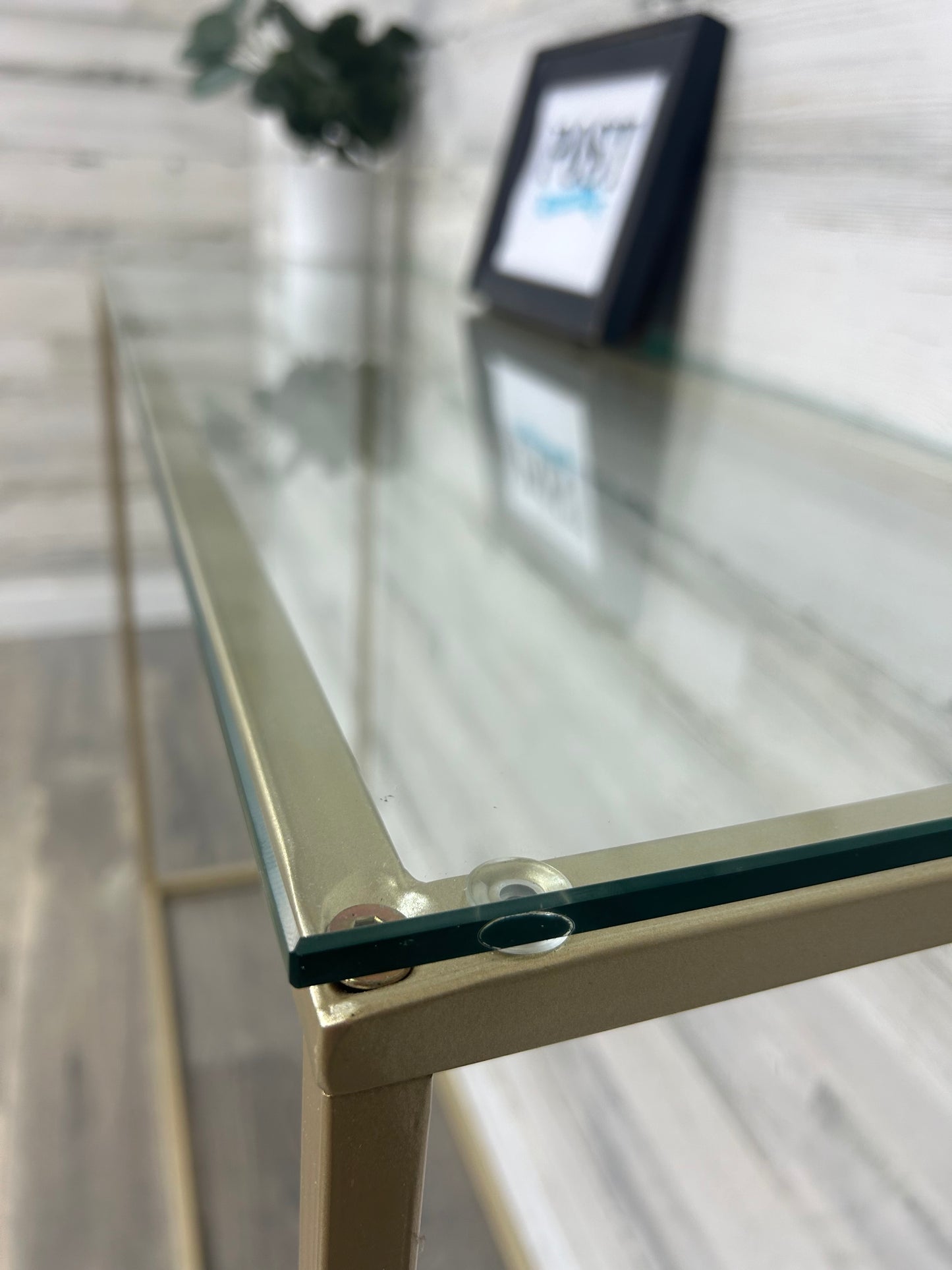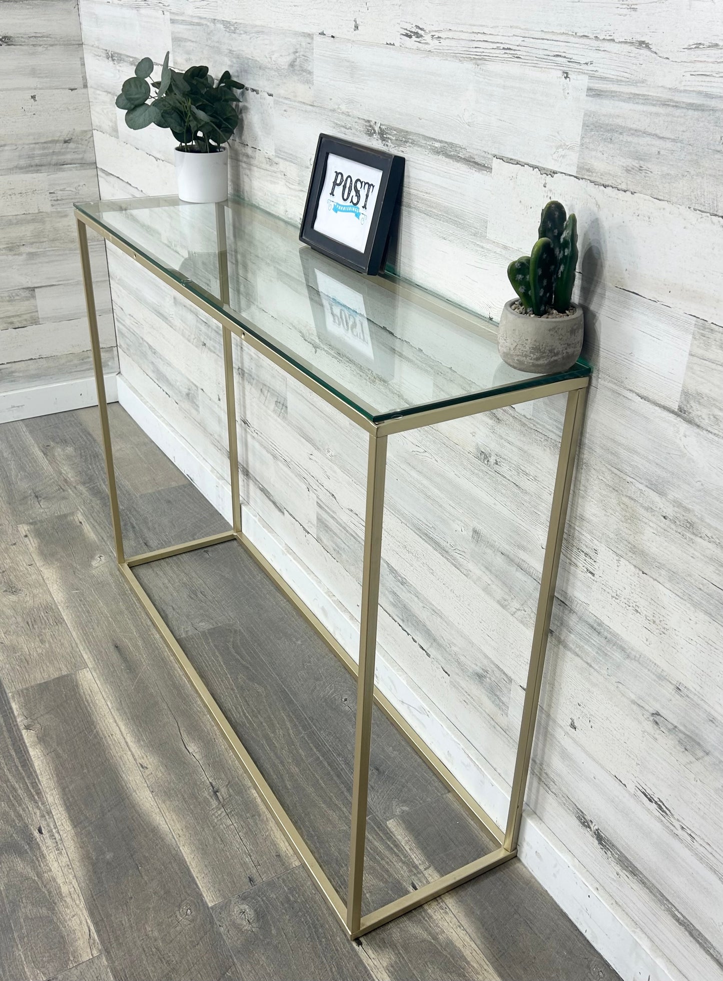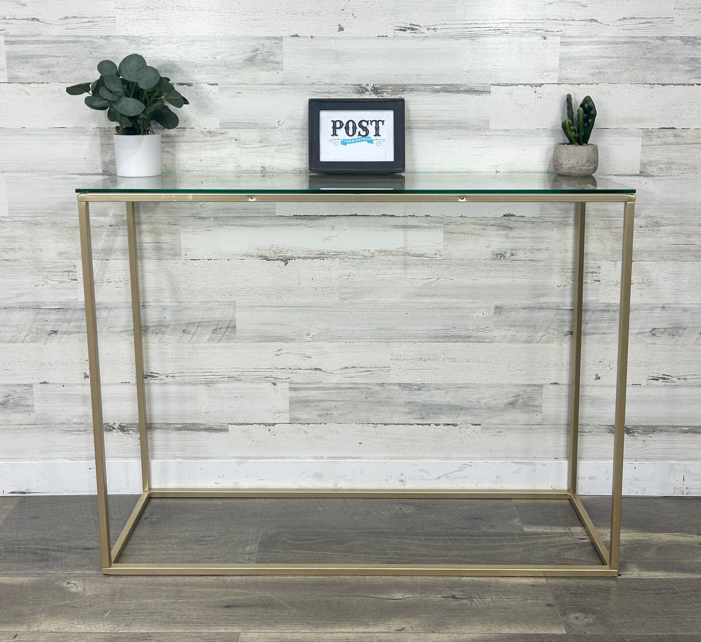 Modern gold frame glass entryway table glass is suction but easily to remove. Light weight and elegant design.