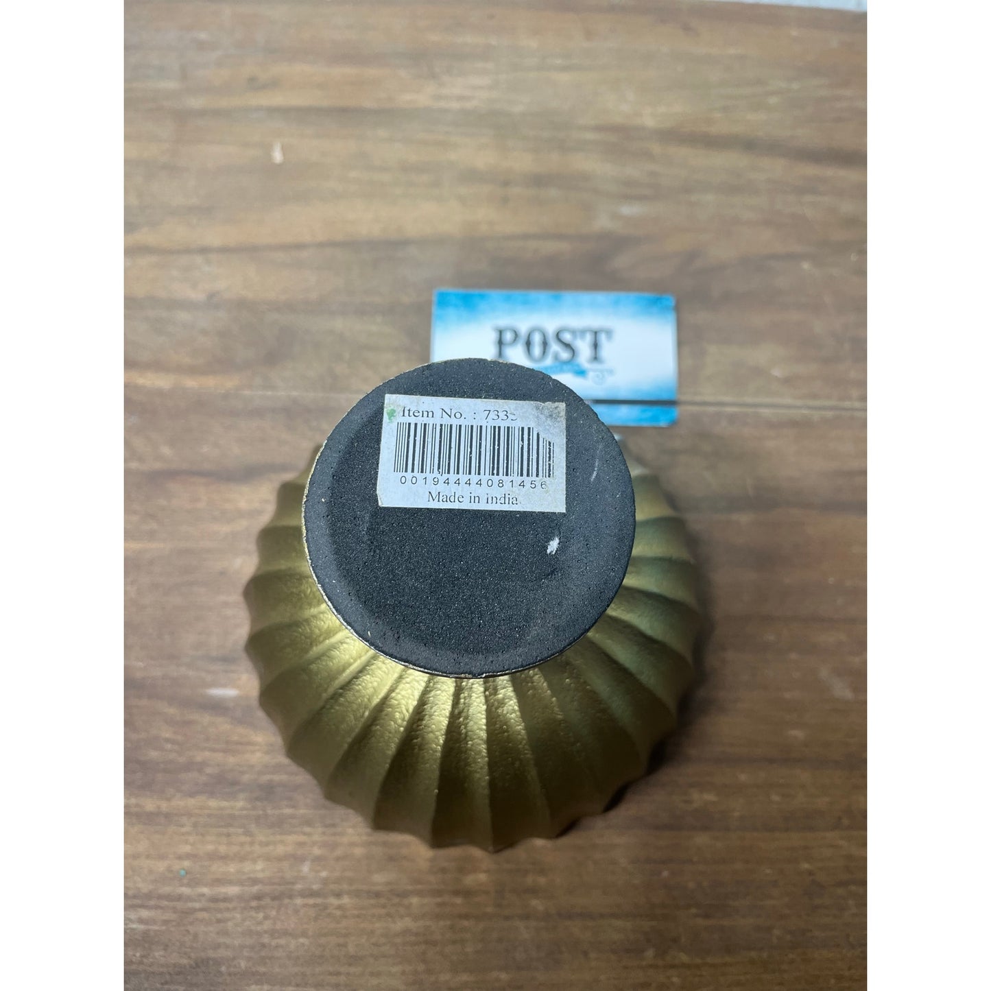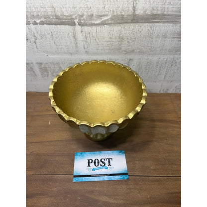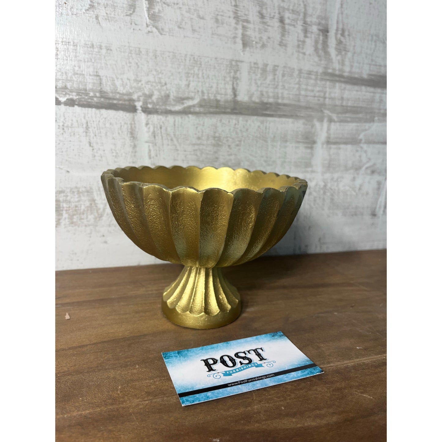 classic compote shape with a warm gold finish and a scalloped rim, made out of metal, gold color, great for, Decorative vase or centerpiece, it is 4.5” tall, 6” wide