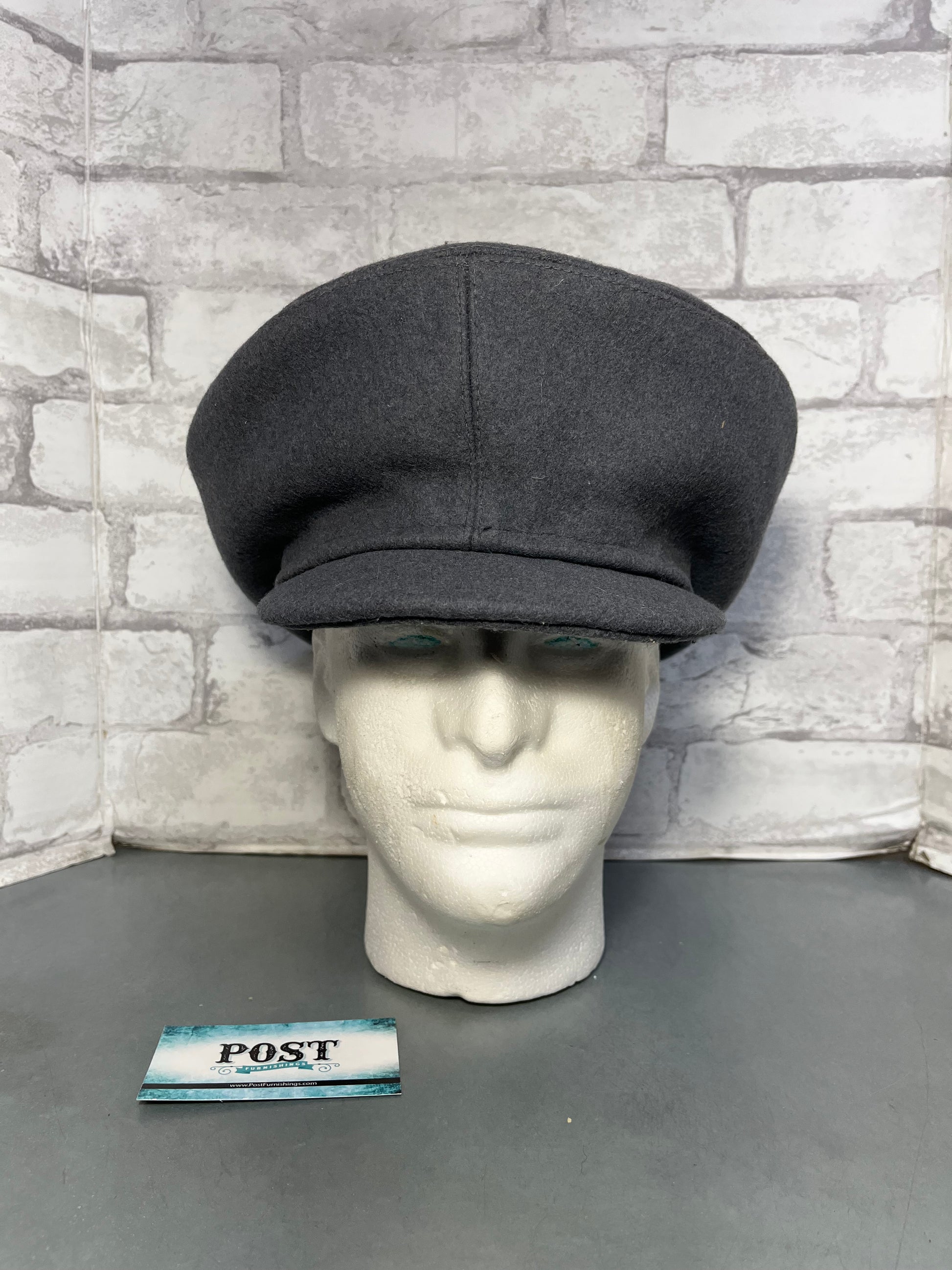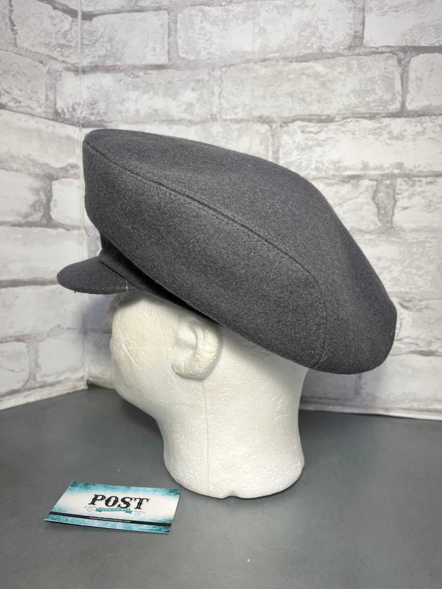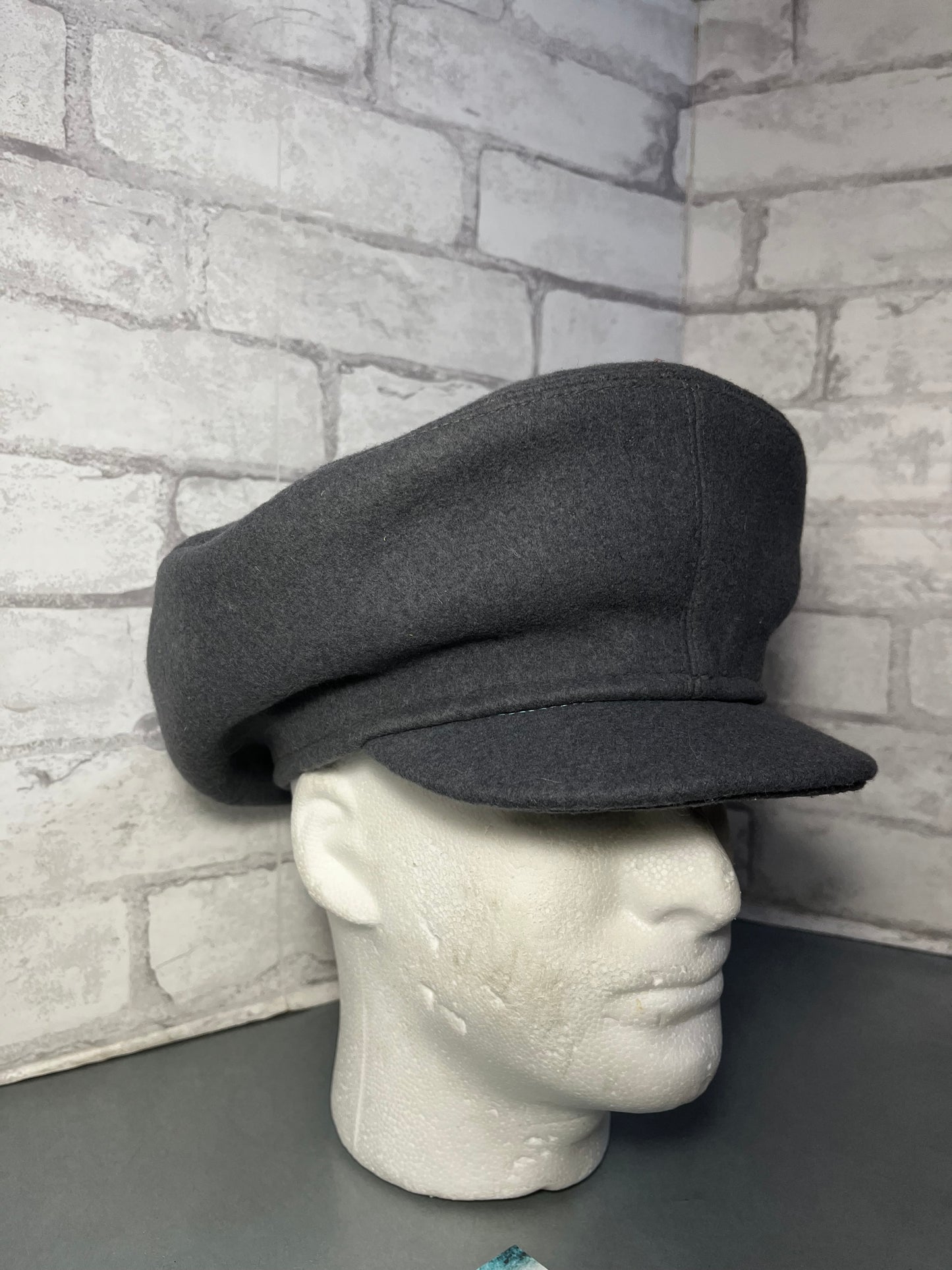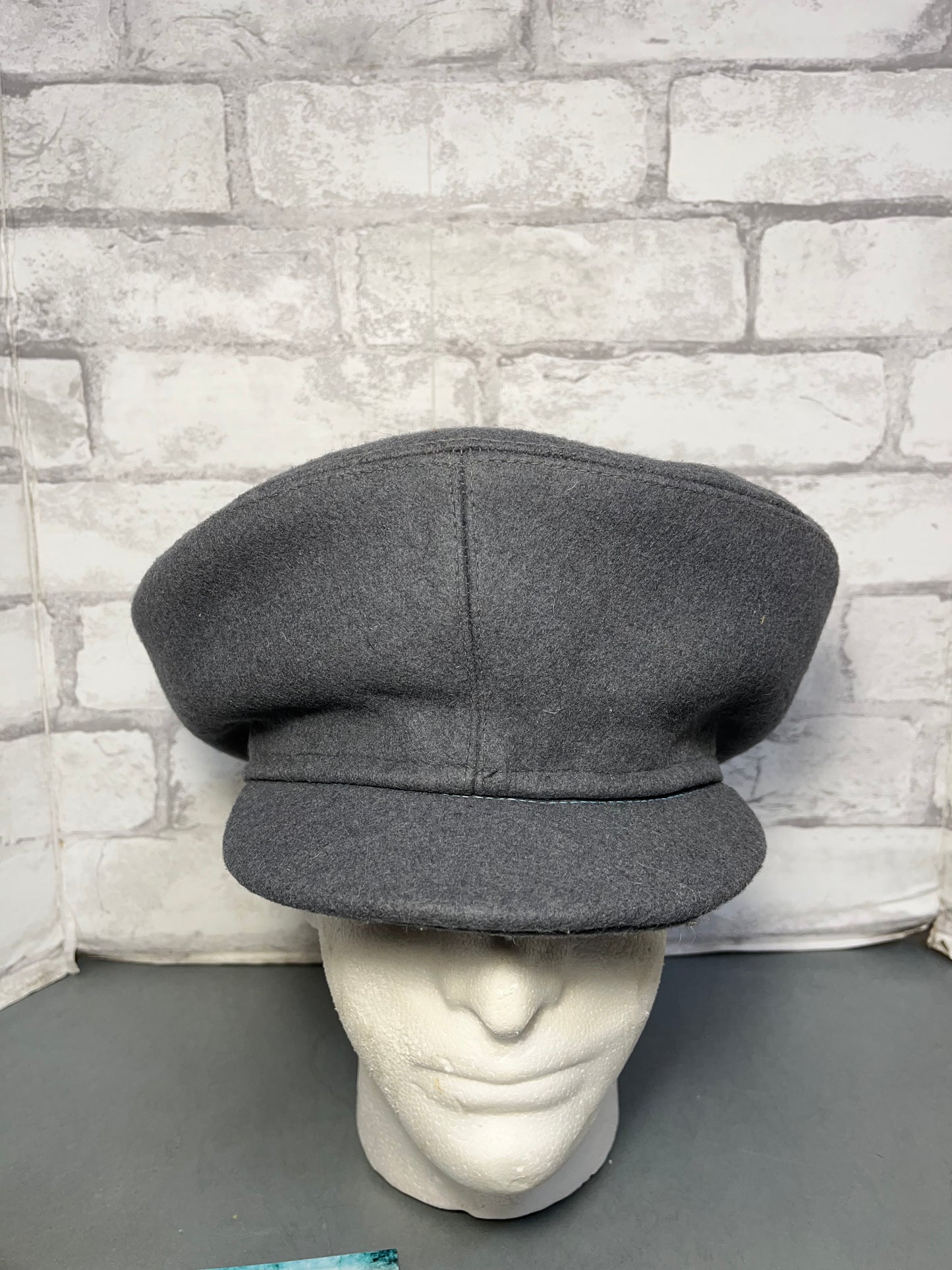 Made out of wool material, cadet style cap, gray wool color, 7” by 7” head opening