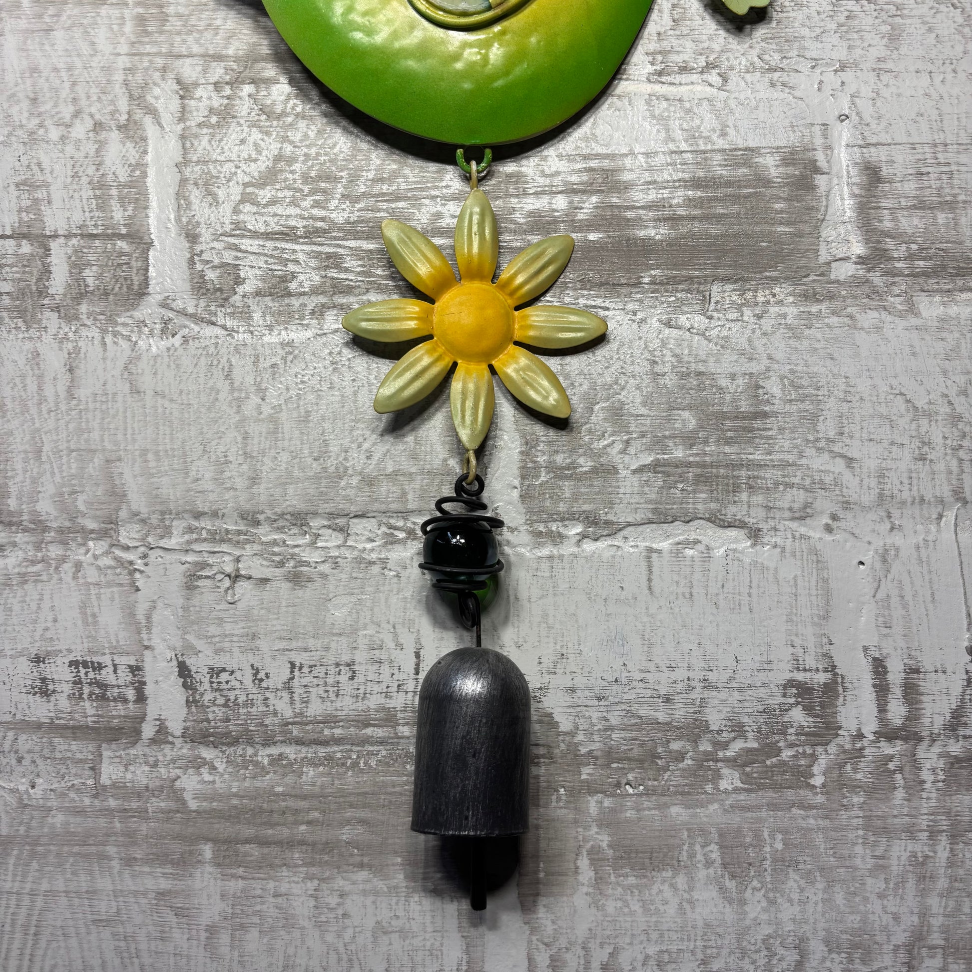 Green metal bird with a yellow flower wind chime, functional and loud, 17” long