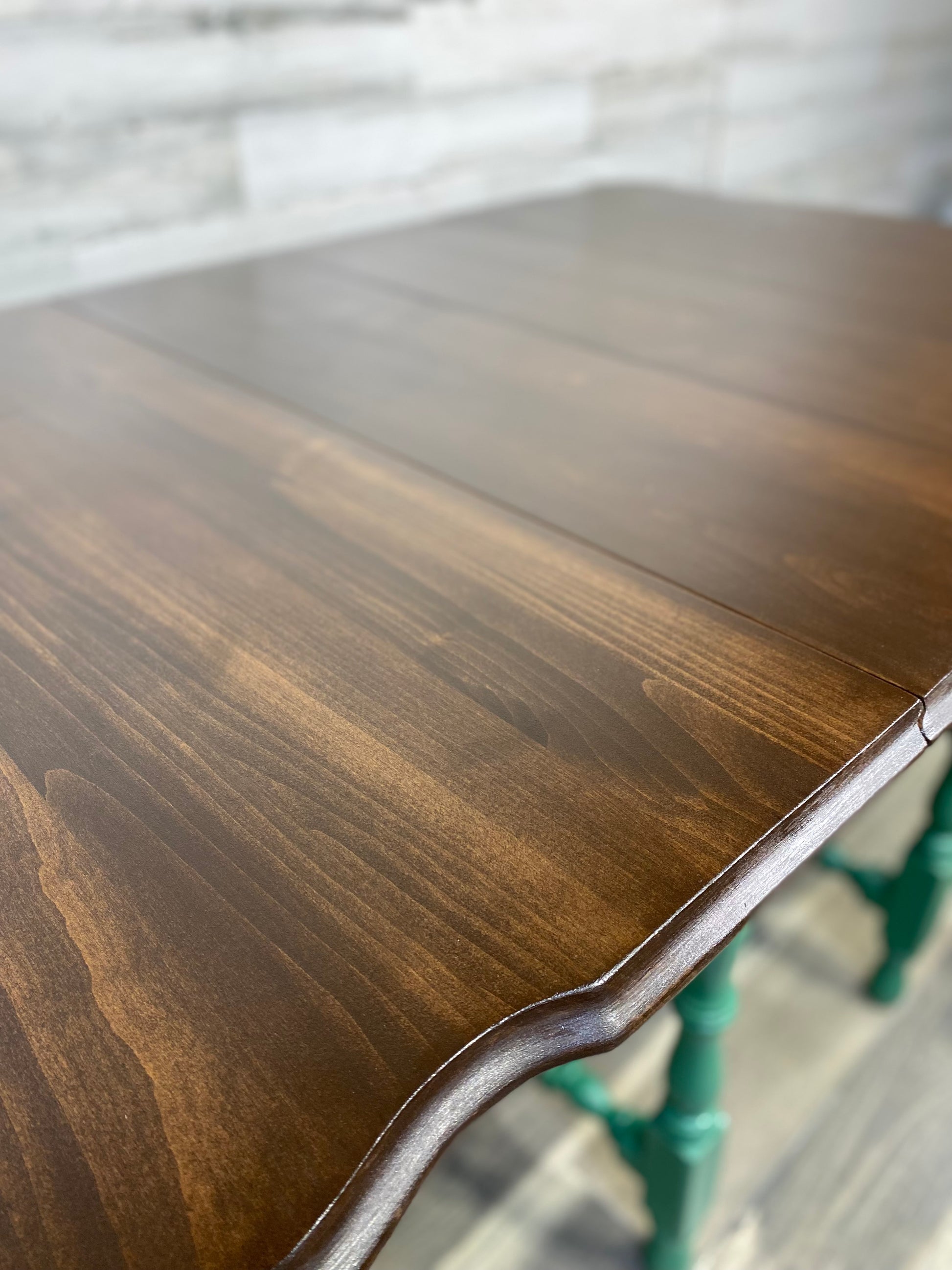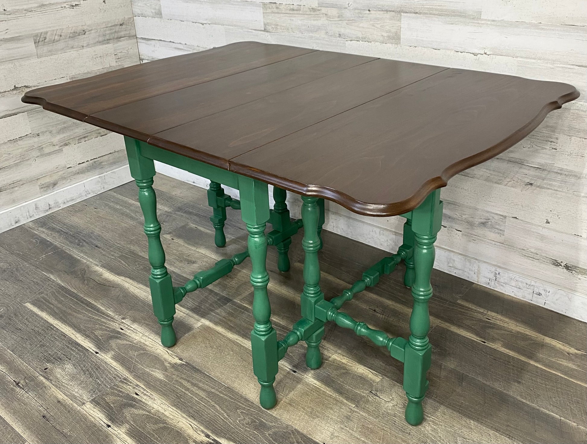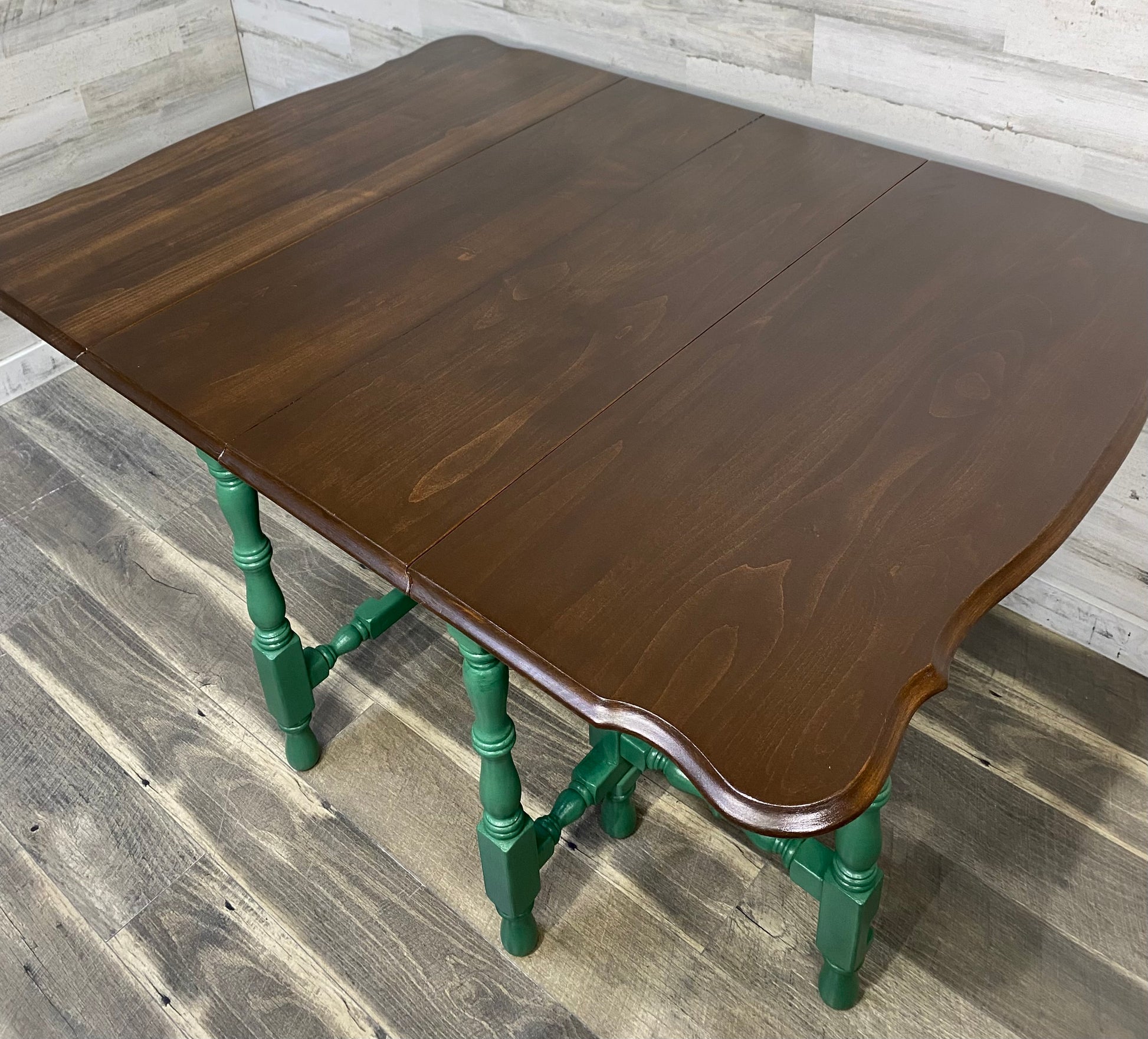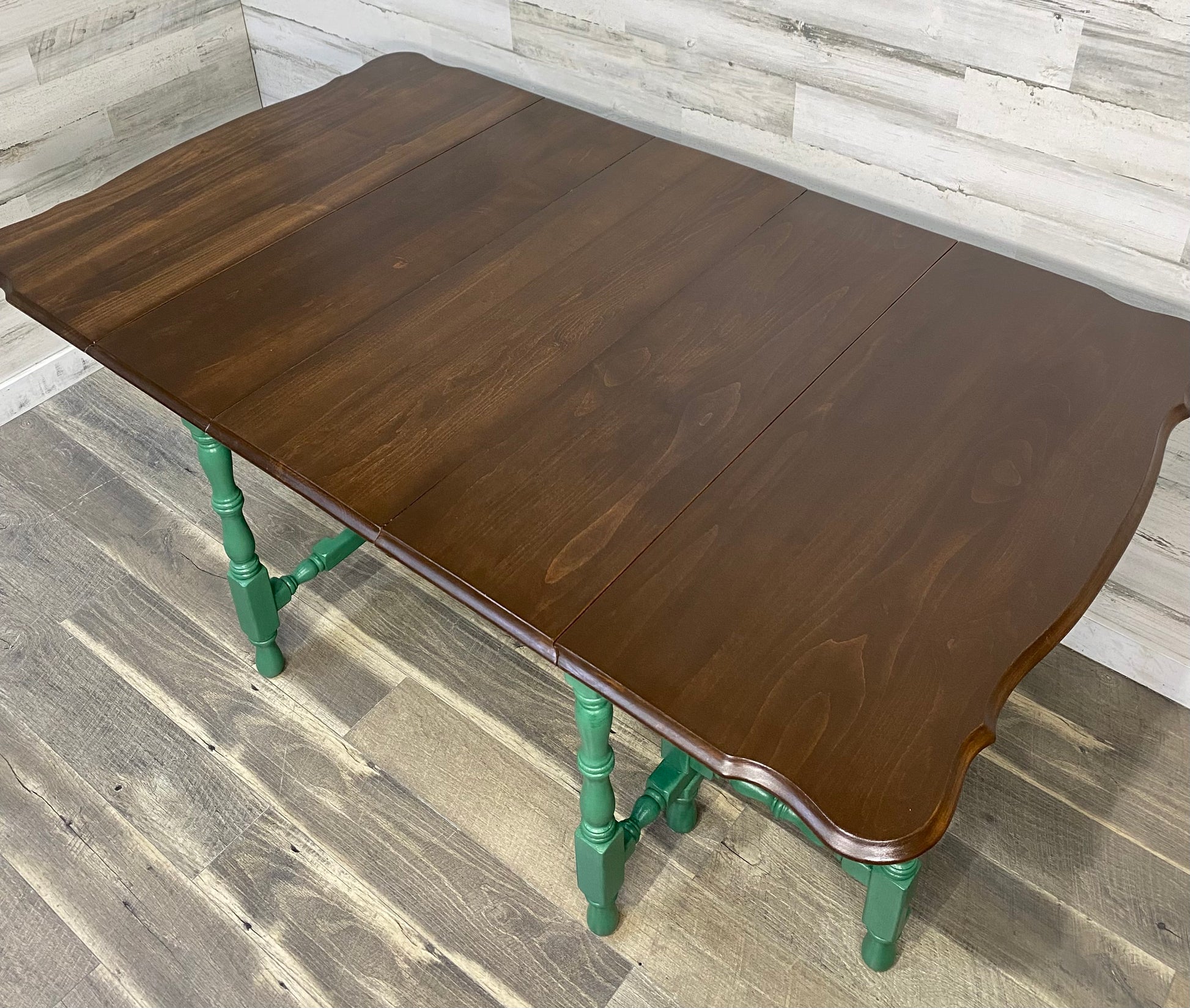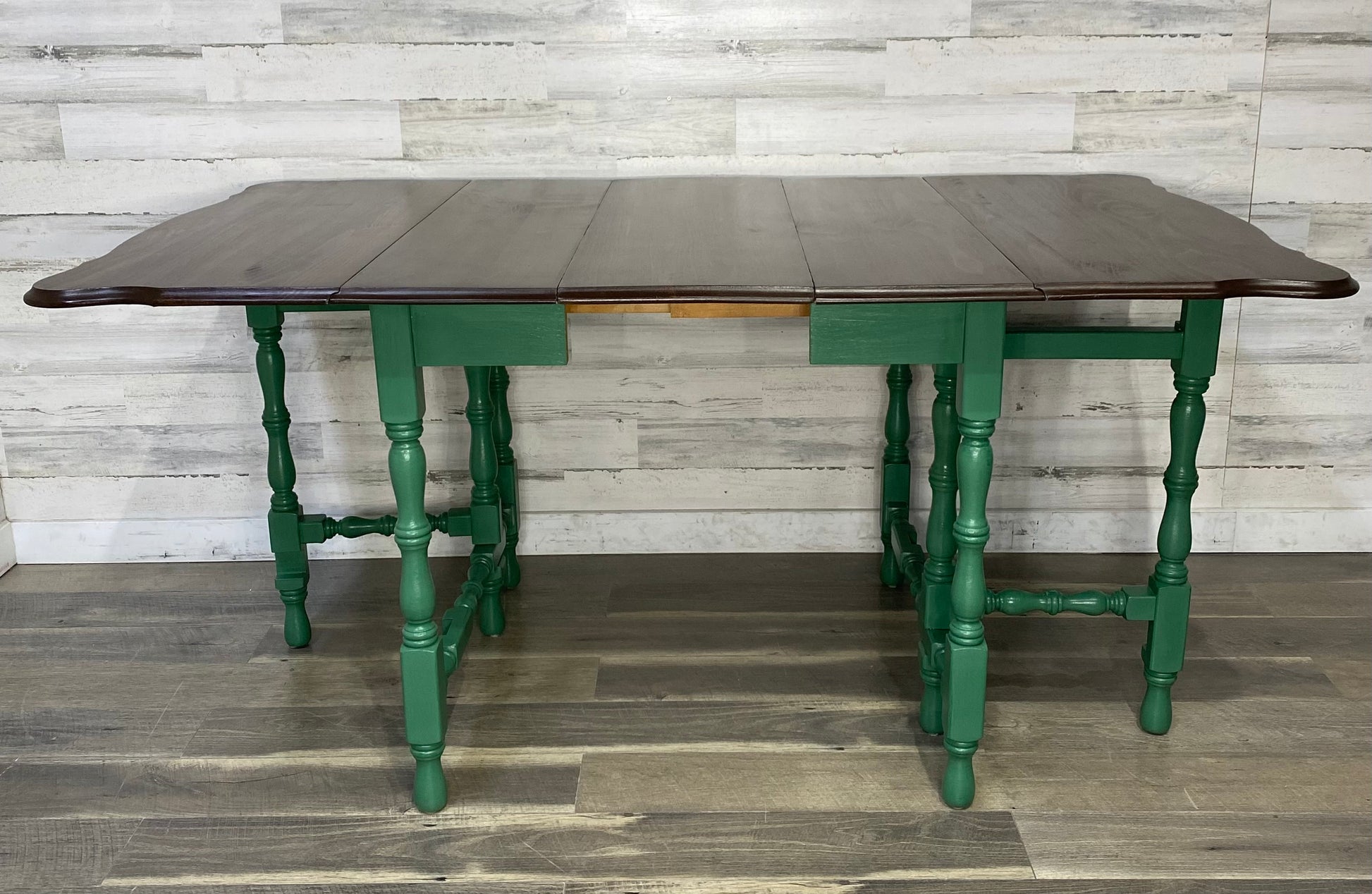Adorable double drop leaf dining table. Country cottage style, refinished dark green and dark stained top. Comes with 1 removable leaf and the 2 end leaves drop down. This size table is great for small or large spaces with its ability to adjust!