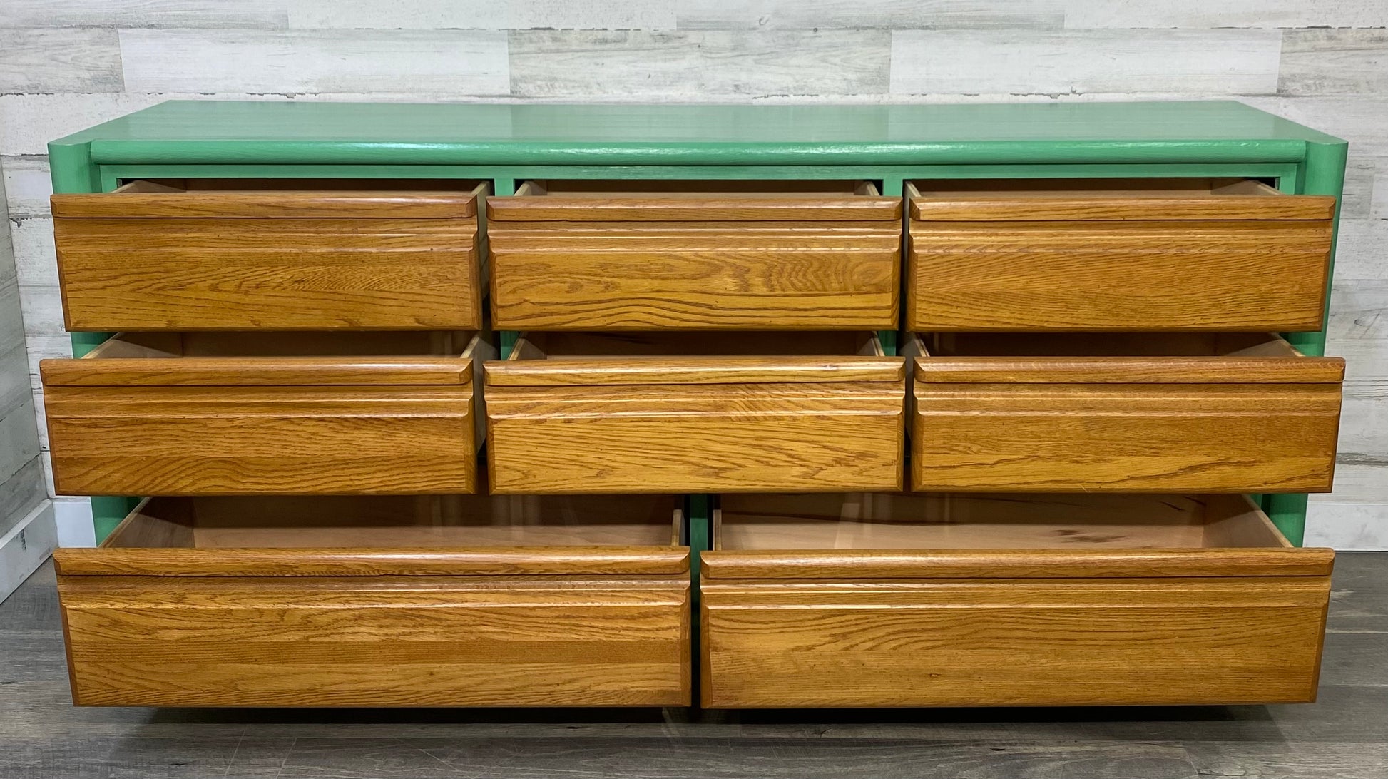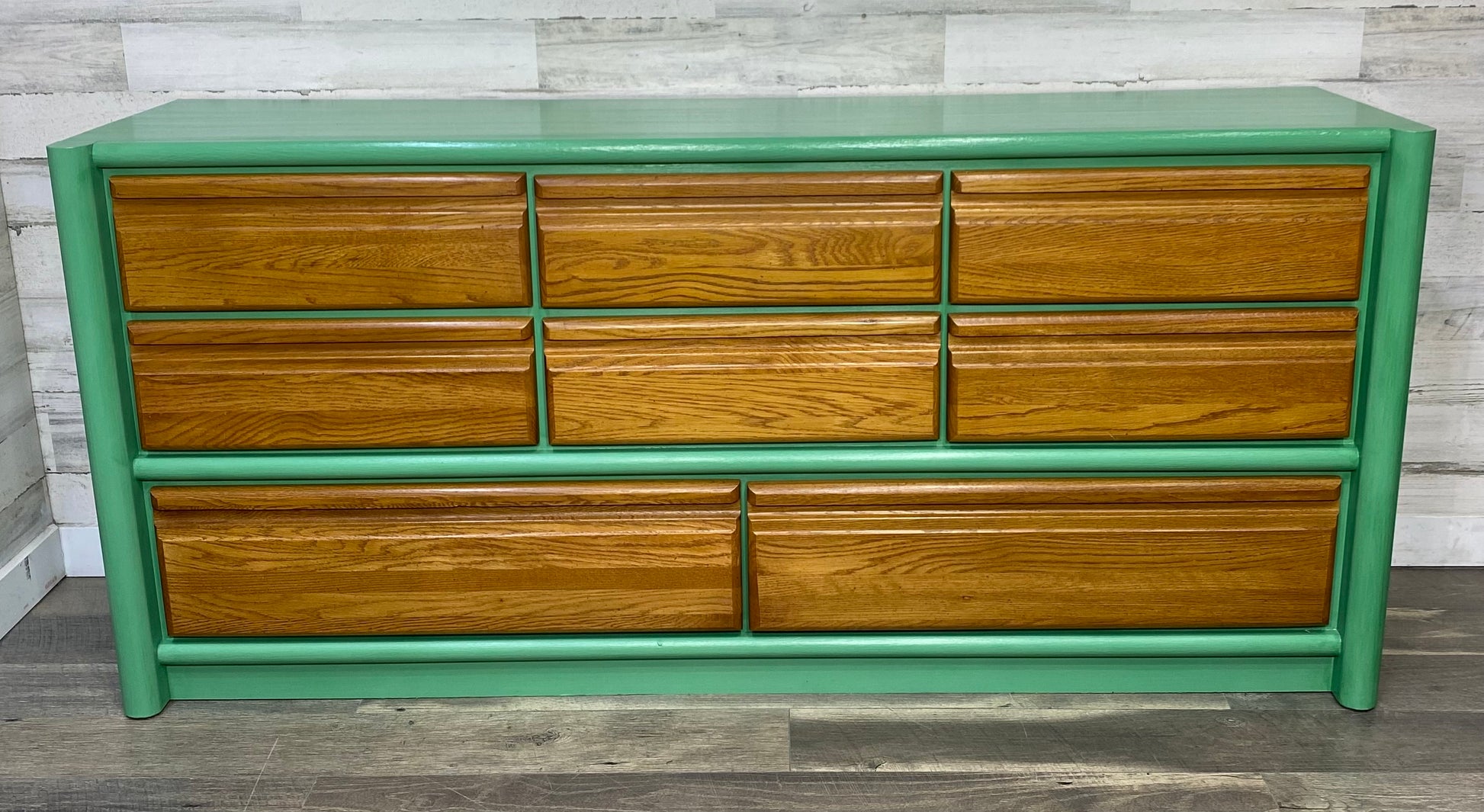 Oak refinished dresser. Outer shell is a seafoam green and drawers are natural oak. 8 drawers total and all slide properly. Heavy and sturdy and built to last!
