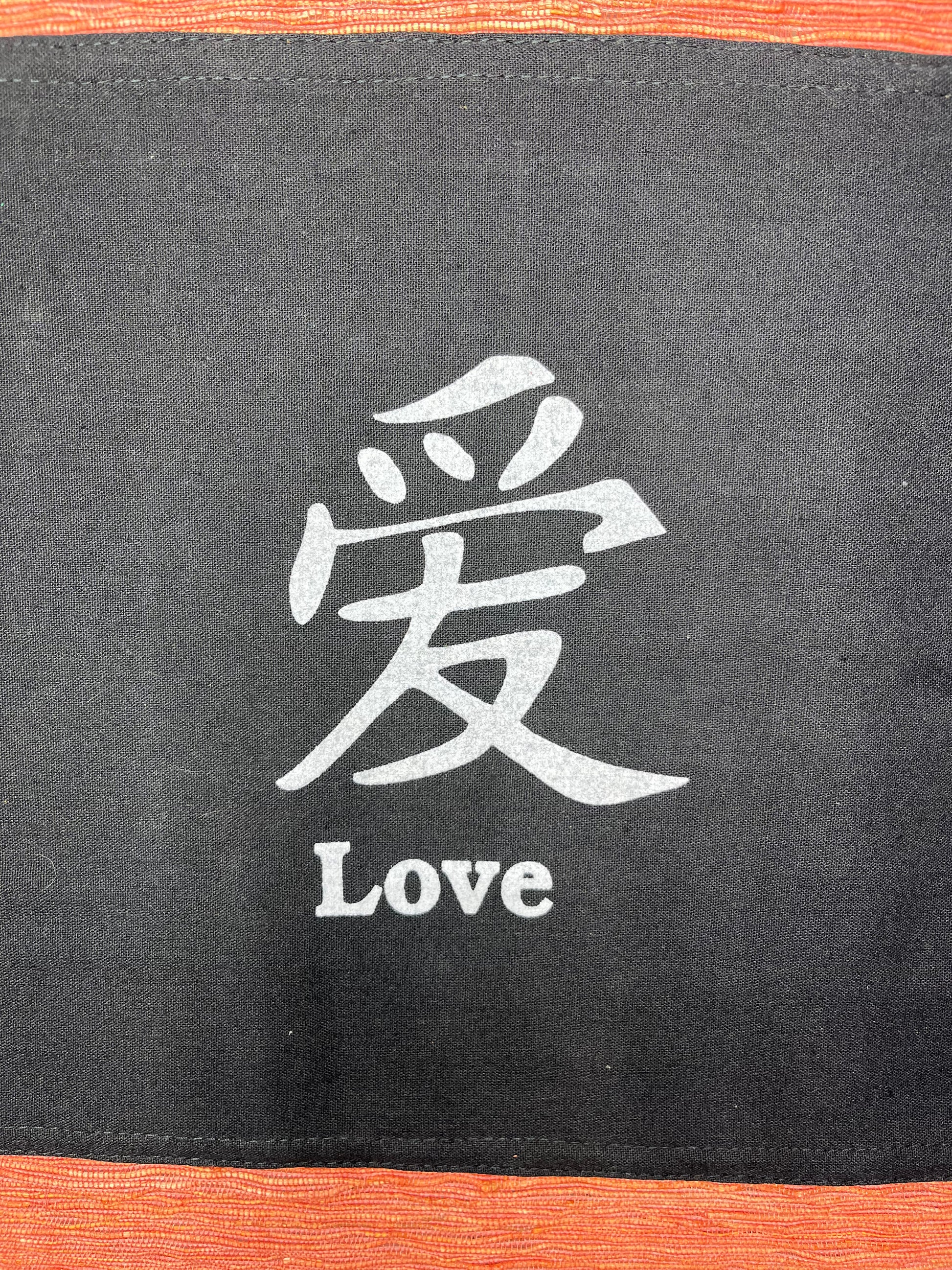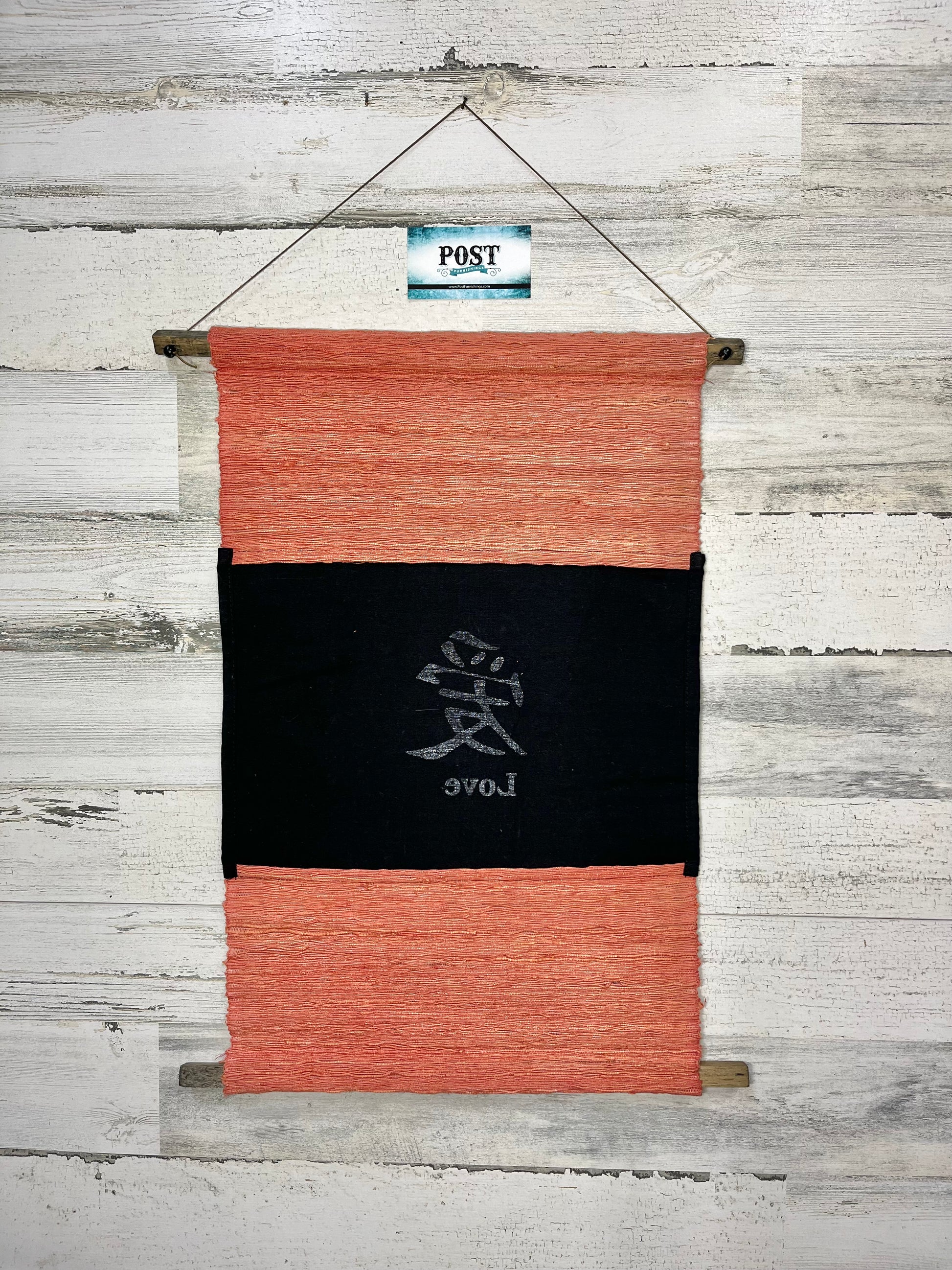 Hanging inspirational scroll with the symbolism of “love”, can be displayed on the wall and stored by rolling up, salmon pink color, made of cotton material, 22” long, 17” wide