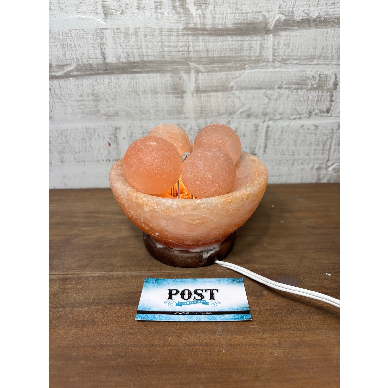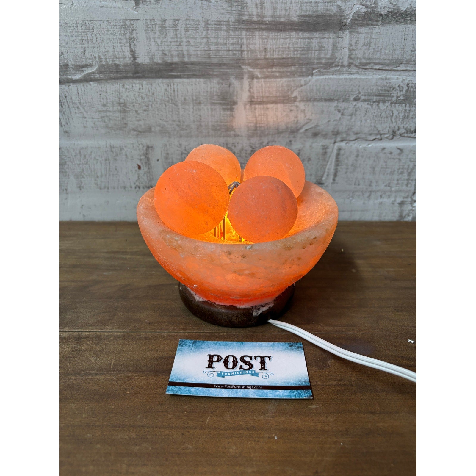 Himalayan salt lamp in the shape of a bowl, filled with several rounded salt crystal balls, emitting a warm, amber glow, it has four balls, it is 4” tall, 6” diameter