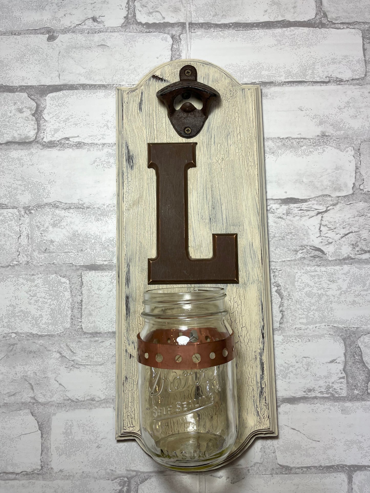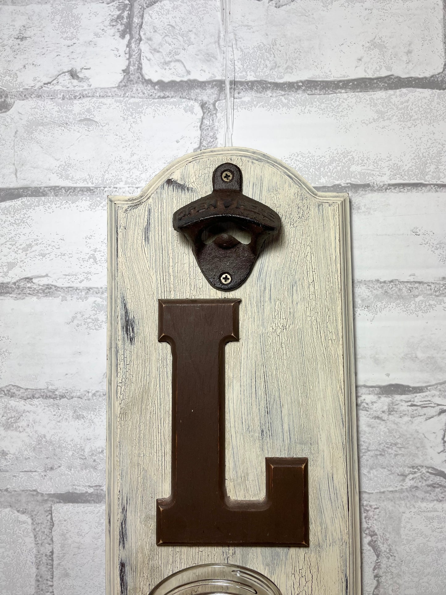 This rustic farmhouse style beer opener mount, has a mason jar attached to catch the caps, a letter “L” and a bottle opener attached to a wood board, can be mounted on the wall, it has cream color and brown accents, it is 16” long, 6” wide
