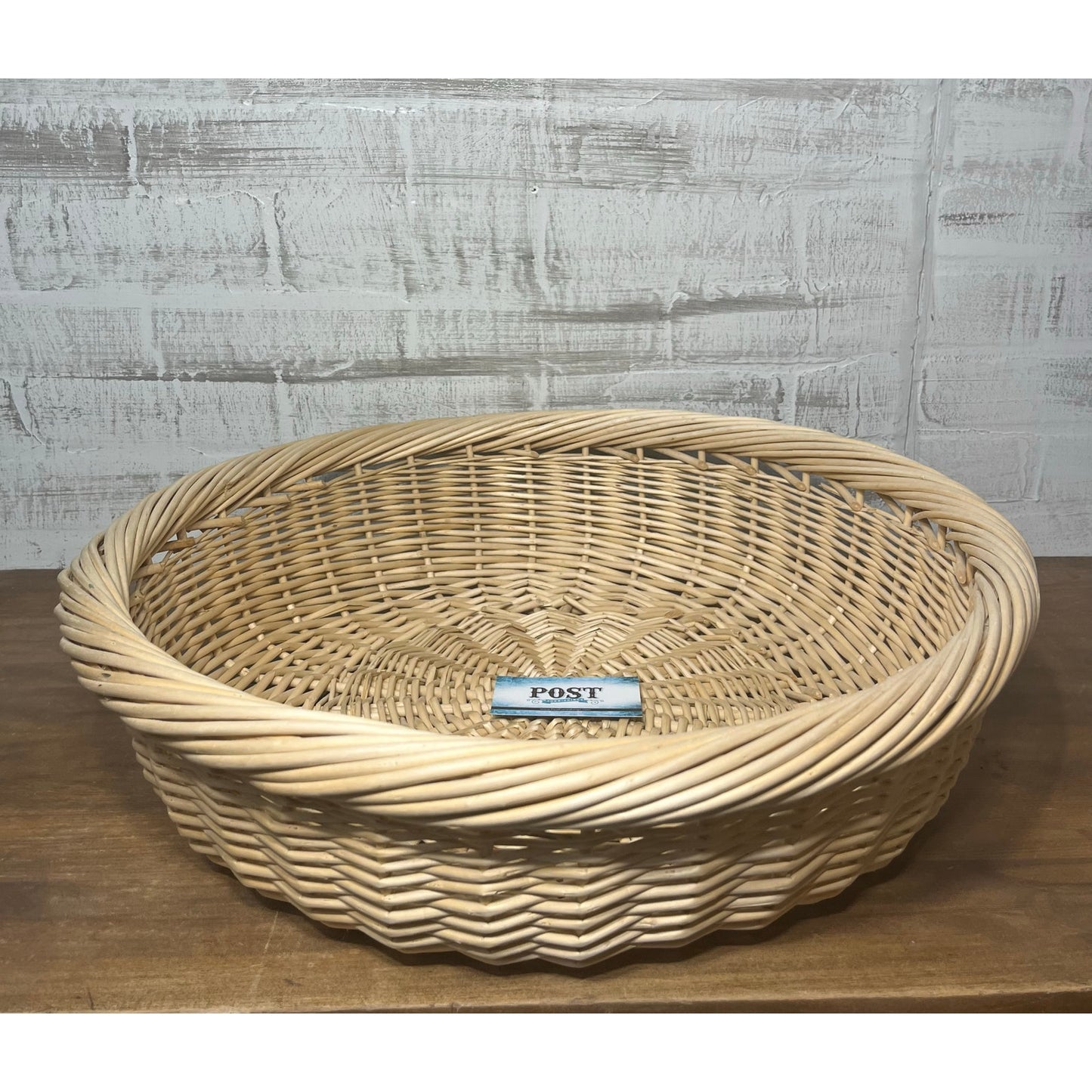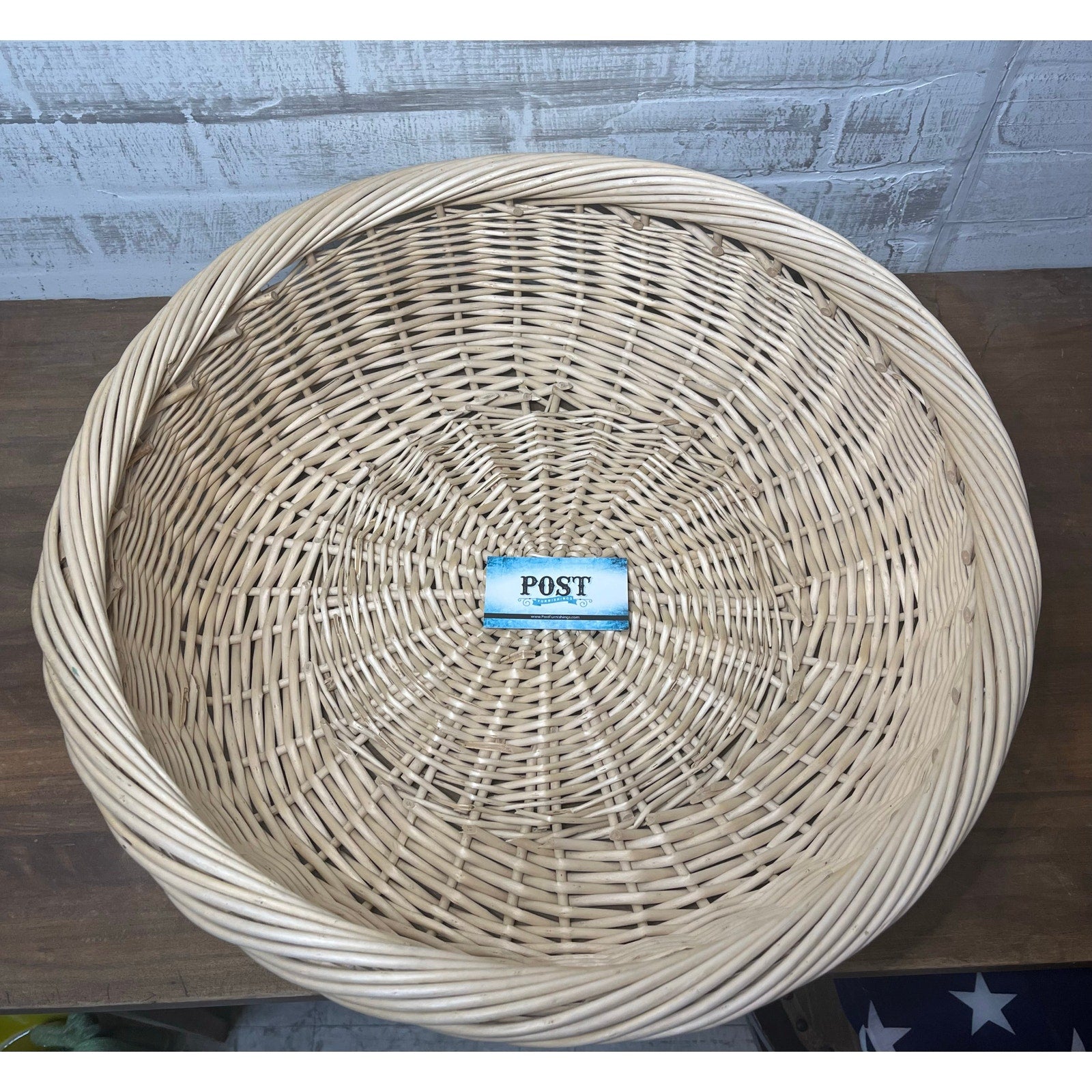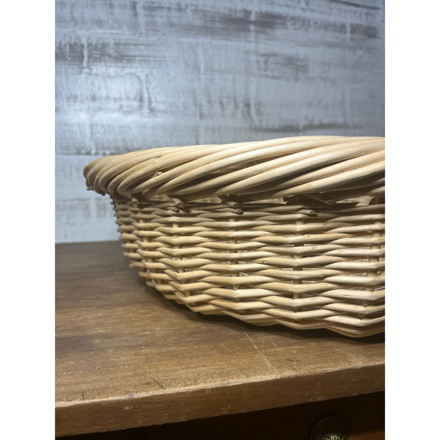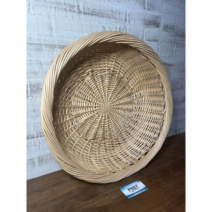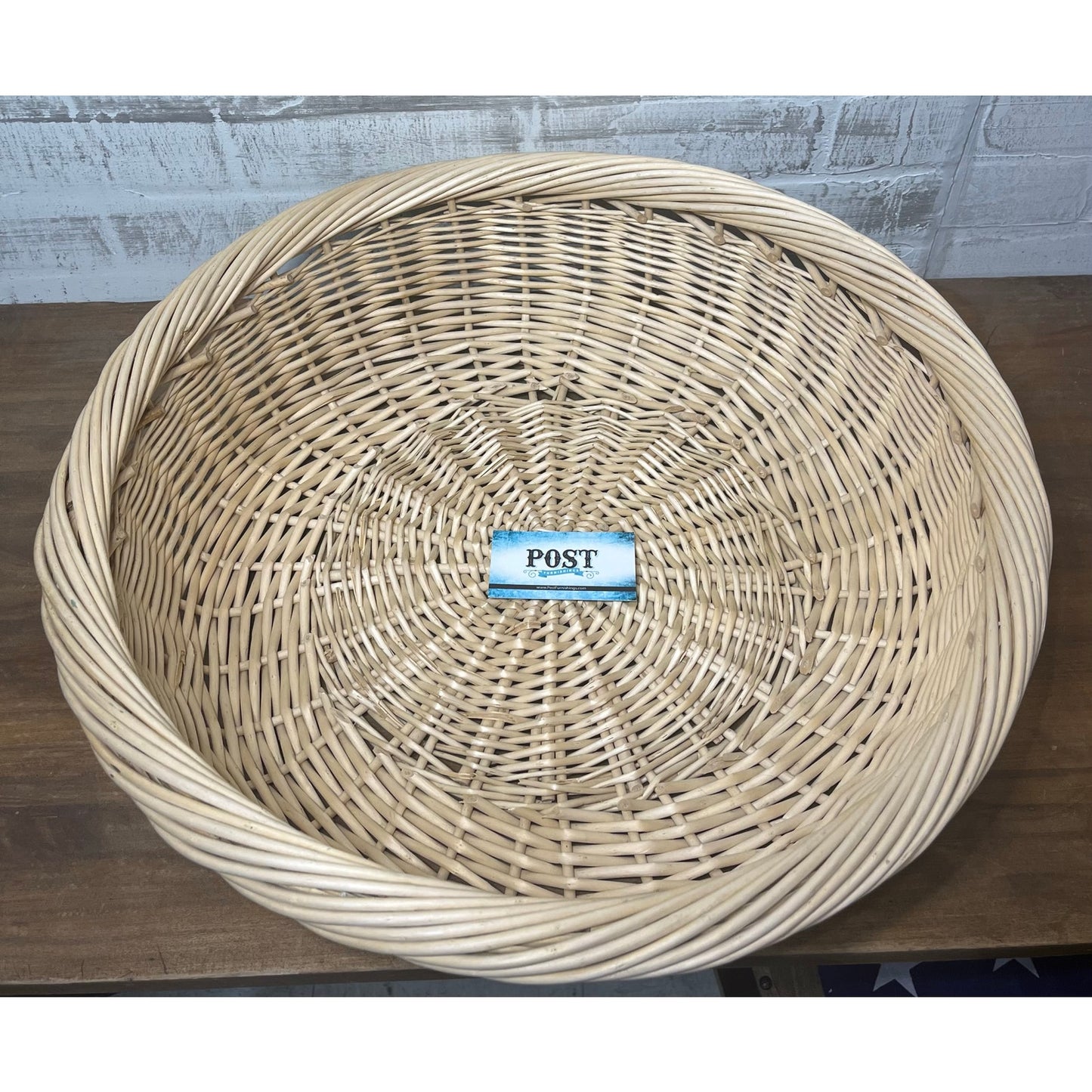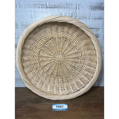 Very large round wicker basket, light color wicker, use as a function basket or wall decor, it is 21” diameter, 6” deep