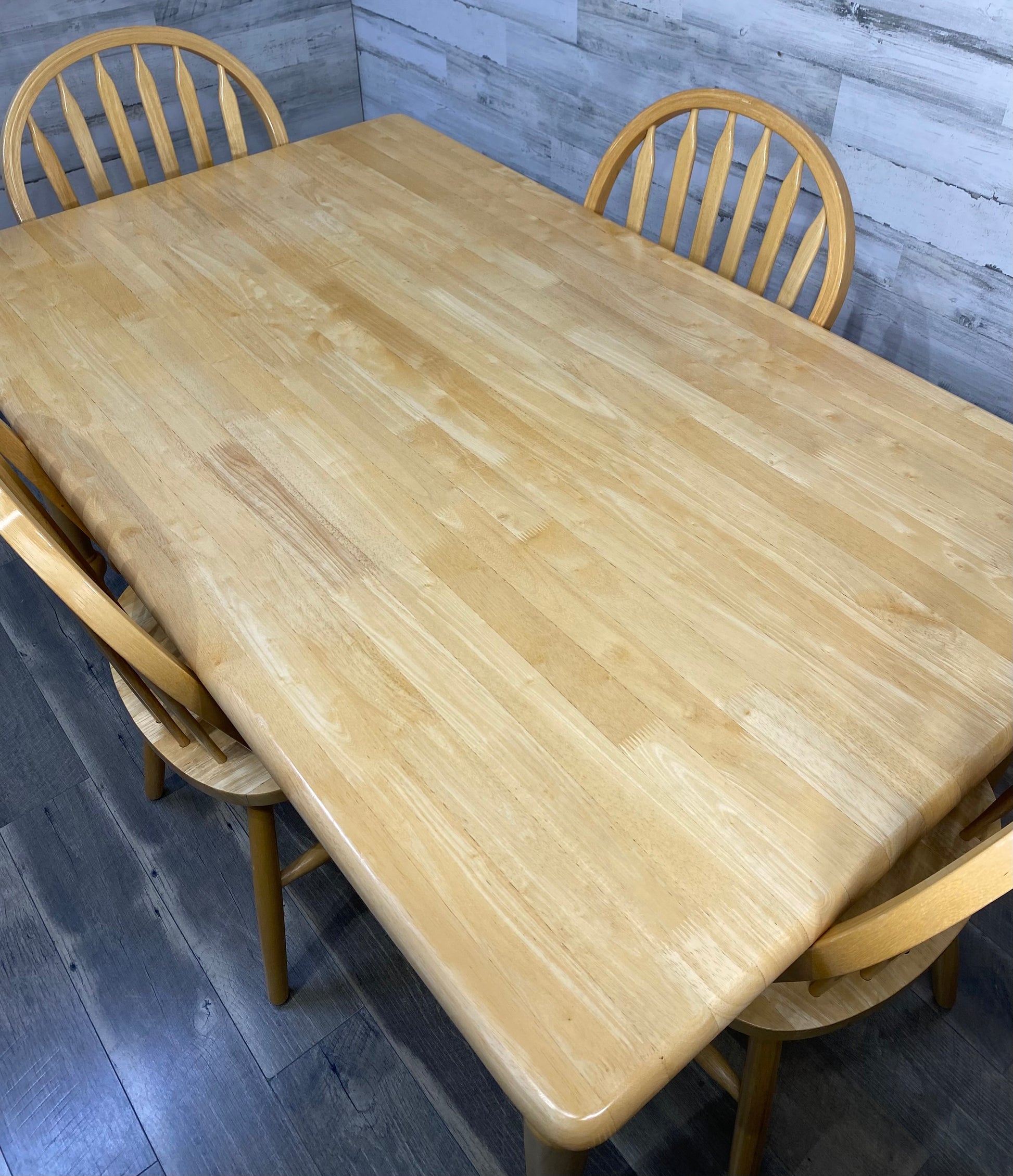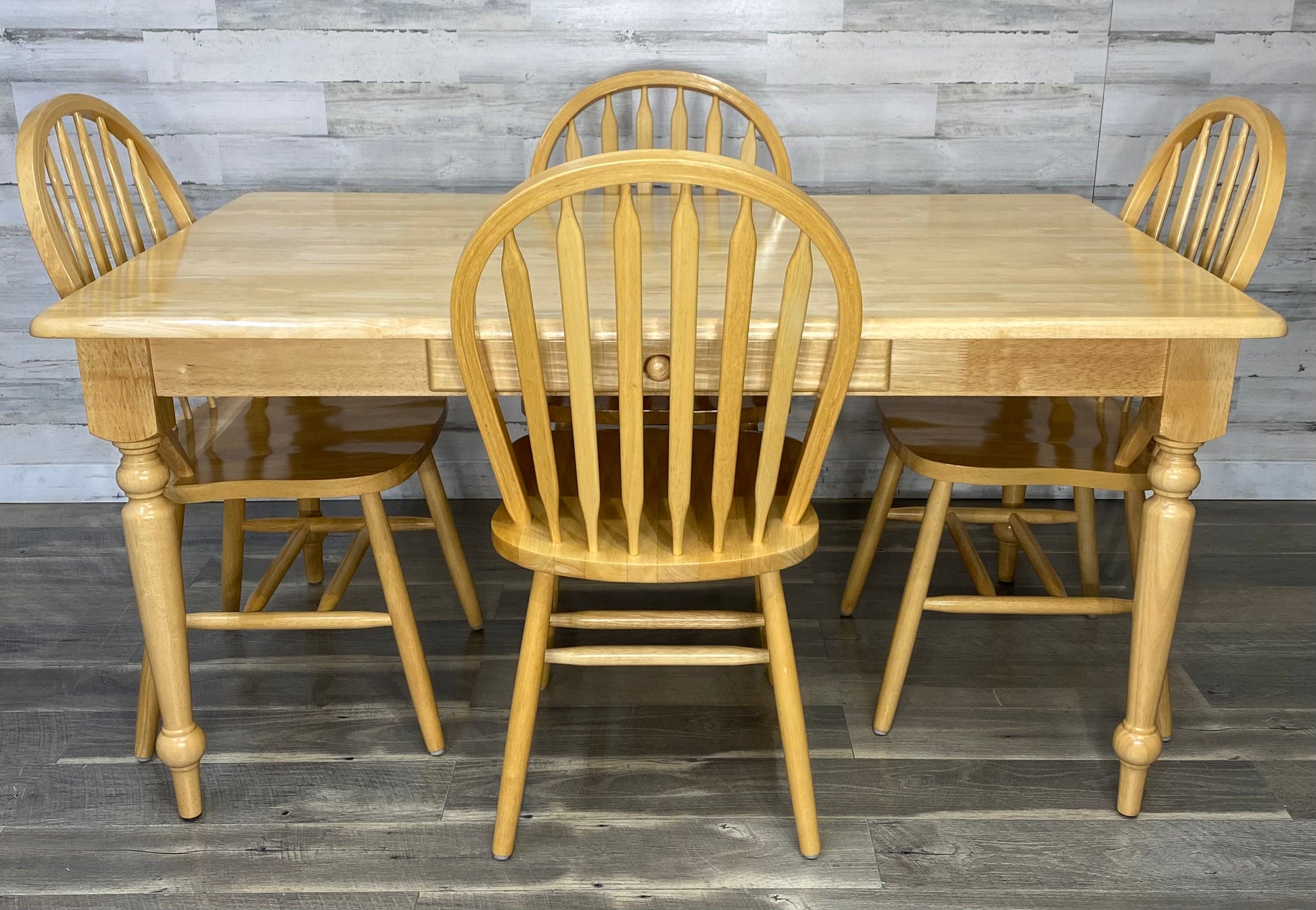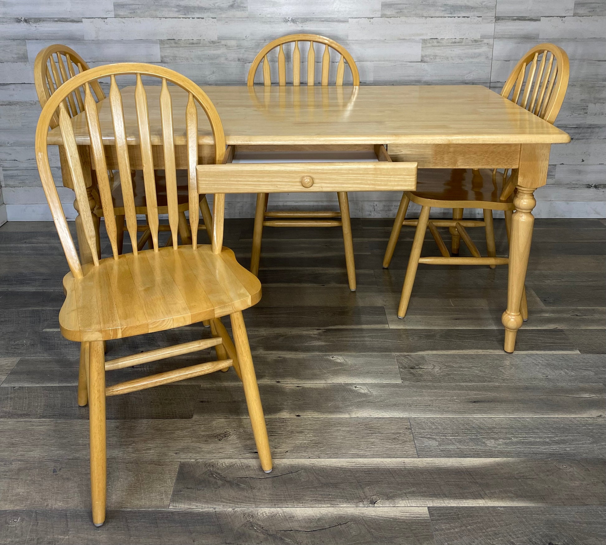 Light color solid wood dining set. Set of 4 chairs with matching table. Table as a storage drawer. Great pre owned condition. Very sturdy.