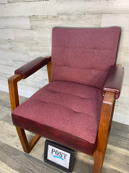 Mid century dark maroon red office chair. Lazaris office seating brand. Minor wear. Very heavy and sturdy. Solid wood frame.