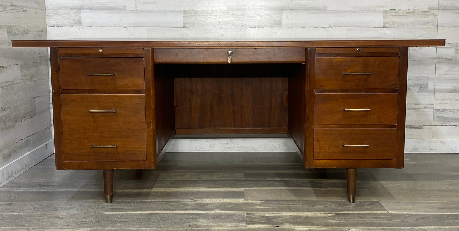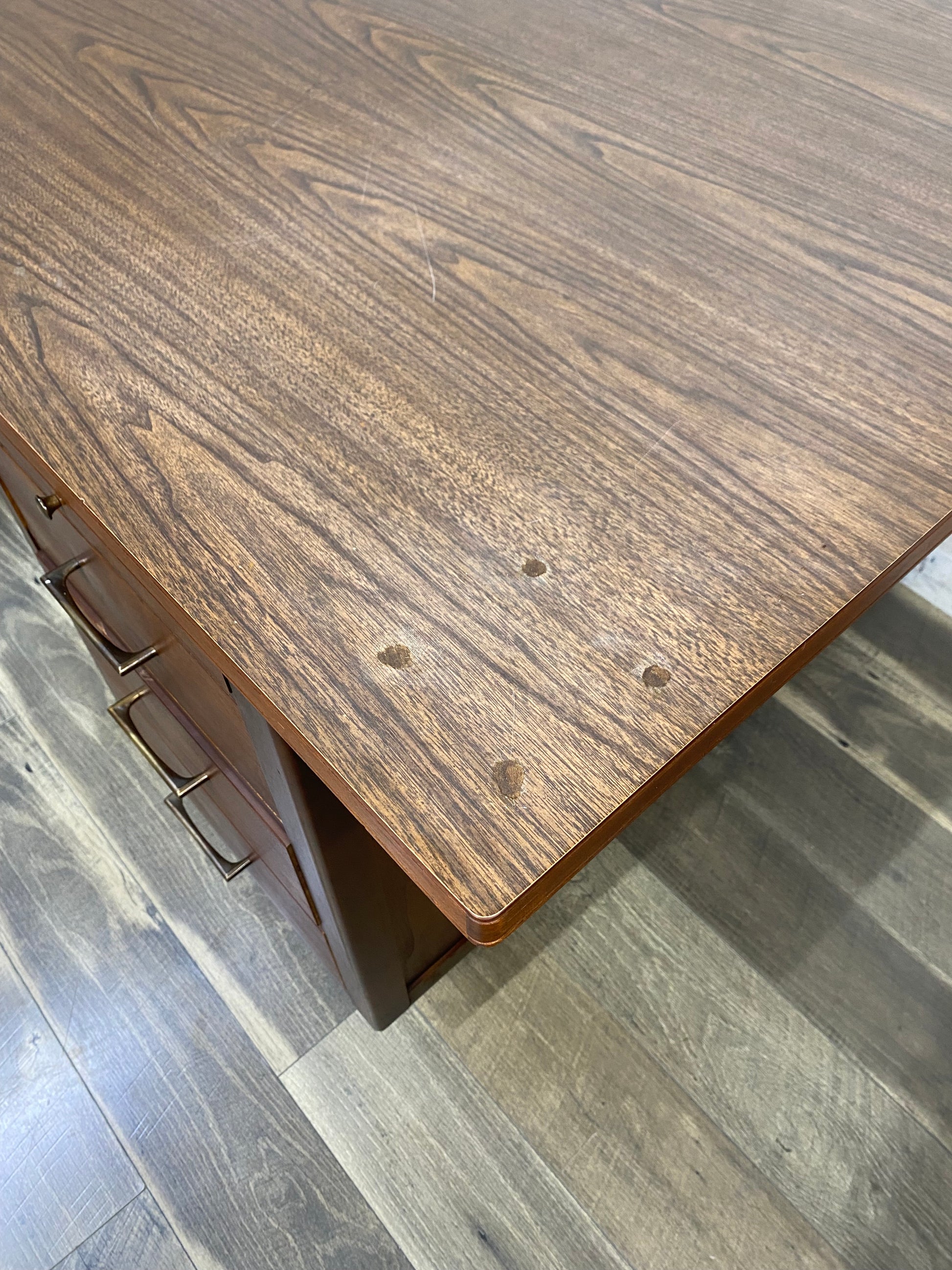 Mid century executive desk. Leopold brand made in USA. Base is solid wood with dovetailed drawers. Top surface is thick and durable Formica. Something was mounted to the top leaving holes they have been repaired but are noticeable- see pics. Comes with key to lock file cabinet and top drawer.