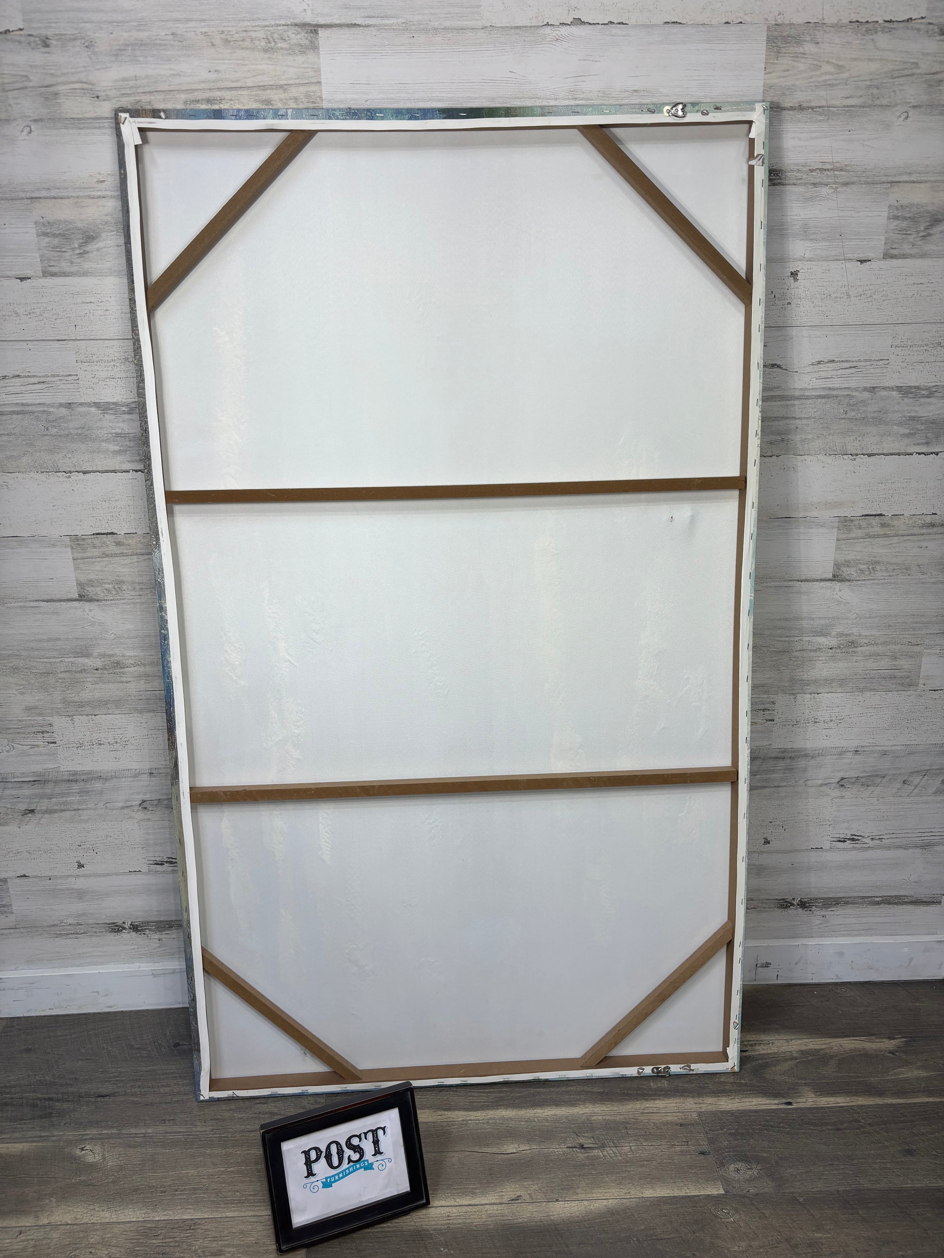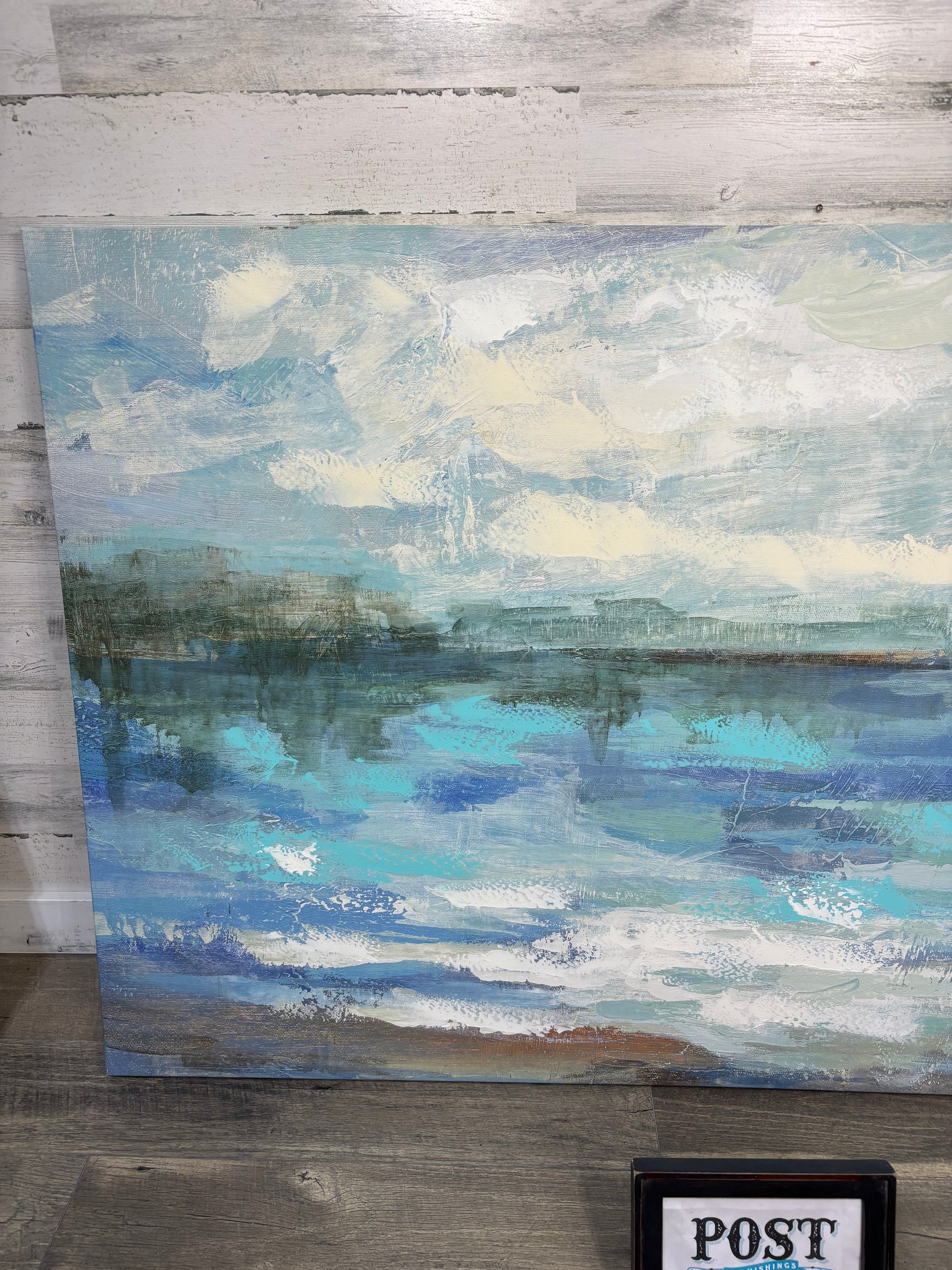 The artwork depicts a serene landscape featuring a sky with abstract, fluffy clouds reflected in a body of water, art by Silvia Vassileve, “Mirrored Sky”, it is 36” by 60”