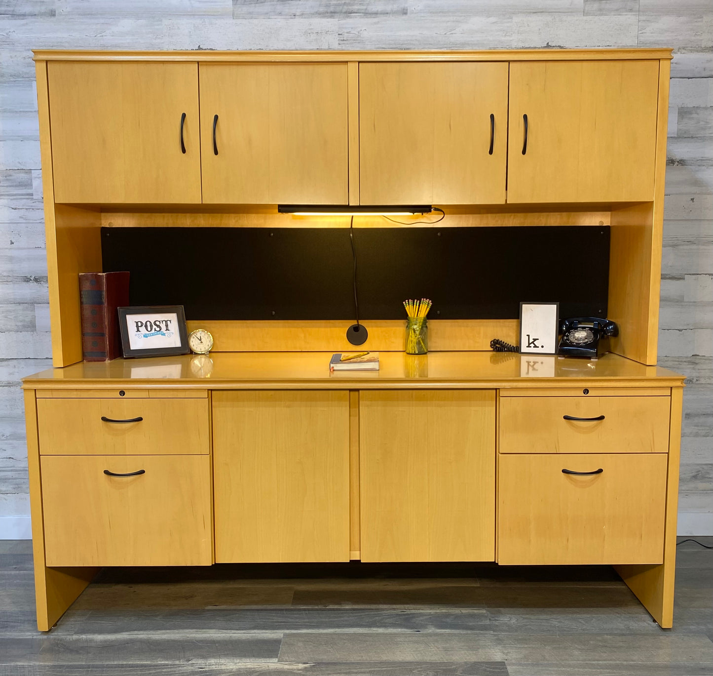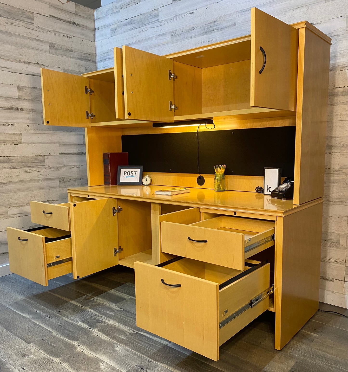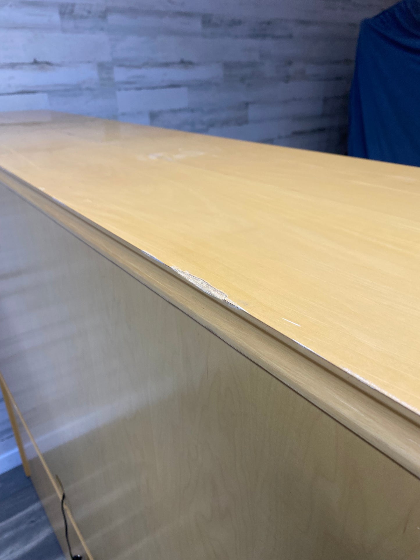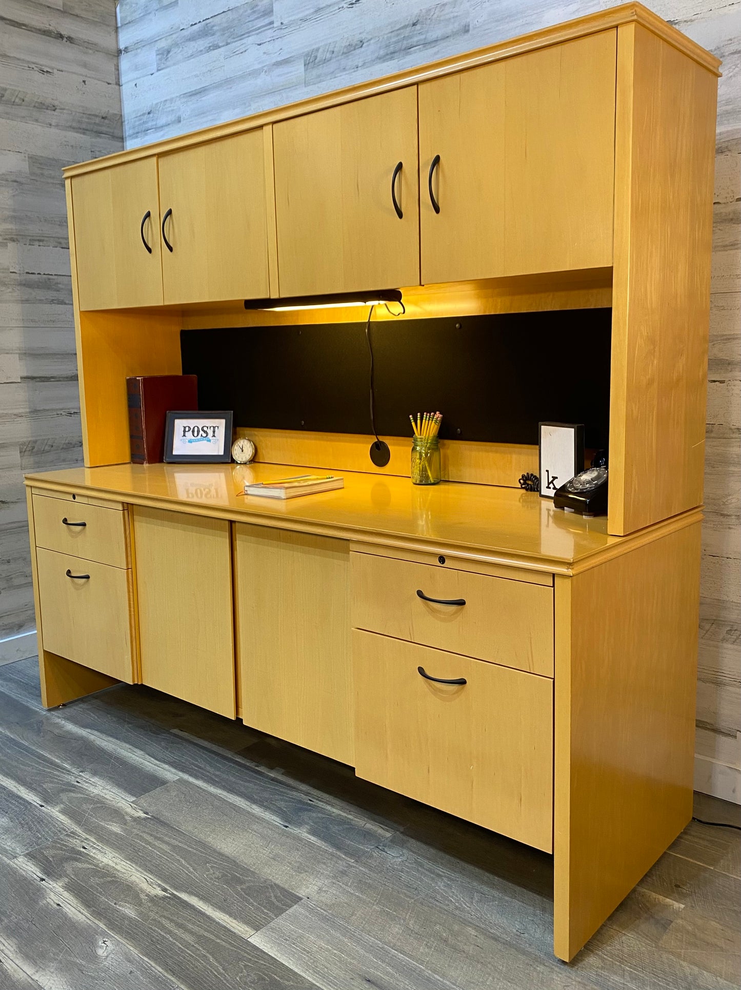 High point furniture brand office desk system. Very modern style light wood with desk light and lots of storage! Comes apart in 2 pieces but very heavy! All drawers glide very smoothly. Has some nicks on edges and a couple scratches. Great pre owned condition overall!
