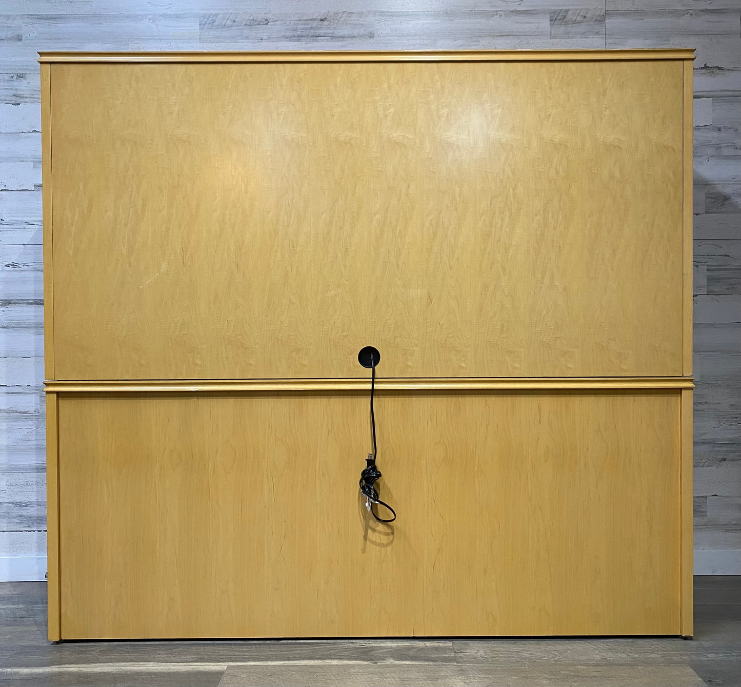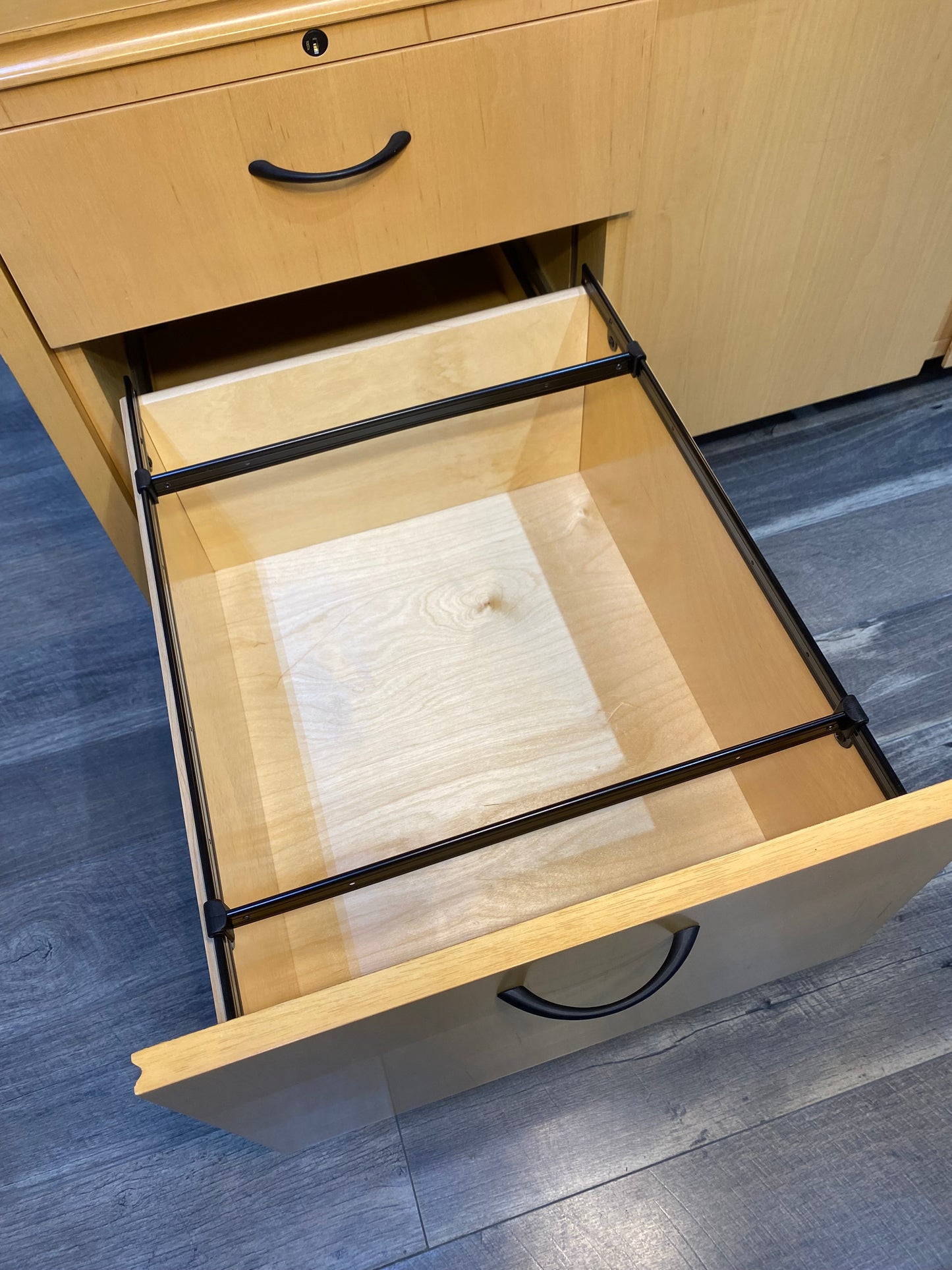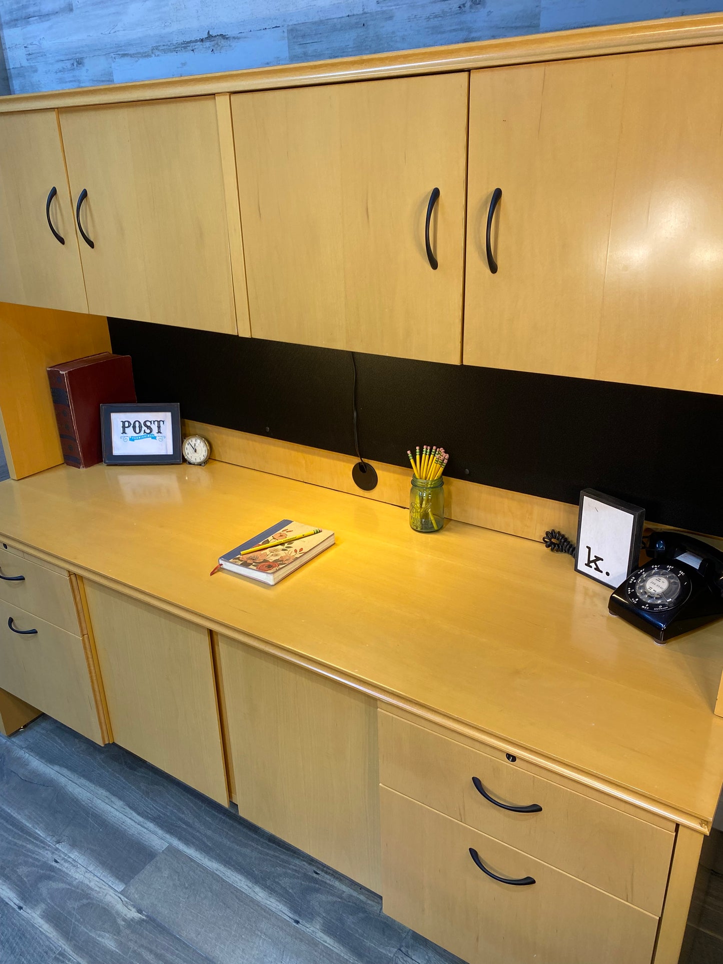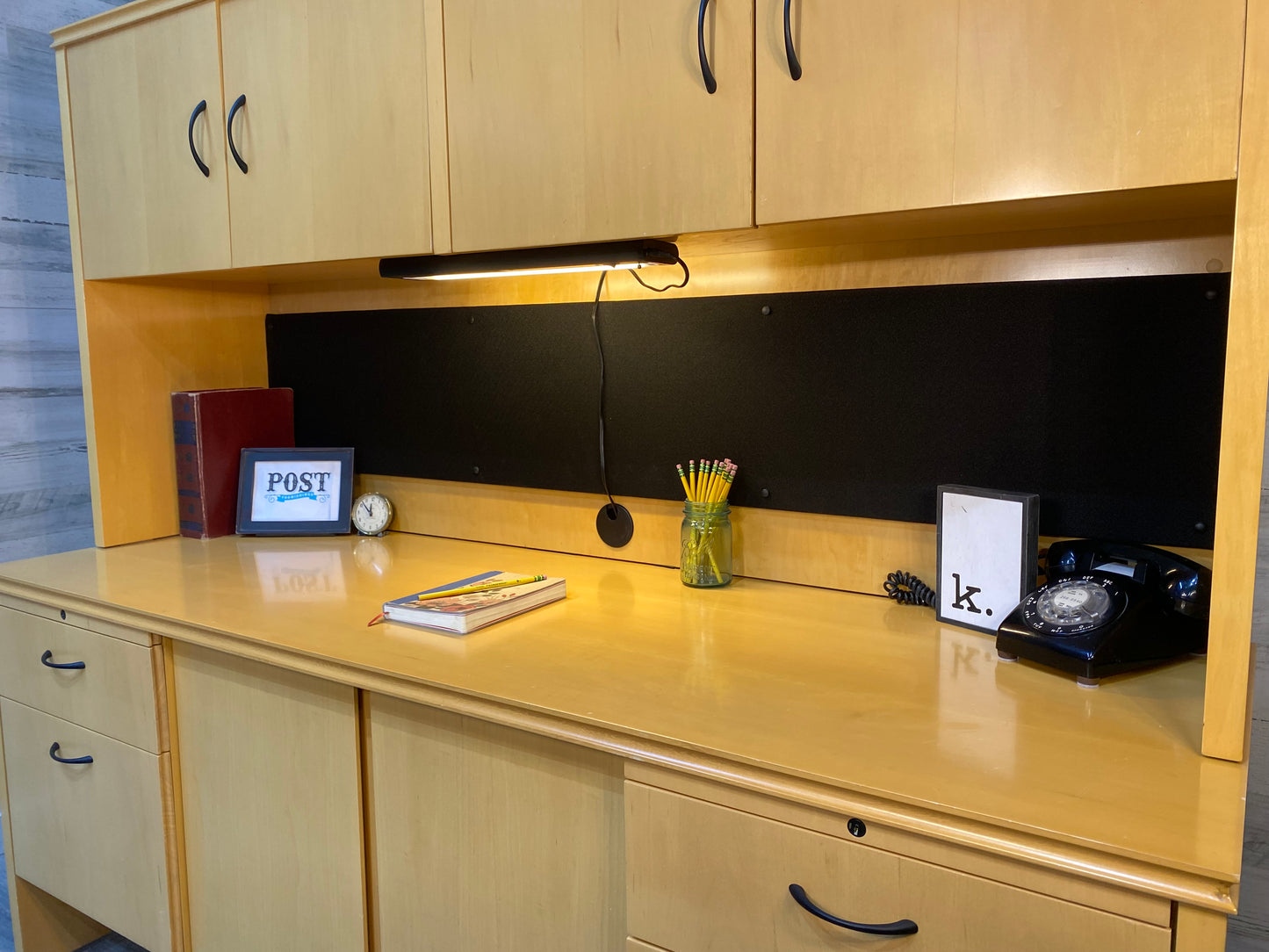 High point furniture brand office desk system. Very modern style light wood with desk light and lots of storage! Comes apart in 2 pieces but very heavy! All drawers glide very smoothly. Has some nicks on edges and a couple scratches. Great pre owned condition overall!