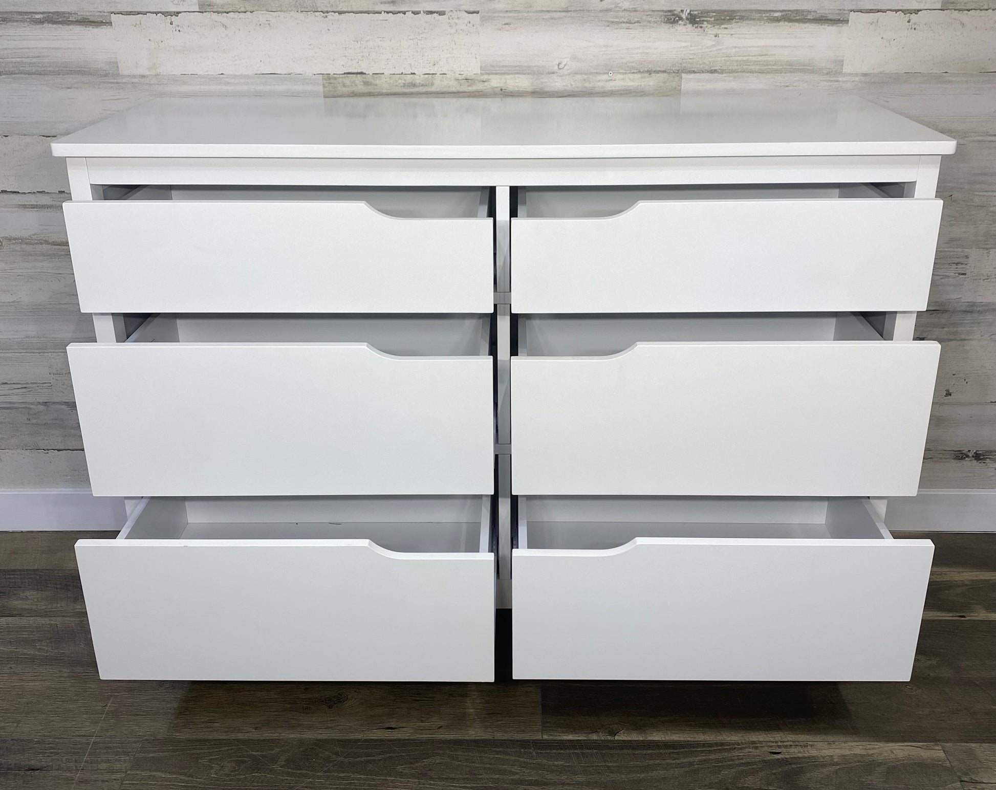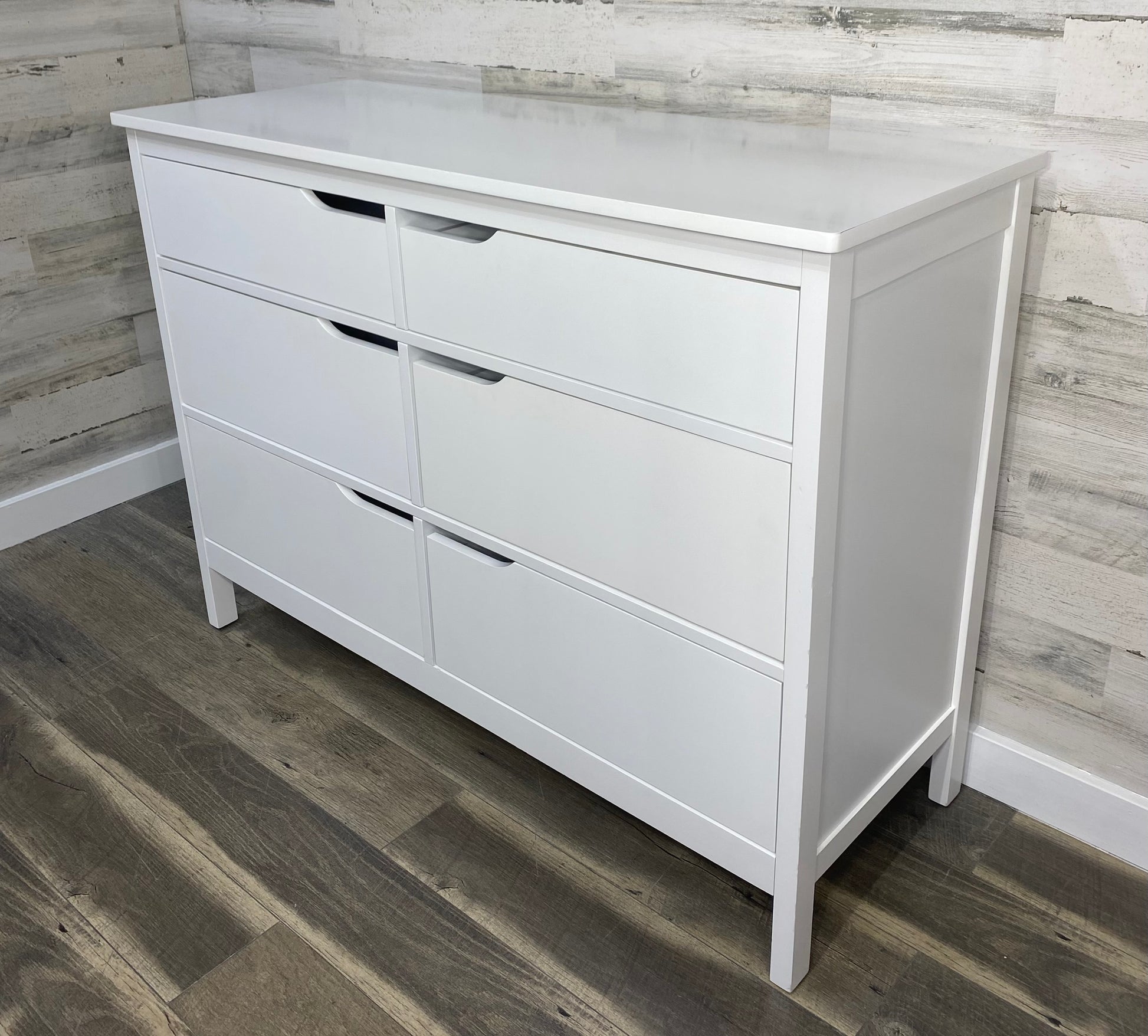 Modern white 6 drawer dresser. Pre owned and has a few scratches. All drawers slide very smoothly on rollers.