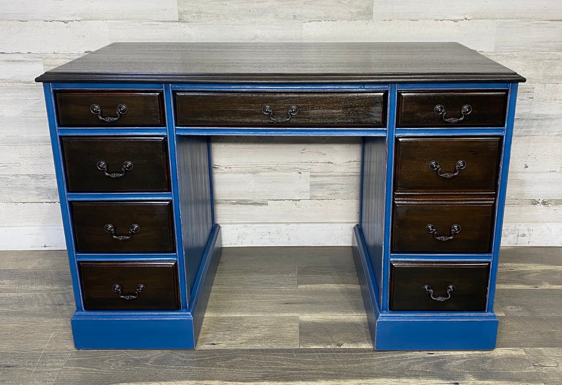 Refinished antique desk. Navy blue with dark espresso stained top & drawer fronts. Very well built with dovetailed ends. All drawers slide smoothly.