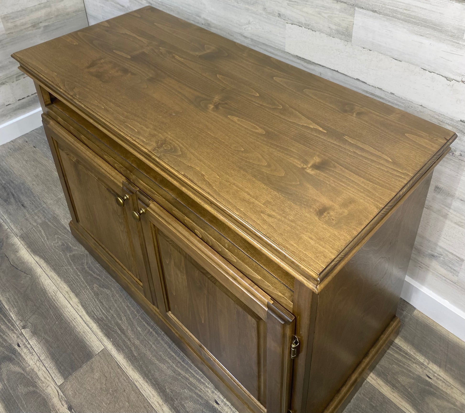 Excellent condition heartland oak storage cabinet. Great for fish tank, tv, or dining room buffet. Inside storage shelves are on very smooth rolling pull out tracks.