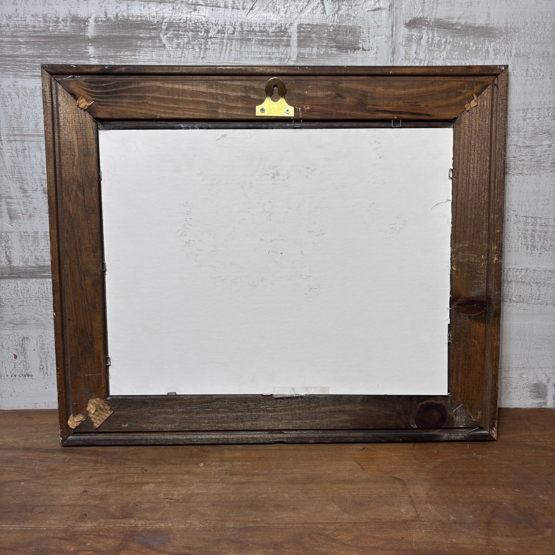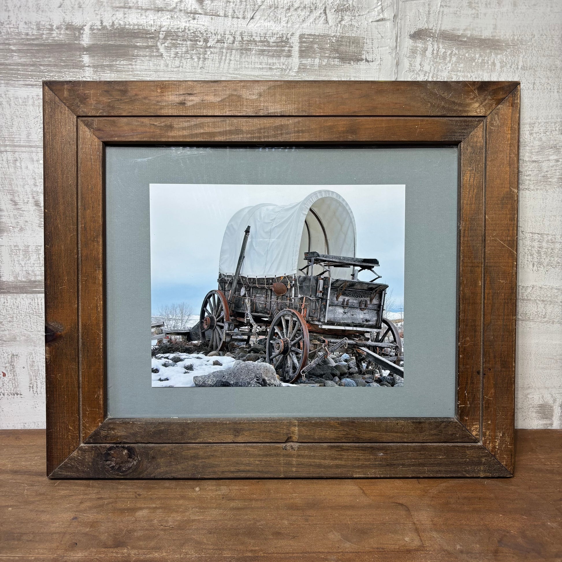 Old western covered wagon picture with a gray background, framed in a rustic wooden frame, 15” by 18”