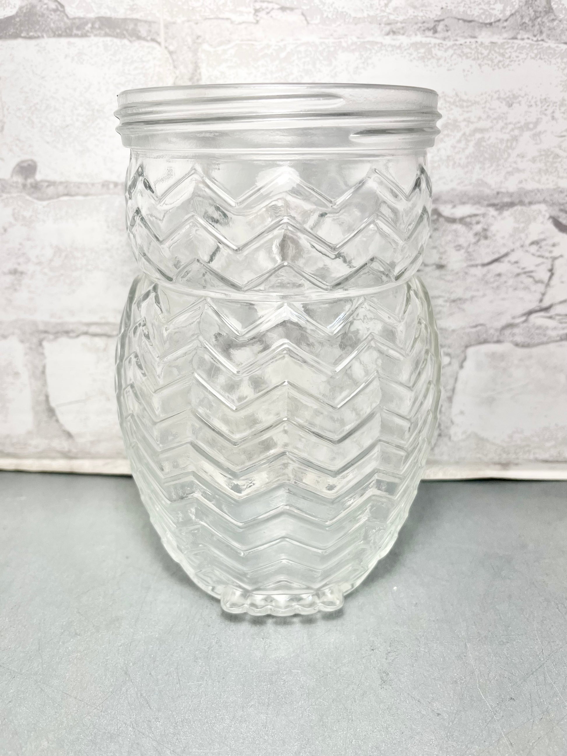 Store your food with this owl glass jar! The lid screws on and off for easy access. Great for storing dry goods, candy, pasta, or whatever you like! The clear glass makes it so you can see your treasures inside while it’s on the counter or shelf! 7” tall, 4.5” wide.